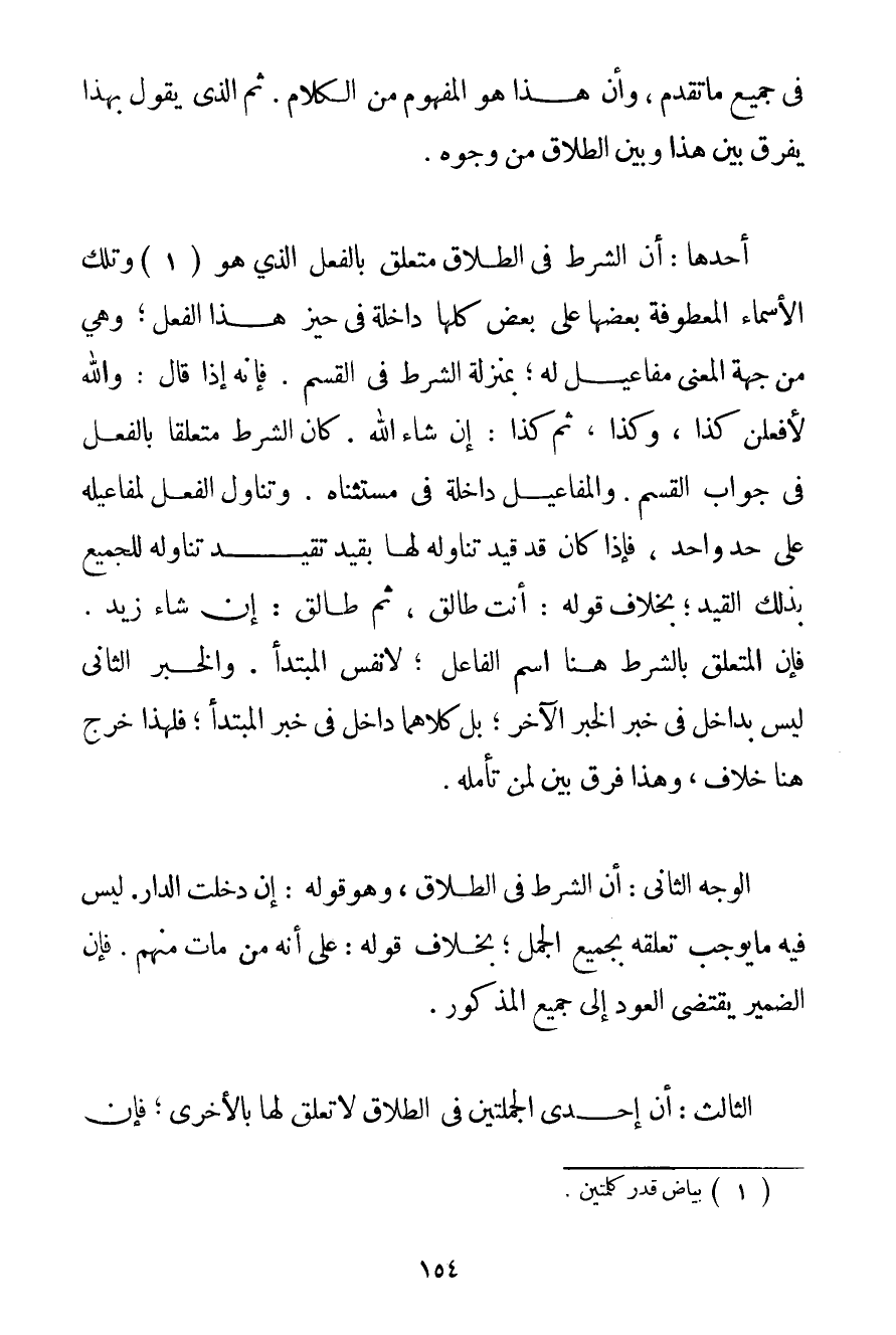 فِي جَمِيعِ مَا تَقَدَّمَ وَأَنَّ هَذَا هُوَ الْمَفْهُومُ مِنْ الْكَلَامِ. ثُمَّ الَّذِي يَقُولُ بِهَذَا يُفَرِّقُ بَيْنَ هَذَا وَبَيْنَ الطَّلَاقِ مِنْ وُجُوهٍ. أَحَدُهَا: أَنَّ الشَّرْطَ فِي الطَّلَاقِ مُتَعَلِّقٌ بِالْفِعْلِ الَّذِي هُوَ (1) وَتِلْكَ الْأَسْمَاءُ الْمَعْطُوفَةُ بَعْضُهَا عَلَى بَعْضٍ كُلُّهَا دَاخِلَةٌ فِي حَيِّزِ هَذَا الْفِعْلِ؛ وَهِيَ مِنْ جِهَةِ الْمَعْنَى مَفَاعِيلُ لَهُ؛ بِمَنْزِلَةِ الشَّرْطِ فِي الْقَسَمِ. فَإِنَّهُ إذَا قَالَ: وَاَللَّهِ لَأَفْلَعَن كَذَا وَكَذَا ثُمَّ كَذَا: إنْ شَاءَ اللَّهُ. كَانَ الشَّرْطُ مُتَعَلِّقًا بِالْفِعْلِ فِي جَوَابِ الْقَسَمِ وَالْمَفَاعِيلُ دَاخِلَةٌ فِي مُسْتَثْنَاهُ. وَتَنَاوُلُ الْفِعْلِ لِمَفَاعِيلِهِ عَلَى حَدٍّ وَاحِدٍ فَإِذَا كَانَ قَدْ قَيَّدَ تَنَاوُلَهُ لَهَا بِقَيْدِ تَقَيَّدَ تَنَاوُلُهُ لِلْجَمِيعِ بِذَلِكَ الْقَيْدِ؛ بِخِلَافِ قَوْلِهِ: أَنْت طَالِقٌ ثُمَّ طَالِقٌ: إنْ شَاءَ زَيْدٌ. فَإِنَّ الْمُتَعَلِّقَ بِالشَّرْطِ هُنَا اسْمُ الْفَاعِلِ؛ لَا نَفْسُ الْمُبْتَدَأِ. وَالْخَبَرُ الثَّانِي لَيْسَ بِدَاخِلِ فِي خَبَرِ الْخَبَرِ الْآخَرِ؛ بَلْ كِلَاهُمَا دَاخِلٌ فِي خَبَرِ الْمُبْتَدَأِ؛ فَلِهَذَا خَرَجَ هُنَا خِلَافٌ وَهَذَا فَرْقٌ بَيِّنٌ لِمَنْ تَأَمَّلَهُ. الْوَجْهُ الثَّانِي: أَنَّ الشَّرْطَ فِي الطَّلَاقِ؛ وَهُوَ قَوْلُهُ: إنْ دَخَلْت الدَّارَ. لَيْسَ فِيهِ مَا يُوجِبُ تَعَلُّقَهُ بِجَمِيعِ الْجُمَلِ؛ بِخِلَافِ قَوْلِهِ: عَلَى أَنَّهُ مَنْ مَاتَ مِنْهُمْ. فَإِنَّ الضَّمِيرَ يَقْتَضِي الْعَوْدَ إلَى جَمِيعِ الْمَذْكُورِ. الثَّالِثُ: أَنَّ إحْدَى الْجُمْلَتَيْنِ فِي الطَّلَاقِ لَا تَعَلُّقَ لَهَا بِالْأُخْرَى؛ فَإِنَّ