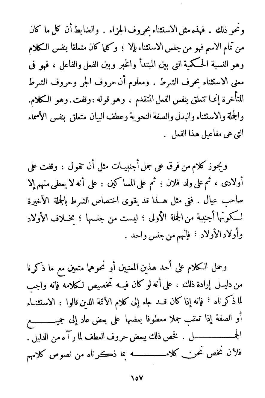 وَنَحْوَ ذَلِكَ. فَهَذِهِ مِثْلُ الِاسْتِثْنَاءِ بِحُرُوفِ الْجَزَاءِ. وَالضَّابِطُ أَنَّ كُلَّ مَا كَانَ مِنْ تَمَامِ الِاسْمِ فَهُوَ مِنْ جِنْسِ الِاسْتِثْنَاءِ بِإِلَّا؛ وَكُلَّمَا كَانَ مُتَعَلِّقًا بِنَفْسِ الْكَلَامِ وَهُوَ النِّسْبَةُ الْحُكْمِيَّةُ الَّتِي بَيْنَ الْمُبْتَدَأِ وَالْخَبَرِ وَبَيْنَ الْفِعْلِ وَالْفَاعِلِ فَهُوَ فِي مَعْنَى الِاسْتِثْنَاءِ بِحَرْفِ الشَّرْطِ. وَمَعْلُومٌ أَنَّ حُرُوفَ الْجَرِّ وَحُرُوفَ الشَّرْطِ الْمُتَأَخِّرَةِ إنَّمَا تَتَعَلَّقُ بِنَفْسِ الْفِعْلِ الْمُتَقَدِّمِ وَهُوَ قَوْلُهُ: وَقَفْت. وَهُوَ الْكَلَامُ. وَالْجُمْلَةُ وَالِاسْتِثْنَاءُ وَالْبَدَلُ وَالصِّفَةُ النَّحْوِيَّةُ وَعَطْفُ الْبَيَانِ مُتَعَلِّقٌ بِنَفْسِ الْأَسْمَاءِ الَّتِي هِيَ مَفَاعِيلُ هَذَا الْفِعْلِ.