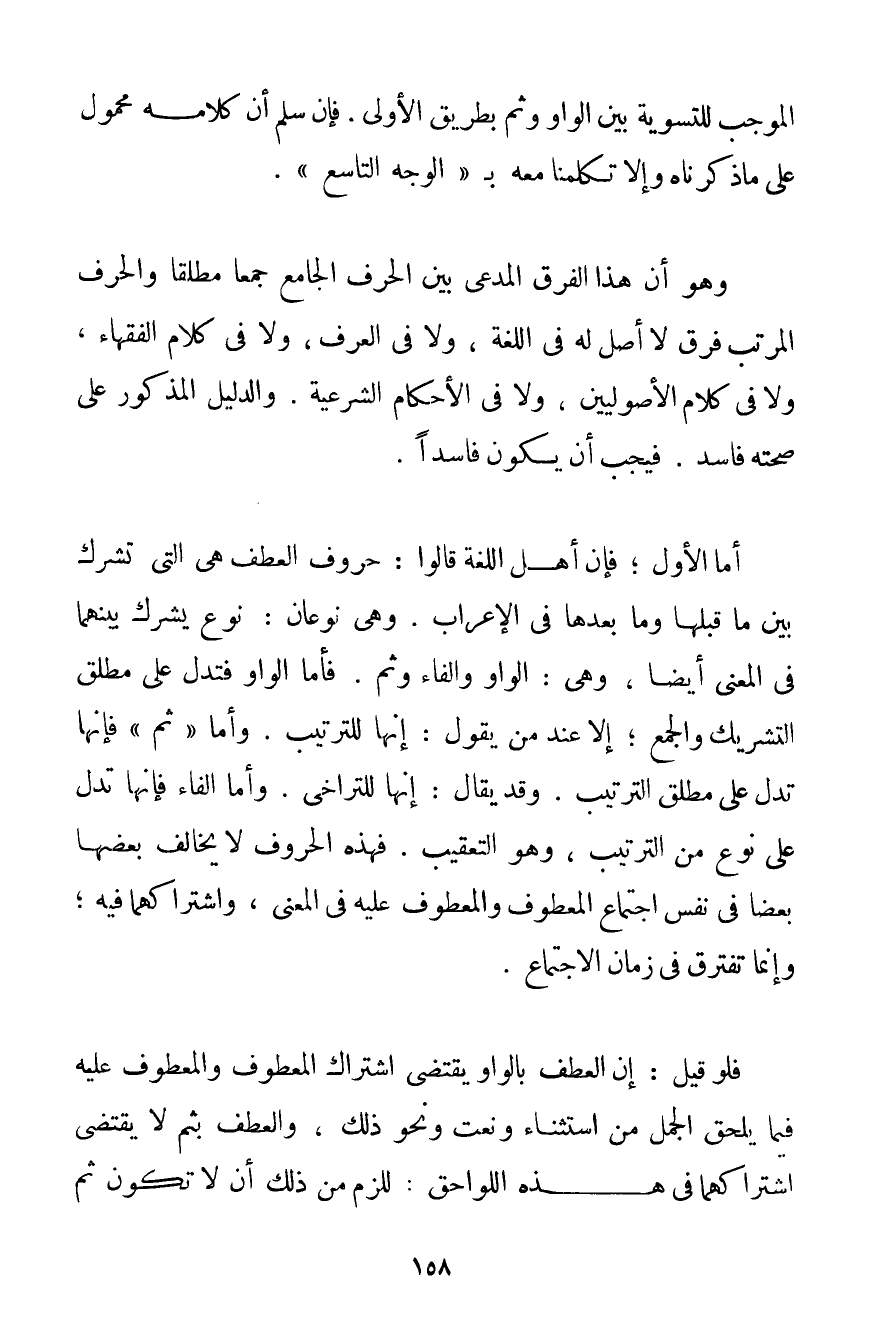 الْمُوجِبِ لِلتَّسْوِيَةِ بَيْنَ الْوَاوِ وَثُمَّ بِطَرِيقِ الْأَوْلَى. فَإِنْ سَلِمَ أَنَّ كَلَامَهُ مَحْمُولٌ عَلَى مَا ذَكَرْنَاهُ وَإِلَّا تَكَلَّمْنَا مَعَهُ بـ الْوَجْهُ التَّاسِعُ: وَهُوَ أَنَّ هَذَا الْفَرْقَ الْمُدَّعَى بَيْنَ الْحَرْفِ الْجَامِعِ جَمْعًا مُطْلَقًا وَالْحَرْفِ الْمُرَتَّبِ فَرْقٌ لَا أَصْلَ لَهُ فِي اللُّغَةِ وَلَا فِي الْعُرْفِ وَلَا فِي كَلَامِ الْفُقَهَاءِ وَلَا فِي كَلَامِ الْأُصُولِيِّينَ وَلَا فِي الْأَحْكَامِ الشَّرْعِيَّةِ. وَالدَّلِيلُ الْمَذْكُورُ عَلَى صِحَّتِهِ فَاسِدٌ. فَيَجِبُ أَنْ يَكُونَ فَاسِدًا. أَمَّا الْأَوَّلُ؛ فَإِنَّ أَهْلَ اللُّغَةِ قَالُوا: حُرُوفُ الْعَطْفِ هِيَ الَّتِي تُشْرِكُ بَيْنَ مَا قَبْلَهَا وَمَا بَعْدَهَا فِي الْإِعْرَابِ. وَهِيَ نَوْعَانِ: نَوْعٌ يُشْرِكُ بَيْنَهُمَا فِي الْمَعْنَى أَيْضًا وَهِيَ: الْوَاوُ وَالْفَاءُ وَثُمَّ. فَأَمَّا الْوَاوُ فَتَدُلُّ عَلَى مُطْلَقِ التَّشْرِيكِ وَالْجَمْعِ؛ إلَّا عِنْدَ مَنْ يَقُولُ: إنَّهَا لِلتَّرْتِيبِ. وَأَمَّا " ثُمَّ " فَإِنَّهَا تَدُلُّ عَلَى مُطْلَقِ التَّرْتِيبِ. وَقَدْ يُقَالُ: إنَّهَا لِلتَّرَاخِي. وَأَمَّا الْفَاءُ فَإِنَّهَا تَدُلُّ عَلَى نَوْعٍ مِنْ التَّرْتِيبِ وَهُوَ التَّعْقِيبُ. فَهَذِهِ الْحُرُوفُ لَا يُخَالِفُ بَعْضُهَا بَعْضًا فِي نَفْسِ اجْتِمَاعِ الْمَعْطُوفِ وَالْمَعْطُوفِ عَلَيْهِ فِي الْمَعْنَى وَاشْتِرَاكِهِمَا فِيهِ؛ وَإِنَّمَا تَفْتَرِقُ فِي زَمَانِ الِاجْتِمَاعِ. فَلَوْ قِيلَ: إنَّ الْعَطْفَ بِالْوَاوِ يَقْتَضِي اشْتِرَاكَ الْمَعْطُوفِ وَالْمَعْطُوفِ عَلَيْهِ فِيمَا يَلْحَقُ الْجُمَلَ مِنْ اسْتِثْنَاءٍ وَنَعْتٍ وَنَحْوِ ذَلِكَ وَالْعَطْفُ بِثُمَّ لَا يَقْتَضِي اشْتِرَاكَهُمَا فِي هَذِهِ اللَّوَاحِقِ: لَلَزِمَ مِنْ ذَلِكَ أَنْ لَا تَكُونَ ثُمَّ
