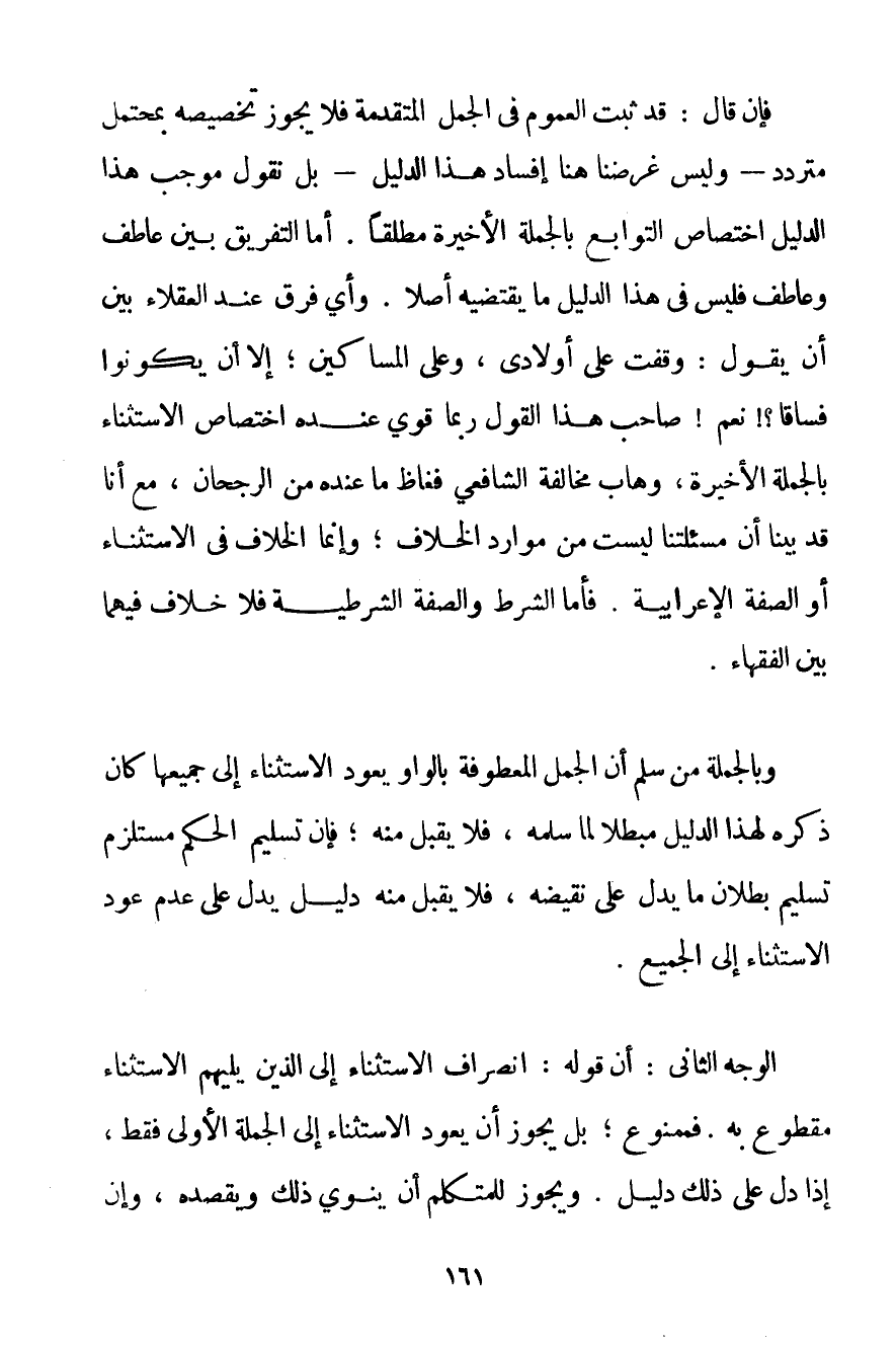 فَإِنْ قَالَ: قَدْ ثَبَتَ الْعُمُومُ فِي الْجُمَلِ الْمُتَقَدِّمَةِ فَلَا يَجُوزُ تَخْصِيصُهُ بِمُحْتَمَلِ مُتَرَدِّدٍ - وَلَيْسَ غَرَضُنَا هُنَا إفْسَادُ هَذَا الدَّلِيلِ - بَلْ نَقُولُ مُوجَبُ هَذَا الدَّلِيلِ اخْتِصَاصُ التَّوَابِعِ بِالْجُمْلَةِ الْأَخِيرَةِ مُطْلَقًا. أَمَّا التَّفْرِيقُ بَيْنَ عَاطِفٍ وَعَاطِفٍ فَلَيْسَ فِي هَذَا الدَّلِيلِ مَا يَقْتَضِيه أَصْلًا. وَأَيُّ فَرْقٍ عِنْدَ الْعُقَلَاءِ بَيْنَ أَنْ يَقُولَ: وَقَفْت عَلَى أَوْلَادِي وَعَلَى الْمَسَاكِينِ إلَّا أَنْ يَكُونُوا فُسَّاقًا نَعَمْ صَاحِبُ هَذَا الْقَوْلِ رُبَّمَا قَوِيَ عِنْدَهُ اخْتِصَاصُ الِاسْتِثْنَاءِ بِالْجُمْلَةِ الْأَخِيرَةِ وَهَابَ مُخَالَفَةَ الشَّافِعِيِّ فَغَاظَ مَا عِنْدَهُ مِنْ الرُّجْحَانِ مَعَ أَنَّا قَدْ بَيَّنَّا أَنَّ مَسْأَلَتَنَا لَيْسَتْ مِنْ مَوَارِدِ الْخِلَافِ؛ وَإِنَّمَا الْخِلَافُ فِي الِاسْتِثْنَاءِ أَوْ الصِّفَةِ الْإِعْرَابِيَّةِ. فَأَمَّا الشَّرْطُ وَالصِّفَةُ الشَّرْطِيَّةُ فَلَا خِلَافَ فِيهِمَا بَيْنَ الْفُقَهَاءِ. وَبِالْجُمْلَةِ مَنْ سَلَّمَ أَنَّ الْجُمَلَ الْمَعْطُوفَةَ بِالْوَاوِ يَعُودُ الِاسْتِثْنَاءُ إلَى جَمِيعِهَا كَانَ ذِكْرُهُ لِهَذَا الدَّلِيلِ مُبْطِلًا لِمَا سَلَّمَهُ فَلَا يُقْبَلُ مِنْهُ؛ فَإِنَّ تَسْلِيمَ الْحُكْمِ مُسْتَلْزِمٌ تَسْلِيمَ بُطْلَانِ مَا يَدُلُّ عَلَى نَقِيضِهِ فَلَا يُقْبَلُ مِنْهُ دَلِيلٌ يَدُلُّ عَلَى عَدَمِ عَوْدِ الِاسْتِثْنَاءِ إلَى الْجَمِيعِ. الْوَجْهُ الثَّانِي: أَنَّ قَوْلَهُ: انْصِرَافُ الِاسْتِثْنَاءِ إلَى الَّذِينَ يَلِيهِمْ الِاسْتِثْنَاءُ مَقْطُوعٌ بِهِ. فَمَمْنُوعٌ بَلْ يَجُوزُ أَنْ يَعُودَ الِاسْتِثْنَاءُ إلَى الْجُمْلَةِ الْأُولَى فَقَطْ إذَا دَلَّ عَلَى ذَلِكَ دَلِيلٌ. وَيَجُوزُ لِلْمُتَكَلِّمِ أَنْ يَنْوِيَ ذَلِكَ وَيَقْصِدَهُ وَإِنْ