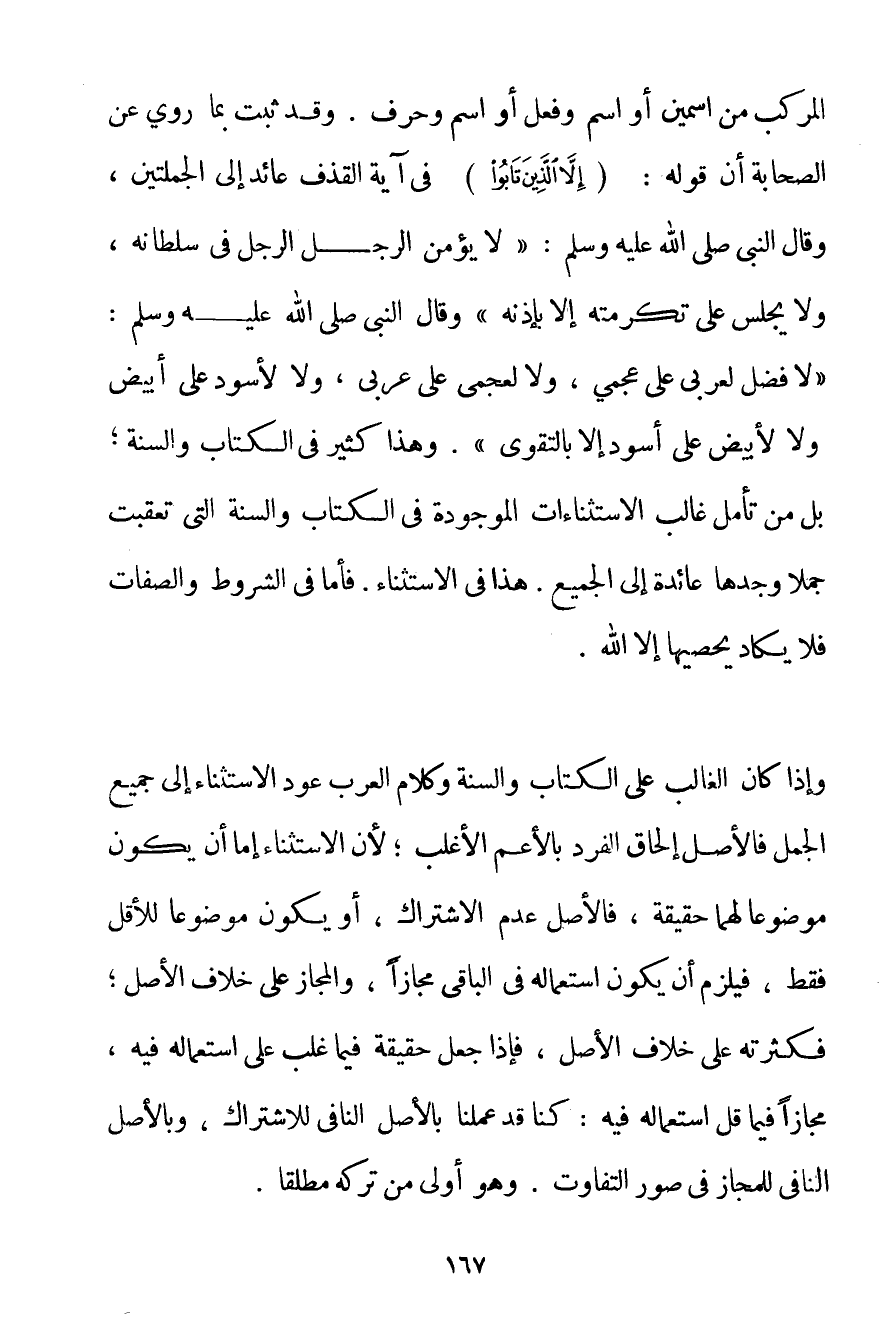 الْمُرَكَّبُ مِنْ اسْمَيْنِ أَوْ اسْمٍ وَفِعْلٍ أَوْ اسْمٍ وَحَرْفٍ. وَقَدْ ثَبَتَ بِمَا رُوِيَ عَنْ الصَّحَابَةِ أَنَّ قَوْلَهُ: {إلَّا الَّذِينَ تَابُوا} فِي آيَةِ الْقَذْفِ عَائِدٌ إلَى الْجُمْلَتَيْنِ وَقَالَ النَّبِيُّ صَلَّى اللَّهُ عَلَيْهِ وَسَلَّمَ {لَا يَؤُمَّن الرَّجُلُ الرَّجُلَ فِي سُلْطَانِهِ وَلَا يَجْلِسُ عَلَى تَكْرِمَتِهِ إلَّا بِإِذْنِهِ} وَقَالَ النَّبِيُّ صَلَّى اللَّهُ عَلَيْهِ وَسَلَّمَ {لَا فَضْلَ لِعَرَبِيٍّ عَلَى عَجَمِيٍّ وَلَا لِعَجَمِيِّ عَلَى عَرَبِيٍّ وَلَا لِأَسْوَدَ عَلَى أَبْيَضَ وَلَا لِأَبْيَضَ عَلَى أُسُودَ إلَّا بِالتَّقْوَى} . وَهَذَا كَثِيرٌ فِي الْكِتَابِ وَالسُّنَّةِ؛ بَلْ مَنْ تَأَمَّلَ غَالِبَ الِاسْتِثْنَاءَاتِ الْمَوْجُودَةِ فِي الْكِتَابِ وَالسُّنَّةِ الَّتِي تَعَقَّبَتْ جُمَلًا وَجَدَهَا عَائِدَةً إلَى الْجَمِيعِ. هَذَا فِي الِاسْتِثْنَاءِ. فَأَمَّا فِي الشُّرُوطِ وَالصِّفَاتِ فَلَا يَكَادُ يُحْصِيهَا إلَّا اللَّهُ. وَإِذَا كَانَ الْغَالِبُ عَلَى الْكِتَابِ وَالسُّنَّةِ وَكَلَامِ الْعَرَبِ عَوْدُ الِاسْتِثْنَاءِ إلَى جَمِيعِ الْجُمَلِ فَالْأَصْلُ إلْحَاقُ الْفَرْدِ بِالْأَعَمِّ الْأَغْلَبِ؛ لِأَنَّ الِاسْتِثْنَاءَ إمَّا أَنْ يَكُونَ مَوْضُوعًا لَهُمَا حَقِيقَةً فَالْأَصْلُ عَدَمُ الِاشْتِرَاكِ أَوْ يَكُونُ مَوْضُوعًا لِلْأَقَلِّ فَقَطْ فَيَلْزَمُ أَنْ يَكُونَ اسْتِعْمَالُهُ فِي الْبَاقِي مَجَازًا وَالْمَجَازُ عَلَى خِلَافِ الْأَصْلِ؛ فَكَثْرَتُهُ عَلَى خِلَافِ الْأَصْلِ فَإِذَا جُعِلَ حَقِيقَةً فِيمَا غَلَبَ عَلَى اسْتِعْمَالِهِ فِيهِ مَجَازًا فِيمَا قَلَّ اسْتِعْمَالُهُ فِيهِ: كُنَّا قَدْ عَمِلْنَا بِالْأَصْلِ النَّافِي لِلِاشْتِرَاكِ وَبِالْأَصْلِ النَّافِي لِلْمَجَازِ فِي صُوَرِ التَّفَاوُتِ. وَهُوَ أَوْلَى مِنْ تَرْكِهِ مُطْلَقًا.