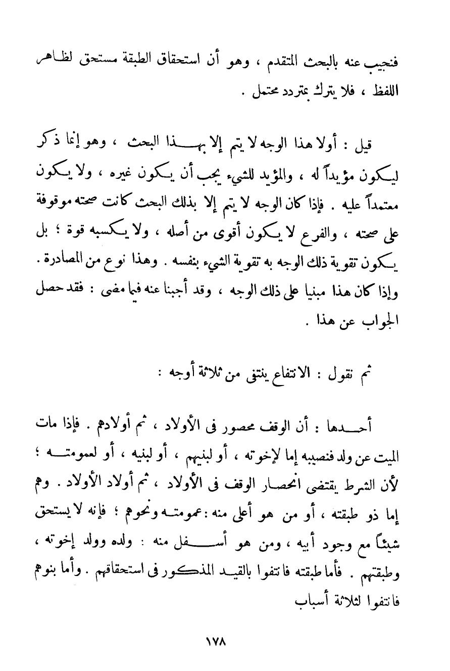 فَنُجِيبُ عَنْهُ بِالْبَحْثِ الْمُتَقَدِّمِ وَهُوَ أَنَّ اسْتِحْقَاقَ الطَّبَقَةِ مُسْتَحَقٌّ لِظَاهِرِ اللَّفْظِ فَلَا يُتْرَكُ بِمُتَرَدِّدِ مُحْتَمَلٍ. قِيلَ: أَوَّلًا هَذَا الْوَجْهُ لَا يَتِمُّ إلَّا بِهَذَا الْبَحْثِ وَهُوَ إنَّمَا ذَكَرَ لِيَكُونَ مُؤَيِّدًا لَهُ وَالْمُؤَيِّدُ لِلشَّيْءِ يَجِبُ أَنْ يَكُونَ غَيْرَهُ وَلَا يَكُونُ مُعْتَمِدًا عَلَيْهِ. فَإِذَا كَانَ الْوَجْهُ لَا يَتِمُّ إلَّا بِذَلِكَ الْبَحْثِ كَانَتْ صِحَّتُهُ مَوْقُوفَةً عَلَى صِحَّتِهِ وَالْفَرْعُ لَا يَكُونُ أَقْوَى مِنْ أَصْلِهِ وَلَا يُكْسِبُهُ قُوَّةً؛ بَلْ يَكُونُ تَقْوِيَةُ ذَلِكَ الْوَجْهِ بِهِ تَقْوِيَةَ الشَّيْءِ بِنَفْسِهِ. وَهَذَا نَوْعٌ مِنْ الْمُصَادَرَةِ. وَإِذَا كَانَ هَذَا مَبْنِيًّا عَلَى ذَلِكَ الْوَجْهِ وَقَدْ أَجَبْنَا عَنْهُ فِيمَا مَضَى: فَقَدْ حَصَلَ الْجَوَابُ عَنْ هَذَا. ثُمَّ نَقُولُ: الِانْتِفَاعُ يَنْتَفِي مِنْ ثَلَاثَةِ أَوْجُهٍ: أَحَدُهَا: أَنَّ الْوَقْفَ مَحْصُورٌ فِي الْأَوْلَادِ ثُمَّ أَوْلَادِهِمْ. فَإِذَا مَاتَ الْمَيِّتُ عَنْ وَلَدٍ فَنَصِيبُهُ إمَّا لِإِخْوَتِهِ أَوْ لِبَنِيهِمْ أَوْ لِبَنِيهِ أَوْ لِعُمُومَتِهِ؛ لِأَنَّ الشَّرْطَ يَقْتَضِي انْحِصَارَ الْوَقْفِ فِي الْأَوْلَادِ ثُمَّ أَوْلَادِ الْأَوْلَادِ. وَهُمْ إمَّا ذُو طَبَقَتِهِ أَوْ مَنْ هُوَ أَعْلَى مِنْهُ: عُمُومَتُهُ وَنَحْوُهُمْ؛ فَإِنَّهُ لَا يَسْتَحِقُّ شَيْئًا مَعَ وُجُودِ أَبِيهِ وَمَنْ هُوَ أَسْفَلَ مِنْهُ: وَلَدُهُ وَوَلَدُ إخْوَتِهِ وَطَبَقَتُهُمْ. فَأَمَّا طَبَقَتُهُ فَانْتَفَوْا بِالْقَيْدِ الْمَذْكُورِ فِي اسْتِحْقَاقِهِمْ. وَأَمَّا بَنُوهُمْ فَانْتَفَوْا لِثَلَاثَةِ