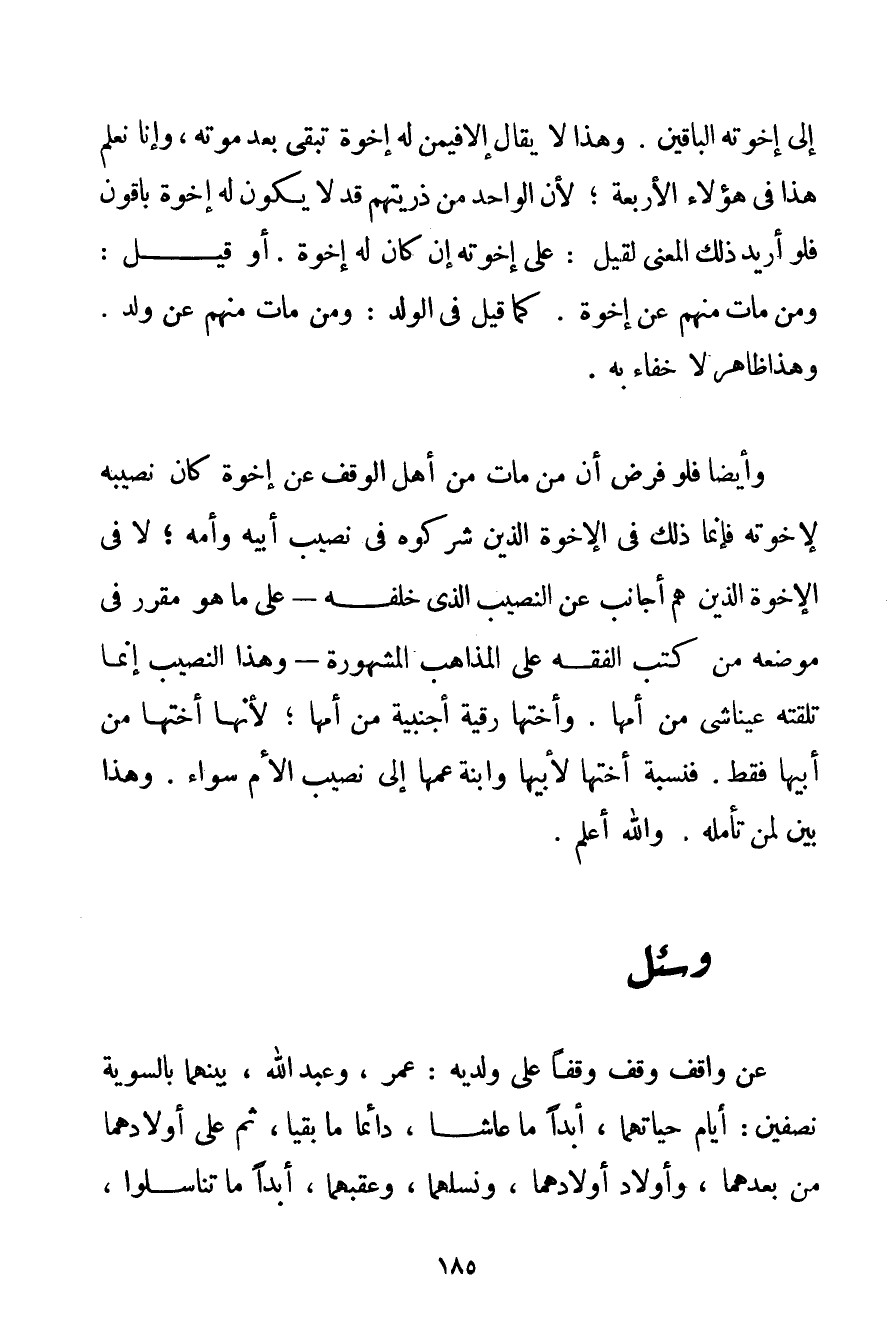إلَى إخْوَتِهِ الْبَاقِينَ. وَهَذَا لَا يُقَالُ إلَّا فِيمَنْ لَهُ إخْوَةٌ تَبْقَى بَعْدَ مَوْتِهِ وَإِنَّا نَعْلَمُ هَذَا فِي هَؤُلَاءِ الْأَرْبَعَةِ؛ لِأَنَّ الْوَاحِدَ مِنْ ذُرِّيَّتِهِمْ قَدْ لَا يَكُونُ لَهُ إخْوَةٌ بَاقُونَ فَلَوْ أُرِيدَ بِذَلِكَ الْمَعْنَى لَقِيلَ: عَلَى إخْوَتِهِ إنْ كَانَ لَهُ إخْوَةٌ. أَوْ قِيلَ: وَمَنْ مَاتَ مِنْهُمْ عَنْ إخْوَةٍ. كَمَا قِيلَ فِي الْوَلَدِ: وَمَنْ مَاتَ مِنْهُمْ عَنْ وَلَدٍ. وَهَذَا ظَاهِرٌ لَا خَفَاءَ بِهِ. وَأَيْضًا فَلَوْ فُرِضَ أَنَّ مَنْ مَاتَ مِنْ أَهْلِ الْوَقْفِ عَنْ إخْوَةٍ كَانَ نَصِيبُهُ لِإِخْوَتِهِ فَإِنَّمَا ذَلِكَ فِي الْإِخْوَةِ الَّذِينَ شَرِكُوهُ فِي نَصِيبِ أَبِيهِ وَأُمِّهِ؛ لَا فِي الْإِخْوَةِ الَّذِينَ هُمْ أَجَانِبُ عَنْ النَّصِيبِ الَّذِي خَلَقَهُ - عَلَى مَا هُوَ مُقَرَّرٌ فِي مَوْضِعِهِ مِنْ كُتُبِ الْفِقْهِ عَلَى الْمَذَاهِبِ الْمَشْهُورَةِ - وَهَذَا النَّصِيبُ إنَّمَا تَلَقَّتْهُ عيناشي مِنْ أُمِّهَا. وَأُخْتُهَا رُقَيَّةُ أَجْنَبِيَّةٌ مِنْ أُمِّهَا؛ لِأَنَّهَا أُخْتُهَا مِنْ أَبِيهَا فَقَطْ. فَنِسْبَةُ أُخْتِهَا لِأَبِيهَا وَابْنَةُ عَمِّهَا إلَى نَصِيبِ الْأُمِّ سَوَاءٌ. وَهَذَا بَيِّنٌ لِمَنْ تَأَمَّلَهُ وَاَللَّهُ أَعْلَمُ.