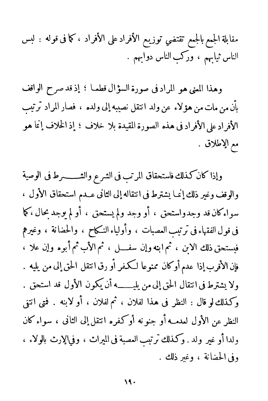 مُقَابَلَةُ الْجَمْعِ بِالْجَمْعِ تَقْتَضِي تَوْزِيعَ الْأَفْرَادِ عَلَى الْأَفْرَادِ كَمَا فِي قَوْلِهِ: لَبِسَ النَّاسُ ثِيَابَهُمْ وَرَكِبَ النَّاسُ دَوَابَّهُمْ. وَهَذَا الْمَعْنَى هُوَ الْمُرَادُ فِي صُورَةِ السُّؤَالِ قَطْعًا؛ إذْ قَدْ صَرَّحَ الْوَاقِفُ بِأَنَّ مَنْ مَاتَ مِنْ هَؤُلَاءِ عَنْ وَلَدٍ انْتَقَلَ نَصِيبُهُ إلَى وَلَدِهِ فَصَارَ الْمُرَادُ تَرْتِيبَ الْأَفْرَادِ عَلَى الْأَفْرَادِ فِي هَذِهِ الصُّورَةِ الْمُقَيَّدَةِ بِلَا خِلَافٍ؛ إذْ الْخِلَافُ إنَّمَا هُوَ مَعَ الْإِطْلَاقِ. وَإِذَا كَانَ كَذَلِكَ فَاسْتِحْقَاقُ الْمُرَتَّبِ فِي الشَّرْعِ وَالشَّرْطِ فِي الْوَصِيَّةِ وَالْوَقْفِ وَغَيْرِ ذَلِكَ إنَّمَا يُشْتَرَطُ فِي انْتِقَالِهِ إلَى الثَّانِي عَدَمُ اسْتِحْقَاقِ الْأَوَّلِ سَوَاءٌ كَانَ قَدْ وُجِدَ وَاسْتَحَقَّ أَوْ وُجِدَ وَلَمْ يَسْتَحِقَّ أَوْ لَمْ يُوجَدْ بِحَالِ كَمَا فِي قَوْلِ الْفُقَهَاءِ فِي تَرْتِيبِ الْعَصَبَاتِ وَأَوْلِيَاءِ النِّكَاحِ وَالْحَضَانَةِ وَغَيْرِهِمْ فَيَسْتَحِقُّ ذَلِكَ الِابْنُ ثُمَّ ابْنُهُ وَإِنْ سَفَلَ ثُمَّ الْأَبُ ثُمَّ أَبُوهُ وَإِنْ عَلَا فَإِنَّ الْأَقْرَبَ إذَا عُدِمَ أَوْ كَانَ مَمْنُوعًا لِكُفْرِ أَوْ رِقٍّ انْتَقَلَ الْحَقُّ إلَى مَنْ يَلِيه. وَلَا يُشْتَرَطُ فِي انْتِقَالِ الْحَقِّ إلَى مَنْ يَلِيه أَنْ يَكُونَ الْأَوَّلُ قَدْ اسْتَحَقَّ. وَكَذَلِكَ لَوْ قَالَ: النَّظْرُ فِي هَذَا لِفُلَانِ ثُمَّ لِفُلَانِ أَوْ لِابْنِهِ. فَمَتَى انْتَفَى النَّظْرُ عَنْ الْأَوَّلِ لِعَدَمِهِ أَوْ جُنُونِهِ أَوْ كُفْرِهِ انْتَقَلَ إلَى الثَّانِي سَوَاءٌ كَانَ وَلَدًا أَوْ غَيْرَ وَلَدٍ. وَكَذَلِكَ تَرْتِيبُ الْعَصَبَةِ فِي الْمِيرَاثِ وَفِي الْإِرْثِ بِالْوَلَاءِ وَفِي الْحَضَانَةِ وَغَيْرِ ذَلِكَ.