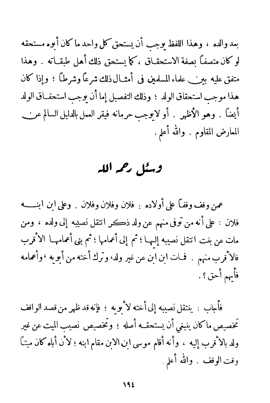 بَعْدَ وَالِدِهِ وَهَذَا اللَّفْظُ يُوجِبُ أَنْ يَسْتَحِقَّ كُلُّ وَاحِدٍ مَا كَانَ أَبُوهُ مُسْتَحِقُّهُ لَوْ كَانَ مُتَّصِفًا بِصِفَةِ الِاسْتِحْقَاقِ كَمَا يَسْتَحِقُّ ذَلِكَ أَهْلُ طَبَقَاتِهِ. وَهَذَا مُتَّفَقٌ عَلَيْهِ بَيْنَ عُلَمَاءِ الْمُسْلِمِينَ فِي أَمْثَالِ ذَلِكَ شَرْعًا وَشَرْطًا وَإِذَا كَانَ هَذَا مُوجِبَ اسْتِحْقَاقِ الْوَلَدِ وَذَلِكَ التَّفْصِيلُ إمَّا أَنْ يُوجِبَ اسْتِحْقَاقَ الْوَلَدِ أَيْضًا. وَهُوَ الْأَظْهَرُ. أَوْ لَا يُوجِبُ حِرْمَانَهُ فَيُقِرُّ الْعَمَلَ بِالدَّلِيلِ السَّالِمِ عَنْ الْمُعَارِضِ الْمُقَاوِمِ. وَاَللَّهُ أَعْلَمُ.