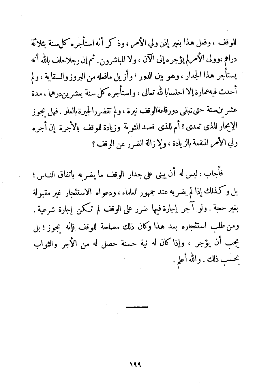 لِلْوَقْفِ وَفَعَلَ هَذَا بِغَيْرِ إذْنِ وَلِيِّ الْأَمْرِ وَذَكَرَ أَنَّهُ اسْتَأْجَرَهُ كُلَّ سَنَةٍ بِثَلَاثَةِ دَرَاهِمَ وَوَلِيُّ الْأَمْرِ لَمْ يُؤَجِّرْهُ إلَى الْآنَ وَلَا الْمُبَاشِرُونَ. ثُمَّ إنَّ رَجُلًا حَلَفَ بِاَللَّهِ أَنَّهُ يَسْتَأْجِرُ هَذَا الْجِدَارَ وَهُوَ بَيْنَ الدُّورِ وَأُزِيلَ مَا فَعَلَهُ مِنْ الْبُرُوزِ وَالسِّقَايَةِ وَلَمْ أَحْدَثَ فِيهِ عِمَارَةً إلَّا احْتِسَابًا بِاَللَّهِ تَعَالَى وَاسْتَأْجَرَهُ كُلَّ سَنَةٍ بِعِشْرِينَ دِرْهَمًا مُدَّةَ عِشْرِينَ سَنَةً حَتَّى تَبْقَى دُورُ قَاعَةِ الْوَقْفِ نَيِّرَةً وَلَمْ تَتَضَرَّرُ الْجِيرَةُ بِالْعُلْوِ. فَهَلْ يَجُوزُ الْإِيجَارُ لِلَّذِي تَعَدَّى؟ أَمْ لِلَّذِي قَصَدَ الْمَثُوبَةَ وَزِيَادَةً لِلْوَقْفِ بِالْأُجْرَةِ إنْ أَجَّرَهُ وَلِيُّ الْأَمْرِ الْمَنْفَعَةُ بِالزِّيَادَةِ وَلِإِزَالَةِ الضَّرَرِ عَنْ الْوَقْفِ؟