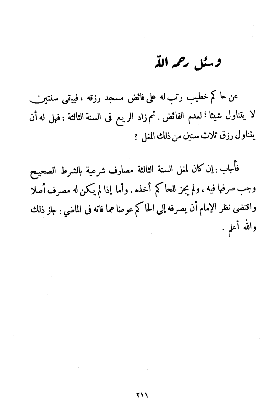 عَنْ حَاكِمٍ خَطِيبٍ رُتِّبَ لَهُ عَلَى فَائِضِ مَسْجِدٍ رِزْقُهُ فَيَبْقَى سَنَتَيْنِ لَا يَتَنَاوَلُ شَيْئًا؛ لِعَدَمِ الْفَائِضِ. ثُمَّ زَادَ الرِّيعُ فِي السَّنَةِ الثَّالِثَةِ: فَهَلْ لَهُ أَنْ يَتَنَاوَلَ رِزْقَ ثَلَاثِ سِنِينَ مِنْ ذَلِكَ الْمُغَلِّ؟