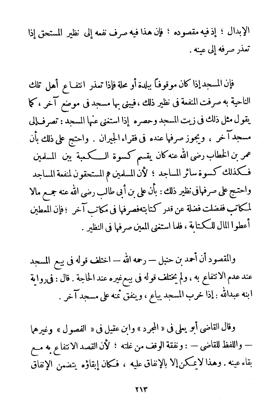 الْإِبْدَالِ؛ إذْ فِيهِ مَقْصُودُهُ؛ فَإِنَّ هَذَا فِيهِ صَرْفُ نَفْعِهِ إلَى نَظِيرِ الْمُسْتَحِقِّ إذَا تَعَذَّرَ صَرْفُهُ إلَى عَيْنِهِ. فَإِنَّ الْمَسْجِدَ إذَا كَانَ مَوْقُوفًا بِبَلْدَةِ أَوْ مَحَلَّةٍ فَإِذَا تَعَذَّرَ انْتِفَاعُ أَهْلِ تِلْكَ النَّاحِيَةِ بِهِ صُرِفَتْ الْمَنْفَعَةُ فِي نَظِيرِ ذَلِكَ فَيُبْنَى بِهَا مَسْجِدٌ فِي مَوْضِعٍ آخَرَ كَمَا يَقُولُ مِثْلَ ذَلِكَ فِي زَيْتِ الْمَسْجِدِ وَحُصْرِهِ إذَا اسْتَغْنَى عَنْهَا الْمَسْجِدُ: تُصْرَفُ إلَى مَسْجِدٍ آخَرَ وَيَجُوزُ صَرْفُهَا عِنْدَهُ فِي فُقَرَاءِ الْجِيرَانِ. وَاحْتَجَّ عَلَى ذَلِكَ بِأَنَّ عُمَرُ بْنُ الْخَطَّابِ رَضِيَ اللَّهُ عَنْهُ كَانَ يُقَسِّمُ كُسْوَةَ الْكَعْبَةِ بَيْنَ الْمُسْلِمِينَ فَكَذَلِكَ كُسْوَةُ سَائِرِ الْمَسَاجِدِ؛ لِأَنَّ الْمُسْلِمِينَ هُمْ الْمُسْتَحِقُّونَ لِمَنْفَعَةِ الْمَسَاجِدِ وَاحْتَجَّ عَلَى صَرْفِهَا فِي نَظِيرِ ذَلِكَ: بِأَنَّ عَلِيِّ بْنِ أَبِي طَالِبٍ رَضِيَ اللَّهُ عَنْهُ جَمَعَ مَالًا لِمُكَاتِبِ فَفَضَلَتْ فَضْلَةٌ عَنْ قَدْرِ كِتَابَتِهِ فَصَرَفَهَا فِي مَكَاتِبَ أُخَرَ؛ فَإِنَّ الْمُعْطِينَ أَعْطَوْا الْمَالَ لِلْكِتَابَةِ فَلَمَّا اسْتَغْنَى الْمُعَيَّنُ صَرَفَهَا فِي النَّظِيرِ. وَالْمَقْصُودُ أَنَّ أَحْمَد بْنَ حَنْبَلٍ - رَحِمَهُ اللَّهُ - اخْتَلَفَ قَوْلُهُ فِي بَيْعِ الْمَسْجِدِ عِنْدَ عَدَمِ الِانْتِفَاعِ بِهِ وَلَمْ يَخْتَلِفْ قَوْلُهُ فِي بَيْعِ غَيْرِهِ عِنْدَ الْحَاجَةِ. قَالَ: فِي رِوَايَةِ ابْنِهِ عَبْدِ اللَّهِ: إذَا خَرِبَ الْمَسْجِدُ يُبَاعُ وَيُنْفَقُ ثَمَنُهُ عَلَى مَسْجِدٍ آخَرَ. وَقَالَ الْقَاضِي أَبُو يَعْلَى فِي " الْمُجَرَّدِ " وَابْنُ عَقِيلٍ فِي " الْفُصُولِ " وَغَيْرُهُمَا وَاللَّفْظُ لِلْقَاضِي -: وَنَفَقَةُ الْوَقْفِ مِنْ غَلَّتِهِ؛ لِأَنَّ الْقَصْدَ الِانْتِفَاعُ بِهِ مَعَ بَقَاءِ عَيْنِهِ. وَهَذَا لَا يُمْكِنُ إلَّا بِالْإِنْفَاقِ عَلَيْهِ فَكَانَ إبْقَاؤُهُ يَتَضَمَّنُ الْإِنْفَاقَ