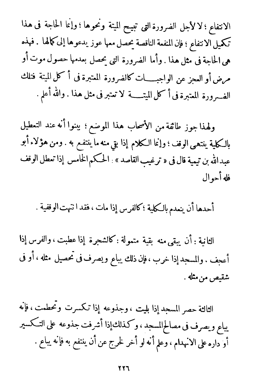 الِانْتِفَاعِ؛ لَا لِأَجْلِ الضَّرُورَةِ الَّتِي تُبِيحُ الْمَيْتَةَ وَنَحْوَهَا؛ وَإِنَّمَا الْحَاجَةُ فِي هَذَا تَكْمِيلُ الِانْتِفَاعِ؛ فَإِنَّ الْمَنْفَعَةَ النَّاقِصَةَ يَحْصُلُ مَعَهَا عَوَزٌ يَدْعُوهَا إلَى كَمَالِهَا. فَهَذِهِ هِيَ الْحَاجَةُ فِي مِثْلِ هَذَا. وَأَمَّا الضَّرُورَةُ الَّتِي يَحْصُلُ بِعَدَمِهَا حُصُولُ مَوْتٍ أَوْ مَرَضٍ أَوْ الْعَجْزُ عَنْ الْوَاجِبَاتِ كَالضَّرُورَةِ الْمُعْتَبَرَةِ فِي أَكْلِ الْمَيْتَةِ فَتِلْكَ الضَّرُورَةُ الْمُعْتَبَرَةُ فِي أَكْلِ الْمَيْتَةِ لَا تُعْتَبَرُ فِي مِثْلِ هَذَا. وَاَللَّهُ أَعْلَمُ. وَلِهَذَا جَوَّزَ طَائِفَةٌ مِنْ الْأَصْحَابِ هَذَا الْمَوْضِعَ؛ بَيَّنُوا أَنَّهُ عِنْدَ التَّعْطِيلِ بِالْكُلِّيَّةِ يَنْتَهِي الْوَقْفُ؛ وَإِنَّمَا الْكَلَامُ إذَا بَقِيَ مِنْهُ مَا يَنْتَفِعُ بِهِ. وَمِنْ هَؤُلَاءِ أَبُو عَبْدِ اللَّهِ بْنُ تَيْمِيَّة قَالَ فِي " تَرْغِيبِ الْقَاصِدِ ": الْحُكْمُ الْخَامِسُ إذَا تَعَطَّلَ الْوَقْفُ فَلَهُ أَحْوَالٌ أَحَدُهَا أَنْ يَنْعَدِمَ بِالْكُلِّيَّةِ؛ كَالْفَرَسِ إذَا مَاتَ فَقَدْ انْتَهَتْ الوقفية. الثَّانِيَة: أَنْ يَبْقَى مِنْهُ بَقِيَّةٌ مُتَمَوِّلَةٌ: كَالشَّجَرَةِ إذَا عَطِبَتْ وَالْفَرَسِ إذَا أَعْجَفَ وَالْمَسْجِدِ إذَا خَرِبَ فَإِنَّ ذَلِكَ يُبَاعُ وَيُصْرَفُ فِي تَحْصِيلِ مِثْلِهِ أَوْ فِي شَقِيصٍ مِنْ مَثَلِهِ. الثَّالِثَةُ حُصْرُ الْمَسْجِدِ إذَا بَلِيَتْ وَجُذُوعُهُ إذَا تَكَسَّرَتْ وَتَحَطَّمَتْ فَإِنَّهُ يُبَاعُ وَيُصْرَفُ فِي مَصَالِحِ الْمَسْجِدِ وَكَذَلِكَ إذَا أَشْرَفَتْ جُذُوعُهُ عَلَى التَّكْسِيرِ أَوْ دَارِهِ عَلَى الِانْهِدَامِ وَعَلِمَ أَنَّهُ لَوْ أَخَّرَ لَخَرَجَ عَنْ أَنْ يَنْتَفِعَ بِهِ فَإِنَّهُ يُبَاعُ.