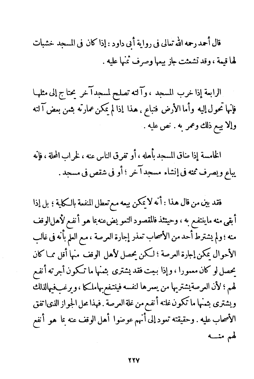 قَالَ أَحْمَدُ رَحِمَهُ اللَّهُ تَعَالَى فِي رِوَايَةِ أَبِي دَاوُد: إذَا كَانَ فِي الْمَسْجِدِ خَشَبَاتٌ لَهَا قِيمَةٌ وَقَدْ تَشَعَّثَتْ جَازَ بَيْعُهَا وَصَرْفُ ثَمَنِهَا عَلَيْهِ. الرَّابِعَةُ إذَا خَرِبَ الْمَسْجِدُ وَآلَتُهُ تَصْلُحُ لِمَسْجِدِ آخَرَ يَحْتَاجُ إلَى مِثْلِهَا فَإِنَّهَا تُحَوَّلُ إلَيْهِ وَأَمَّا الْأَرْضُ فَتُبَاعُ هَذَا إذَا لَمْ يُمْكِنْ عِمَارَتُهُ بِثَمَنِ بَعْضِ آلَتِهِ وَإِلَّا بِيعَ ذَلِكَ وَعُمِرَ بِهِ. نَصَّ عَلَيْهِ. الْخَامِسَةُ إذَا ضَاقَ الْمَسْجِدُ بِأَهْلِهِ أَوْ تَفَرَّقَ النَّاسُ عَنْهُ لِخَرَابِ الْمَحَلَّةِ فَإِنَّهُ يُبَاعُ وَيُصْرَفُ ثَمَنُهُ فِي إنْشَاءِ مَسْجِدٍ آخَرَ؛ أَوْ فِي شِقْصٍ فِي مَسْجِدٍ. فَقَدْ بَيَّنَ مَنْ قَالَ هَذَا: أَنَّهُ لَا يُمْكِنُ بَيْعُهُ مَعَ تَعَطُّلِ الْمَنْفَعَةِ بِالْكُلِّيَّةِ؛ بَلْ إذَا أَبْقَى مِنْهُ مَا يَنْتَفِعُ بِهِ وَحِينَئِذٍ فَالْمَقْصُودُ التَّعْوِيضُ عَنْهُ بِمَا هُوَ أَنْفَعُ لِأَهْلِ الْوَقْفِ مِنْهُ؛ وَلَمْ يَشْتَرِطْ أَحَدٌ مِنْ الْأَصْحَابِ. تَعَذُّرَ إجَارَةِ الْعَرْصَةِ مَعَ الْعِلْمِ بِأَنَّهُ فِي غَالِبِ الْأَحْوَالِ يُمْكِنُ إجَارَةُ الْعَرْصَةِ؛ لَكِنْ يَحْصُلُ لِأَهْلِ الْوَقْفِ مِنْهَا أَقَلُّ مِمَّا كَانَ يَحْصُلُ لَوْ كَانَ مَعْمُورًا وَإِذَا بِيعَتْ فَقَدْ يُشْتَرَى بِثَمَنِهَا مَا تَكُونُ أُجْرَتُهُ أَنْفَعَ لَهُمْ؛ لِأَنَّ الْعَرْصَةَ يَشْتَرِيهَا مَنْ يَعْمُرَهَا لِنَفْسِهِ فَيَنْتَفِعُ بِهَا مِلْكًا وَيَرْغَبُ فِيهَا لِذَلِكَ وَيَشْتَرِي بِثَمَنِهَا مَا تَكُونُ غَلَّتُهُ أَنْفَعَ مِنْ غَلَّةِ الْعَرْصَةِ. فَهَذَا مَحَلُّ الْجَوَازِ الَّذِي اتَّفَقَ الْأَصْحَابُ عَلَيْهِ. وَحَقِيقَتُهُ تَعُودُ إلَى أَنَّهُمْ عَوَّضُوا أَهْلَ الْوَقْفِ عَنْهُ بِمَا هُوَ أَنْفَعُ لَهُمْ مِنْهُ
