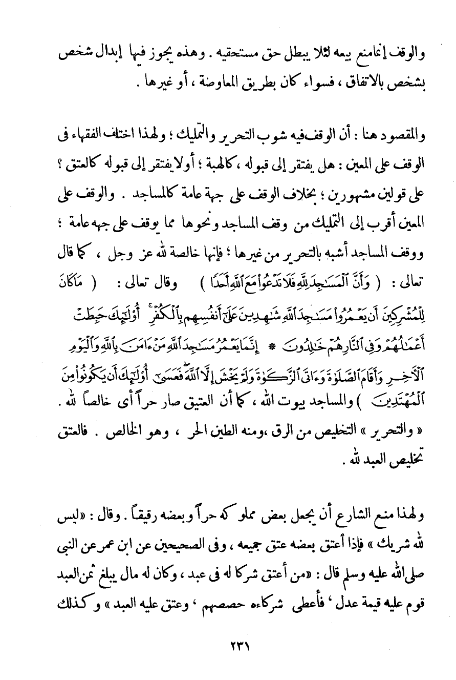 وَالْوَقْفُ إنَّمَا مُنِعَ بَيْعُهُ لِئَلَّا يُبْطِلَ حَقَّ مُسْتَحِقِّيهِ. وَهَذِهِ يَجُوزُ فِيهَا إبْدَالُ شَخْصٍ بِشَخْصِ بِالِاتِّفَاقِ فَسَوَاءٌ كَانَ بِطَرِيقِ الْمُعَاوَضَةِ أَوْ غَيْرِهَا. وَالْمَقْصُودُ هُنَا: أَنَّ الْوَقْفَ فِيهِ شَوْبُ التَّحْرِيرِ وَالتَّمْلِيكِ؛ وَلِهَذَا اخْتَلَفَ الْفُقَهَاءُ فِي الْوَقْفِ عَلَى الْمُعَيَّنِ: هَلْ يَفْتَقِرُ إلَى قَبُولِهِ كَالْهِبَةِ؛ أَوْ لَا يَفْتَقِرُ إلَى قَبُولِهِ كَالْعِتْقِ؟ عَلَى قَوْلَيْنِ مَشْهُورَيْنِ؛ بِخِلَافِ الْوَقْفِ عَلَى جِهَةٍ عَامَّةٍ كَالْمَسَاجِدِ. وَالْوَقْفُ عَلَى الْمُعَيَّنِ أَقْرَبُ إلَى التَّمْلِيكِ مِنْ وَقْفِ الْمَسَاجِدِ وَنَحْوِهَا مِمَّا يُوقَفُ عَلَى جِهَةٍ عَامَّةٍ؛ وَوَقْفُ الْمَسَاجِدِ أَشْبَه بِالتَّحْرِيرِ مِنْ غَيْرِهَا؛ فَإِنَّهَا خَالِصَةٌ لِلَّهِ عَزَّ وَجَلَّ كَمَا قَالَ تَعَالَى: {وَأَنَّ الْمَسَاجِدَ لِلَّهِ فَلَا تَدْعُوا مَعَ اللَّهِ أَحَدًا} وَقَالَ تَعَالَى: {مَا كَانَ لِلْمُشْرِكِينَ أَنْ يَعْمُرُوا مَسَاجِدَ اللَّهِ شَاهِدِينَ عَلَى أَنْفُسِهِمْ بِالْكُفْرِ أُولَئِكَ حَبِطَتْ أَعْمَالُهُمْ وَفِي النَّارِ هُمْ خَالِدُونَ} {إنَّمَا يَعْمُرُ مَسَاجِدَ اللَّهِ مَنْ آمَنَ بِاللَّهِ وَالْيَوْمِ الْآخِرِ وَأَقَامَ الصَّلَاةَ وَآتَى الزَّكَاةَ وَلَمْ يَخْشَ إلَّا اللَّهَ فَعَسَى أُولَئِكَ أَنْ يَكُونُوا مِنَ الْمُهْتَدِينَ} وَالْمَسَاجِدُ بُيُوتُ اللَّهِ كَمَا أَنَّ الْعَتِيقَ صَارَ حُرًّا أَيْ خَالِصًا لِلَّهِ. " وَالتَّحْرِيرُ " التَّخْلِيصُ مِنْ الرِّقِّ وَمِنْهُ الطِّينُ الْحُرُّ وَهُوَ الْخَالِصُ. فَالْعِتْقُ تَخْلِيصُ الْعَبْدِ لِلَّهِ. وَلِهَذَا مَنَعَ الشَّارِعُ أَنْ يَجْعَلَ بَعْضَ مَمْلُوكِهِ حُرًّا وَبَعْضَهُ رَقِيقًا وَقَالَ: " لَيْسَ لِلَّهِ شَرِيكٌ " فَإِذَا أَعْتَقَ بَعْضَهُ عَتَقَ جَمِيعُهُ وَفِي الصَّحِيحَيْنِ عَنْ ابْنِ عُمَرَ عَنْ النَّبِيِّ صَلَّى اللَّهُ عَلَيْهِ وَسَلَّمَ قَالَ: " {مَنْ أَعْتَقَ شِرْكًا لَهُ فِي عَبْدٍ وَكَانَ لَهُ مَالٌ يَبْلُغُ ثَمَنَ الْعَبْدِ قُوِّمَ عَلَيْهِ قِيمَةَ عَدْلٍ فَأَعْطَى شُرَكَاءَهُ حِصَصَهُمْ وَعَتَقَ عَلَيْهِ الْعَبْدُ} " وَكَذَلِكَ