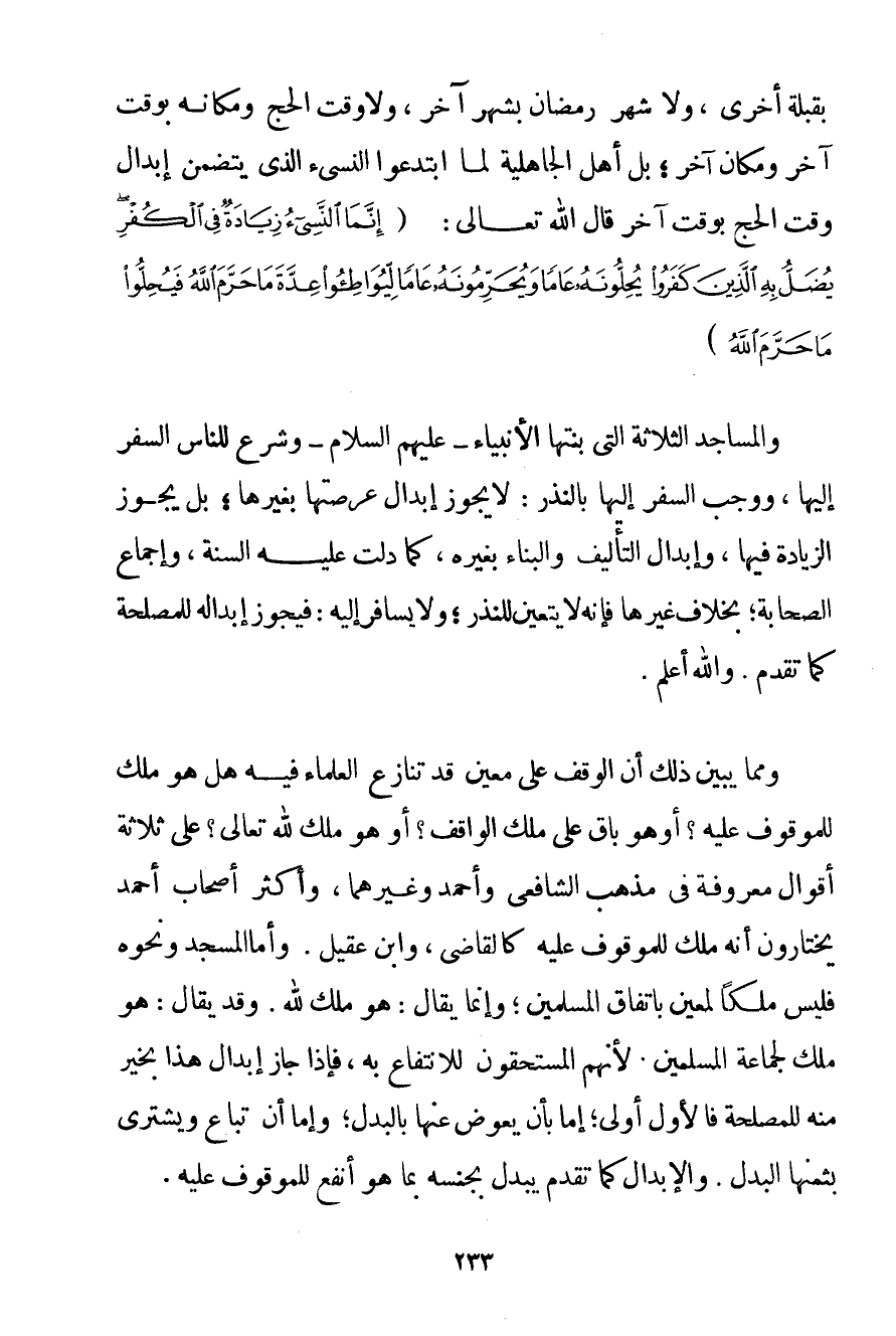 بِقِبْلَةِ أُخْرَى وَلَا شَهْرِ رَمَضَانَ بِشَهْرِ آخَرَ وَلَا وَقْتِ الْحَجِّ وَمَكَانِهِ بِوَقْتِ آخَرَ وَمَكَانٍ آخَرَ؛ بَلْ أَهْلُ الْجَاهِلِيَّةِ لَمَّا ابْتَدَعُوا النَّسِيءَ الَّذِي يَتَضَمَّنُ إبْدَالَ وَقْتِ الْحَجِّ بِوَقْتِ آخَرَ قَالَ اللَّهُ تَعَالَى: {إنَّمَا النَّسِيءُ زِيَادَةٌ فِي الْكُفْرِ يُضَلُّ بِهِ الَّذِينَ كَفَرُوا يُحِلُّونَهُ عَامًا وَيُحَرِّمُونَهُ عَامًا لِيُوَاطِئُوا عِدَّةَ مَا حَرَّمَ اللَّهُ فَيُحِلُّوا مَا حَرَّمَ اللَّهُ} وَالْمَسَاجِدُ الثَّلَاثَةُ الَّتِي بَنَتْهَا الْأَنْبِيَاءُ - عَلَيْهِمْ السَّلَامُ - وَشَرَعَ لِلنَّاسِ السَّفَرُ إلَيْهَا وَوَجَبَ السَّفَرُ إلَيْهَا بِالنَّذْرِ: لَا يَجُوزُ إبْدَالُ عَرْصَتِهَا بِغَيْرِهَا؛ بَلْ يَجُوزُ الزِّيَادَةُ فِيهَا وَإِبْدَالُ التَّأْلِيفِ وَالْبِنَاءِ بِغَيْرِهِ كَمَا دَلَّتْ عَلَيْهِ السُّنَّةُ وَإِجْمَاعُ الصَّحَابَةِ؛ بِخِلَافِ غَيْرِهَا فَإِنَّهُ لَا يَتَعَيَّنُ لِلنَّذْرِ؛ وَلَا يُسَافِرُ إلَيْهِ: فَيَجُوزُ إبْدَالُهُ لِلْمَصْلَحَةِ كَمَا تَقَدَّمَ. وَاَللَّهُ أَعْلَمُ. وَمِمَّا يُبَيِّنُ ذَلِكَ أَنَّ الْوَقْفَ عَلَى مُعَيَّنٍ قَدْ تَنَازَعَ الْعُلَمَاءُ فِيهِ هَلْ هُوَ مِلْكٌ لِلْمَوْقُوفِ عَلَيْهِ؟ أَوْ هُوَ بَاقٍ عَلَى مِلْكِ الْوَاقِفِ؟ أَوْ هُوَ مَلِكٌ لِلَّهِ تَعَالَى؟ عَلَى ثَلَاثَةِ أَقْوَالٍ مَعْرُوفَةٍ فِي مَذْهَبِ الشَّافِعِيِّ وَأَحْمَد وَغَيْرِهِمَا وَأَكْثَرِ أَصْحَابِ أَحْمَد يَخْتَارُونَ أَنَّهُ مِلْكٌ لِلْمَوْقُوفِ عَلَيْهِ كَالْقَاضِي وَابْنُ عَقِيلٍ. وَأَمَّا الْمَسْجِدُ وَنَحْوُهُ فَلَيْسَ مِلْكًا لِمُعَيَّنِ بِاتِّفَاقِ الْمُسْلِمِينَ؛ وَإِنَّمَا يُقَالُ: هُوَ مِلْكٌ لِلَّهِ. وَقَدْ يُقَالُ: هُوَ مِلْكٌ لِجَمَاعَةِ الْمُسْلِمِينَ. لِأَنَّهُمْ الْمُسْتَحِقُّونَ لِلِانْتِفَاعِ بِهِ فَإِذَا جَازَ إبْدَالُ هَذَا بِخَيْرِ مِنْهُ لِلْمَصْلَحَةِ فَالْأَوَّلُ أَوْلَى؛ إمَّا بِأَنْ يُعَوِّضَ عَنْهَا بِالْبَدَلِ؛ وَإِمَّا أَنْ تُبَاعَ وَيُشْتَرَى بِثَمَنِهَا الْبَدَلُ. وَالْإِبْدَالُ كَمَا تَقَدَّمَ يُبَدِّلُ بِجِنْسِهِ بِمَا هُوَ أَنْفَع لِلْمَوْقُوفِ عَلَيْهِ.