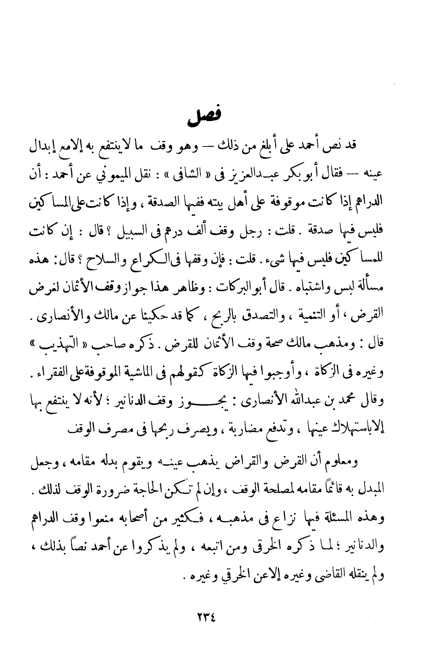 قَدْ نَصَّ أَحْمَد عَلَى أَبْلَغَ مِنْ ذَلِكَ - وَهُوَ وَقْفُ مَا لَا يُنْتَفَعُ بِهِ إلَّا مَعَ إبْدَالِ عَيْنِهِ - فَقَالَ أَبُو بَكْرٍ عَبْدُ الْعَزِيزِ فِي " الشَّافِي ": نَقَلَ الميموني عَنْ أَحْمَد: أَنَّ الدَّرَاهِمَ إذَا كَانَتْ مَوْقُوفَةً عَلَى أَهْلِ بَيْتِهِ فَفِيهَا الصَّدَقَةُ وَإِذَا كَانَتْ عَلَى الْمَسَاكِينِ فَلَيْسَ فِيهَا صَدَقَةٌ. قُلْت: رَجُلٌ وَقَفَ أَلْفَ دِرْهَمٍ فِي السَّبِيلِ؟ قَالَ: إنْ كَانَتْ لِلْمَسَاكِينِ فَلَيْسَ فِيهَا شَيْءٌ. قُلْت: فَإِنْ وَقَفَهَا فِي الْكُرَاعِ وَالسِّلَاحِ؟ قَالَ: هَذِهِ مَسْأَلَةُ لَبْسٍ وَاشْتِبَاهٍ. قَالَ أَبُو الْبَرَكَاتِ: وَظَاهِرُ هَذَا جَوَازُ وَقْفِ الْأَثْمَانِ لِغَرَضِ الْقَرْضِ أَوْ التَّنْمِيَةِ وَالتَّصَدُّقِ بِالرِّبْحِ كَمَا قَدْ حَكَيْنَا عَنْ مَالِكٍ وَالْأَنْصَارِيِّ. قَالَ: وَمَذْهَبُ مَالِكٍ صِحَّةُ وَقْفِ الْأَثْمَانِ لِلْقَرْضِ. ذَكَرَهُ صَاحِبُ " التَّهْذِيبِ " وَغَيْرُهُ فِي الزَّكَاةِ وَأَوْجَبُوا فِيهَا الزَّكَاةَ كَقَوْلِهِمْ فِي الْمَاشِيَةِ الْمَوْقُوفَةِ عَلَى الْفُقَرَاءِ. وَقَالَ مُحَمَّدُ بْنُ عَبْدِ اللَّهِ الْأَنْصَارِيُّ: يَجُوزُ وَقْفُ الدَّنَانِيرِ؛ لِأَنَّهُ لَا يُنْتَفَعُ بِهَا إلَّا بِاسْتِهْلَاكِ عَيْنِهَا وَتُدْفَعُ مُضَارَبَةً وَيُصْرَفُ رِبْحُهَا فِي مَصْرِفِ الْوَقْفِ وَمَعْلُومٌ أَنَّ الْقَرْضَ وَالْقِرَاضَ يَذْهَبُ عَيْنُهُ وَيَقُومُ بَدَلُهُ مَقَامَهُ وَجَعَلَ الْمُبْدَلَ بِهِ قَائِمًا مَقَامَهُ لِمَصْلَحَةِ الْوَقْفِ وَإِنْ لَمْ تَكُنْ الْحَاجَةُ ضَرُورَةَ الْوَقْفِ لِذَلِكَ. وَهَذِهِ الْمَسْأَلَةُ فِيهَا نِزَاعٌ فِي مَذْهَبِهِ فَكَثِيرٌ مِنْ أَصْحَابِهِ مَنَعُوا وَقْفَ الدَّرَاهِمِ وَالدَّنَانِيرِ؛ لِمَا ذَكَرَهُ الخرقي وَمَنْ اتَّبَعَهُ وَلَمْ يَذْكُرُوا عَنْ أَحْمَد نَصًّا بِذَلِكَ وَلَمْ يَنْقُلْهُ الْقَاضِي وَغَيْرُهُ إلَّا عَنْ الخرقي وَغَيْرِهِ.