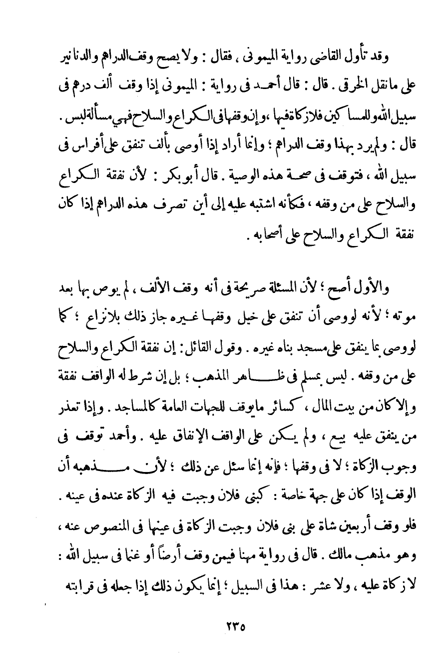 وَقَدْ تَأَوَّلَ الْقَاضِي رِوَايَةَ الميموني فَقَالَ: وَلَا يَصِحُّ وَقْفُ الدَّرَاهِمِ وَالدَّنَانِيرِ عَلَى مَا نَقَلَ الخرقي. قَالَ: قَالَ أَحْمَد فِي رِوَايَةِ: الميموني إذَا وَقَفَ أَلْفَ دِرْهَمٍ فِي سَبِيلِ اللَّهِ وَلِلْمَسَاكِينِ فَلَا زَكَاةَ فِيهَا وَإِنْ وَقَفَهَا فِي الْكُرَاعِ وَالسِّلَاحِ فَهِيَ مَسْأَلَةُ لَبْسٍ. قَالَ: وَلَمْ يُرِدْ بِهَذَا وَقْفَ الدَّرَاهِمِ؛ وَإِنَّمَا أَرَادَ إذَا أَوْصَى بِأَلْفِ تُنْفَقُ عَلَى أَفْرَاسٍ فِي سَبِيلِ اللَّهِ فَتَوَقَّفَ فِي صِحَّةِ هَذِهِ الْوَصِيَّةِ. قَالَ أَبُو بَكْرٍ: لِأَنَّ نَفَقَةَ الْكُرَاعِ وَالسِّلَاحِ عَلَى مَنْ وَقَفَهُ فَكَأَنَّهُ اشْتَبَهَ عَلَيْهِ إلَى أَيْنَ تُصْرَفُ هَذِهِ الدَّرَاهِمُ إذَا كَانَ نَفَقَةُ الْكُرَاعِ وَالسِّلَاحِ عَلَى أَصْحَابِهِ. وَالْأَوَّلُ أَصَحُّ؛ لِأَنَّ الْمَسْأَلَةَ صَرِيحَةٌ فِي أَنَّهُ وَقَفَ الْأَلْفَ لَمْ يُوصِ بِهَا بَعْدَ مَوْتِهِ؛ لِأَنَّهُ لَوْ وَصَّى أَنْ تُنْفَقَ عَلَى خَيْلٍ وَقَفَهَا غَيْرُهُ جَازَ ذَلِكَ بِلَا نِزَاعٍ؛ كَمَا لَوْ وَصَّى بِمَا يُنْفِقُ عَلَى مَسْجِدٍ بَنَاهُ غَيْرُهُ. وَقَوْلُ الْقَائِلِ: إنَّ نَفَقَةَ الْكُرَاعِ وَالسِّلَاحِ عَلَى مَنْ وَقَفَهُ. لَيْسَ بِمُسَلَّمِ فِي ظَاهِرِ الْمَذْهَبِ؛ بَلْ إنْ شَرَطَ لَهُ الْوَاقِفُ نَفَقَةً وَإِلَّا كَانَ مِنْ بَيْتِ الْمَالِ كَسَائِرِ مَا يُوقَفُ لِلْجِهَاتِ الْعَامَّةِ كَالْمَسَاجِدِ. وَإِذَا تَعَذَّرَ مَنْ يُنْفِقُ عَلَيْهِ بِيعَ وَلَمْ يَكُنْ عَلَى الْوَاقِفِ الْإِنْفَاقُ عَلَيْهِ. وَأَحْمَد تَوَقَّفَ فِي وُجُوبِ الزَّكَاةِ؛ لَا فِي وَقْفِهَا؛ فَإِنَّهُ إنَّمَا سُئِلَ عَنْ ذَلِكَ؛ لِأَنَّ مَذْهَبَهُ أَنَّ الْوَقْفَ إذَا كَانَ عَلَى جِهَةٍ خَاصَّةٍ: كَبَنِي فُلَانٍ وَجَبَتْ فِيهِ الزَّكَاةُ عِنْدَهُ فِي عَيْنِهِ. فَلَوْ وَقَفَ أَرْبَعِينَ شَاةً عَلَى بَنِي فُلَانٍ وَجَبَتْ الزَّكَاةُ فِي عَيْنِهَا فِي الْمَنْصُوصِ عَنْهُ وَهُوَ مَذْهَبُ مَالِكٍ. قَالَ فِي رِوَايَةِ مُهَنَّا فِيمَنْ وَقَفَ أَرْضًا أَوْ غَنَمًا فِي سَبِيلِ اللَّهِ: لَا زَكَاةَ عَلَيْهِ وَلَا عُشْرَ: هَذَا فِي السَّبِيلِ؛ إنَّمَا يَكُونُ ذَلِكَ إذَا جَعَلَهُ فِي قَرَابَتِهِ
