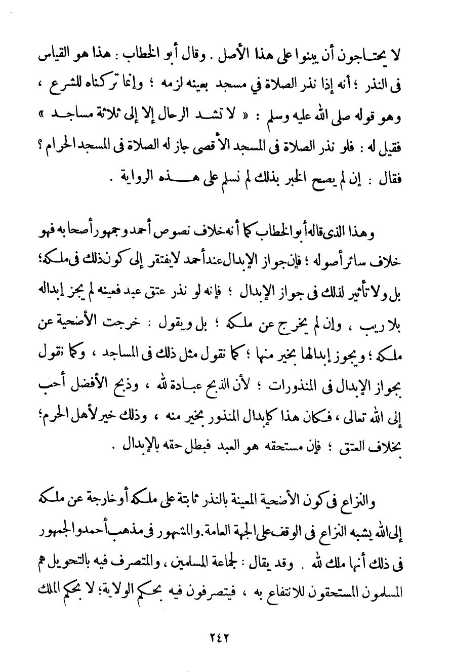 لَا يَحْتَاجُونَ أَنْ يَبْنُوا عَلَى هَذَا الْأَصْلِ. وَقَالَ أَبُو الْخَطَّابِ: هَذَا هُوَ الْقِيَاسُ فِي النَّذْرِ؛ أَنَّهُ إذَا نَذَرَ الصَّلَاةَ فِي مَسْجِدٍ بِعَيْنِهِ لَزِمَهُ؛ وَإِنَّمَا تَرَكْنَاهُ لِلشَّرْعِ وَهُوَ قَوْلُهُ صَلَّى اللَّهُ عَلَيْهِ وَسَلَّمَ " {لَا تُشَدُّ الرِّحَالُ إلَّا إلَى ثَلَاثَةِ مَسَاجِدَ} " فَقِيلَ لَهُ: فَلَوْ نَذَرَ الصَّلَاةَ فِي الْمَسْجِدِ الْأَقْصَى جَازَ لَهُ الصَّلَاةُ فِي الْمَسْجِدِ الْحَرَامِ؟ فَقَالَ: إنْ لَمْ يَصِحَّ الْخَبَرُ بِذَلِكَ لَمْ نُسَلِّمْ عَلَى هَذِهِ الرِّوَايَةِ. وَهَذَا الَّذِي قَالَهُ أَبُو الْخَطَّابِ كَمَا أَنَّهُ خِلَافُ نُصُوصِ أَحْمَد وَجُمْهُورِ أَصْحَابِهِ فَهُوَ خِلَافُ سَائِرِ أُصُولِهِ؛ فَإِنَّ جَوَازَ الْإِبْدَالِ عِنْدَ أَحْمَد لَا يَفْتَقِرُ إلَى كَوْنِ ذَلِكَ فِي مِلْكِهِ؛ بَلْ وَلَا تَأْثِيرَ لِذَلِكَ فِي جَوَازِ الْإِبْدَالِ؛ فَإِنَّهُ لَوْ نَذَرَ عِتْقَ عَبْدٍ فَعَيَّنَهُ لَمْ يَجُزْ إبْدَالُهُ بِلَا رَيْبٍ وَإِنْ لَمْ يَخْرُجْ عَنْ مِلْكِهِ؛ بَلْ وَيَقُولُ: خَرَجَتْ الْأُضْحِيَّةُ عَنْ مِلْكِهِ؛ وَيَجُوزُ إبْدَالُهَا بِخَيْرِ مِنْهَا؛ كَمَا نَقُولُ مِثْلَ ذَلِكَ فِي الْمَسَاجِدِ وَكَمَا نَقُولُ بِجَوَازِ الْإِبْدَالِ فِي الْمَنْذُورَاتِ؛ لِأَنَّ الذَّبْحَ عِبَادَةٌ لِلَّهِ وَذَبْحُ الْأَفْضَلِ أَحَبُّ إلَى اللَّهِ تَعَالَى فَكَانَ هَذَا كَإِبْدَالِ الْمَنْذُورِ بِخَيْرِ مِنْهُ وَذَلِكَ خَيْرٌ لِأَهْلِ الْحَرَمِ؛ بِخِلَافِ الْعِتْقِ؛ فَإِنَّ مُسْتَحَقَّهُ هُوَ الْعَبْدُ فَبَطَلَ حَقُّهُ بِالْإِبْدَالِ. وَالنِّزَاعُ فِي كَوْنِ الْأُضْحِيَّةِ الْمُعَيَّنَةِ بِالنَّذْرِ ثَابِتَةً عَلَى مِلْكِهِ أَوْ خَارِجَةً عَنْ مِلْكِهِ إلَى اللَّهِ يُشْبِهُ النِّزَاعَ فِي الْوَقْفِ عَلَى الْجِهَةِ الْعَامَّةِ. وَالْمَشْهُورُ فِي مَذْهَبِ أَحْمَد وَالْجُمْهُورِ فِي ذَلِكَ أَنَّهَا مِلْكٌ لِلَّهِ. وَقَدْ يُقَالُ: لِجَمَاعَةِ الْمُسْلِمِينَ وَالْمُتَصَرِّفِ فِيهِ بِالتَّحْوِيلِ هُمْ الْمُسْلِمُونَ الْمُسْتَحِقُّونَ لِلِانْتِفَاعِ بِهِ فَيَتَصَرَّفُونَ فِيهِ بِحُكْمِ الْوِلَايَةِ؛ لَا بِحُكْمِ الْمِلْكِ