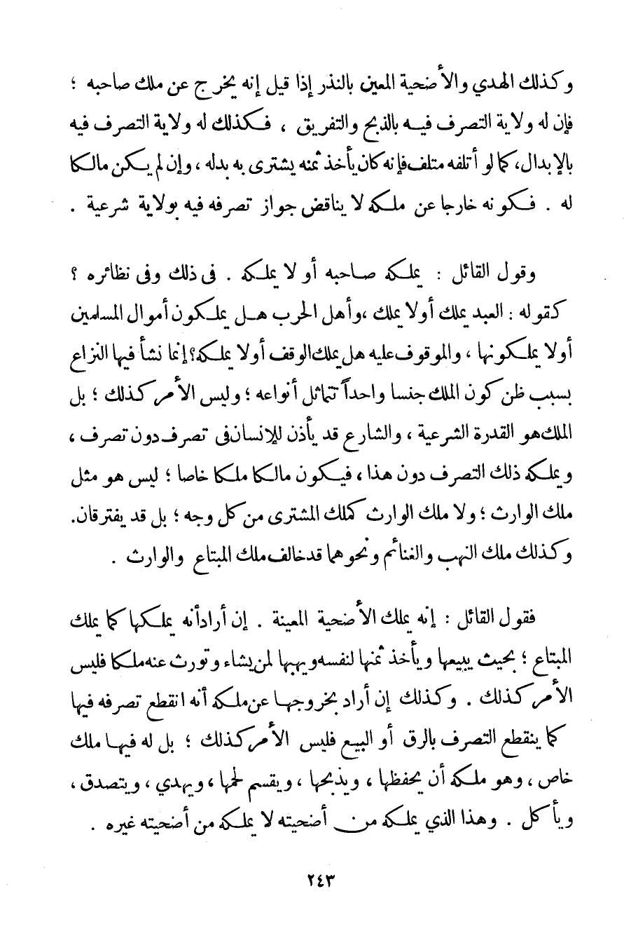 وَكَذَلِكَ الْهَدْيُ وَالْأُضْحِيَّةُ الْمُعَيَّنُ بِالنَّذْرِ إذَا قِيلَ إنَّهُ يَخْرُجُ عَنْ مِلْكِ صَاحِبِهِ؛ فَإِنَّ لَهُ وِلَايَةَ التَّصَرُّفِ فِيهِ بِالذَّبْحِ وَالتَّفْرِيقِ فَكَذَلِكَ لَهُ وِلَايَةُ التَّصَرُّفِ فِيهِ بِالْإِبْدَالِ كَمَا لَوْ أَتْلَفَهُ مُتْلِفٌ فَإِنَّهُ كَانَ يَأْخُذُ ثَمَنَهُ يَشْتَرِي بِهِ بَدَلَهُ وَإِنْ لَمْ يَكُنْ مَالِكًا لَهُ. فَكَوْنُهُ خَارِجًا عَنْ مِلْكِهِ لَا يُنَاقِضُ جَوَازَ تَصَرُّفِهِ فِيهِ بِوِلَايَةِ شَرْعِيَّةٍ. وَقَوْلُ الْقَائِلِ: يَمْلِكُهُ صَاحِبُهُ أَوْ لَا يَمْلِكُهُ. فِي ذَلِكَ وَفِي نَظَائِرِهِ؟ كَقَوْلِهِ: الْعَبْدُ يَمْلِكُ أَوْ لَا يَمْلِكُ وَأَهْلُ الْحَرْبِ هَلْ يَمْلِكُونَ أَمْوَالَ الْمُسْلِمِينَ أَوْ لَا يَمْلِكُونَهَا وَالْمَوْقُوفُ عَلَيْهِ هَلْ يَمْلِكُ الْوَقْفَ أَوْ لَا يَمْلِكُهُ؟ إنَّمَا نَشَأَ فِيهَا النِّزَاعُ بِسَبَبِ ظَنِّ كَوْنِ الْمِلْكِ جِنْسًا وَاحِدًا تَتَمَاثَلُ أَنْوَاعُهُ وَلَيْسَ الْأَمْرُ كَذَلِكَ؛ بَلْ الْمِلْكُ هُوَ الْقُدْرَةُ الشَّرْعِيَّةُ وَالشَّارِعُ قَدْ يَأْذَنُ لِلْإِنْسَانِ فِي تَصَرُّفٍ دُونَ تَصَرُّفٍ وَيَمْلِكُهُ ذَلِكَ التَّصَرُّفُ دُونَ هَذَا فَيَكُونُ مَالِكًا مِلْكًا خَاصًّا؛ لَيْسَ هُوَ مِثْلَ مِلْكِ الْوَارِثِ؛ وَلَا مِلْكُ الْوَارِثِ كَمِلْكِ الْمُشْتَرِي مِنْ كُلِّ وَجْهٍ؛ بَلْ قَدْ يَفْتَرِقَانِ. وَكَذَلِكَ مِلْكُ النَّهْبِ وَالْغَنَائِمِ وَنَحْوِهِمَا قَدْ خَالَفَ مِلْكَ الْمُبْتَاعِ وَالْوَارِثِ. فَقَوْلُ الْقَائِلِ: إنَّهُ يَمْلِكُ الْأُضْحِيَّةَ الْمُعَيَّنَةَ. إنْ أَرَادَ أَنَّهُ يَمْلِكُهَا كَمَا يَمْلِكُ الْمُبْتَاعَ؛ بِحَيْثُ يَبِيعُهَا وَيَأْخُذُ ثَمَنَهَا لِنَفْسِهِ وَيَهَبُهَا لِمَنْ يَشَاءُ وَتُورَثُ عَنْهُ مِلْكًا فَلَيْسَ الْأَمْرُ كَذَلِكَ. وَكَذَلِكَ إنْ أَرَادَ بِخُرُوجِهَا عَنْ مِلْكِهِ أَنَّهُ انْقَطَعَ تَصَرُّفُهُ فِيهَا كَمَا يَنْقَطِعُ التَّصَرُّفُ بِالرِّقِّ أَوْ الْبَيْعِ فَلَيْسَ الْأَمْرُ كَذَلِكَ؛ بَلْ لَهُ فِيهَا مِلْكٌ خَاصٌّ وَهُوَ مِلْكُهُ أَنْ يَحْفَظَهَا وَيَذْبَحَهَا وَيُقَسِّمَ لَحْمَهَا وَيَهْدِيَ وَيَتَصَدَّقَ وَيَأْكُلَ. وَهَذَا الَّذِي يَمْلِكُهُ مِنْ أُضْحِيَّتِهِ لَا يَمْلِكُهُ مِنْ أُضْحِيَّتِهِ غَيْرُهُ.