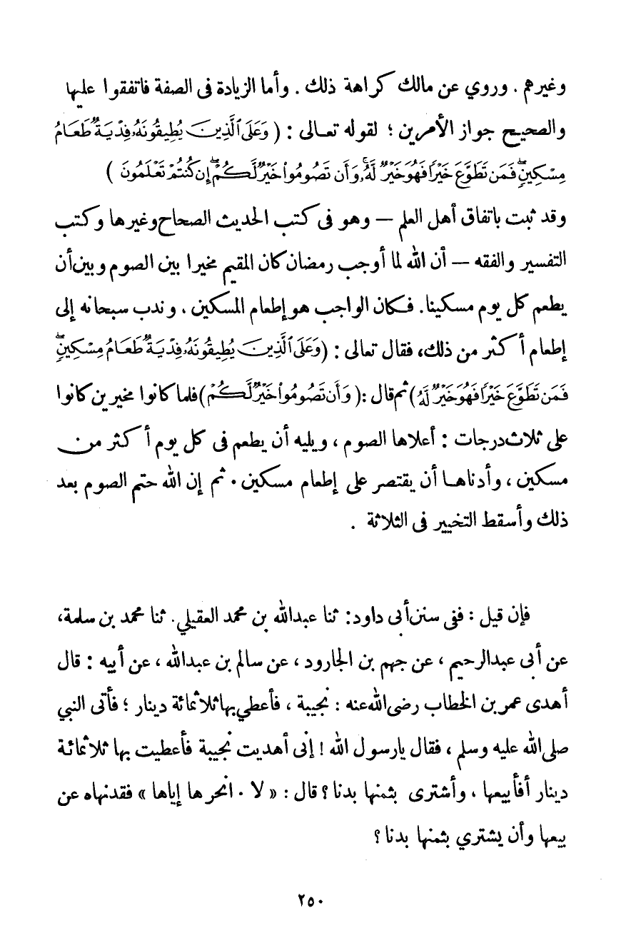 وَغَيْرِهِمْ. وَرُوِيَ عَنْ مَالِكٍ كَرَاهَةَ ذَلِكَ. وَأَمَّا الزِّيَادَةُ فِي الصِّفَةِ فَاتَّفَقُوا عَلَيْهَا وَالصَّحِيحُ جَوَازُ الْأَمْرَيْنِ؛ لِقَوْلِهِ تَعَالَى: {وَعَلَى الَّذِينَ يُطِيقُونَهُ فِدْيَةٌ طَعَامُ مِسْكِينٍ فَمَنْ تَطَوَّعَ خَيْرًا فَهُوَ خَيْرٌ لَهُ وَأَنْ تَصُومُوا خَيْرٌ لَكُمْ إنْ كُنْتُمْ تَعْلَمُونَ} وَقَدْ ثَبَتَ بِاتِّفَاقِ أَهْلِ الْعِلْمِ - وَهُوَ فِي كُتُبِ الْحَدِيثِ الصِّحَاحِ وَغَيْرِهَا وَكُتُبِ التَّفْسِيرِ وَالْفِقْهِ - أَنَّ اللَّهَ لَمَّا أَوْجَبَ رَمَضَانَ كَانَ الْمُقِيمُ مُخَيَّرًا بَيْنَ الصَّوْمِ وَبَيْنَ أَنْ يُطْعِمَ كُلَّ يَوْمٍ مِسْكِينًا. فَكَانَ الْوَاجِبُ هُوَ إطْعَامُ الْمِسْكِينِ وَنَدَبَ سُبْحَانَهُ إلَى إطْعَامِ أَكْثَرَ مِنْ ذَلِكَ فَقَالَ تَعَالَى: {وَعَلَى الَّذِينَ يُطِيقُونَهُ فِدْيَةٌ طَعَامُ مِسْكِينٍ فَمَنْ تَطَوَّعَ خَيْرًا فَهُوَ خَيْرٌ لَهُ} ثُمَّ قَالَ: {وَأَنْ تَصُومُوا خَيْرٌ لَكُمْ} فَلَمَّا كَانُوا مُخَيَّرِينَ كَانُوا عَلَى ثَلَاثِ دَرَجَاتٍ: أَعْلَاهَا الصَّوْمُ وَيَلِيهِ أَنْ يُطْعِمَ فِي كُلِّ يَوْمٍ أَكْثَرَ مِنْ مِسْكِينٍ وَأَدْنَاهَا أَنْ يَقْتَصِرَ عَلَى إطْعَامِ مِسْكِينٍ. ثُمَّ إنَّ اللَّهَ حَتَّمَ الصَّوْمَ بَعْدَ ذَلِكَ وَأَسْقَطَ التَّخْيِيرَ فِي الثَّلَاثَةِ.