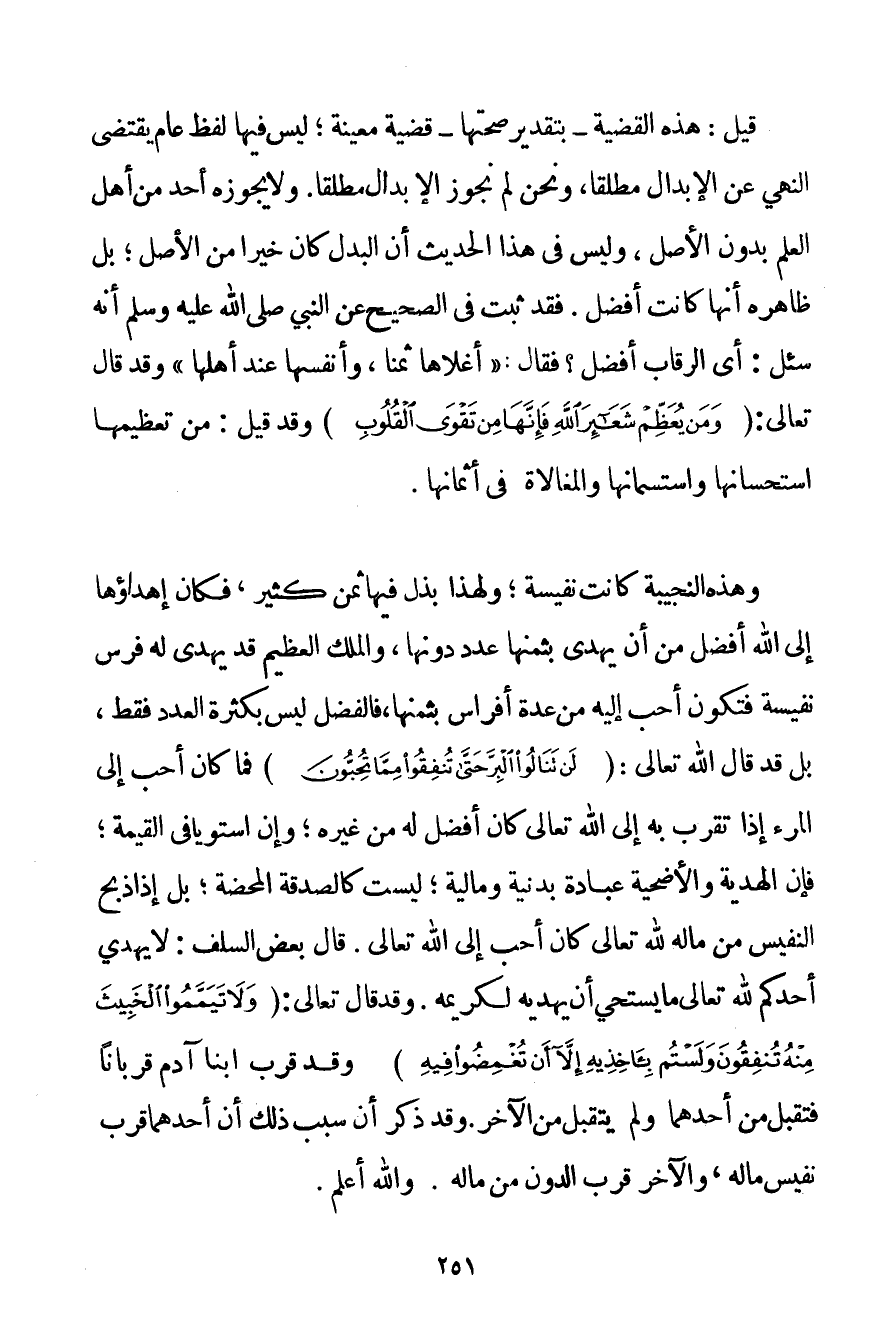 قِيلَ: هَذِهِ الْقَضِيَّةُ - بِتَقْدِيرِ صِحَّتِهَا - قَضِيَّةٌ مُعَيَّنَةٌ؛ لَيْسَ فِيهَا لَفْظٌ عَامٌّ يَقْتَضِي النَّهْيَ عَنْ الْإِبْدَالِ مُطْلَقًا وَنَحْنُ لَمْ نُجَوِّزْ الْإِبْدَالَ مُطْلَقًا. وَلَا يُجَوِّزُهُ أَحَدٌ مِنْ أَهْلِ الْعِلْمِ بِدُونِ الْأَصْلِ وَلَيْسَ فِي هَذَا الْحَدِيثِ أَنَّ الْبَدَلَ كَانَ خَيْرًا مِنْ الْأَصْلِ؛ بَلْ ظَاهِرُهُ أَنَّهَا كَانَتْ أَفْضَلَ. فَقَدْ ثَبَتَ فِي الصَّحِيحِ عَنْ النَّبِيِّ صَلَّى اللَّهُ عَلَيْهِ وَسَلَّمَ أَنَّهُ {سُئِلَ: أَيُّ الرِّقَابِ أَفْضَلُ؟ فَقَالَ: أَغْلَاهَا ثَمَنًا وَأَنْفَسُهَا عِنْدَ أَهْلِهَا} وَقَدْ قَالَ تَعَالَى: {وَمَنْ يُعَظِّمْ شَعَائِرَ اللَّهِ فَإِنَّهَا مِنْ تَقْوَى الْقُلُوبِ} وَقَدْ قِيلَ: مِنْ تَعْظِيمِهَا اسْتِحْسَانُهَا وَاسْتِسْمَانُهَا وَالْمُغَالَاةُ فِي أَثْمَانِهَا. وَهَذِهِ النَّجِيبَةُ كَانَتْ نَفِيسَةً؛ وَلِهَذَا بُذِلَ فِيهَا ثَمَنٌ كَثِيرٌ فَكَانَ إهْدَاؤُهَا إلَى اللَّهِ أَفْضَلَ مِنْ أَنْ يُهْدَى بِثَمَنِهَا عَدَدٌ دُونَهَا وَالْمَلِكُ الْعَظِيمُ قَدْ يُهْدَى لَهُ فَرَسٌ نَفِيسَةٌ فَتَكُونُ أَحَبَّ إلَيْهِ مِنْ عِدَّةِ أَفْرَاسٍ بِثَمَنِهَا فَالْفَضْلُ لَيْسَ بِكَثْرَةِ الْعَدَدِ فَقَطْ بَلْ قَدْ قَالَ اللَّهُ تَعَالَى: {لَنْ تَنَالُوا الْبِرَّ حَتَّى تُنْفِقُوا مِمَّا تُحِبُّونَ} فَمَا كَانَ أَحَبَّ إلَى الْمَرْءِ إذَا تَقَرَّبَ بِهِ إلَى اللَّهِ تَعَالَى كَانَ أَفْضَلَ لَهُ مِنْ غَيْرِهِ؛ وَإِنْ اسْتَوَيَا فِي الْقِيمَةِ؛ فَإِنَّ الْهَدِيَّةَ وَالْأُضْحِيَّةَ عِبَادَةٌ بَدَنِيَّةٌ وَمَالِيَّةٌ؛ لَيْسَتْ كَالصَّدَقَةِ الْمَحْضَةِ؛ بَلْ إذَا ذَبَحَ النَّفِيسَ مِنْ مَالِهِ لِلَّهِ تَعَالَى كَانَ أَحَبَّ إلَى اللَّهِ تَعَالَى. قَالَ بَعْضُ السَّلَفِ: لَا يَهْدِي أَحَدُكُمْ لِلَّهِ تَعَالَى مَا يَسْتَحِي أَنْ يَهْدِيَهُ لِكَرِيمِهِ. وَقَدْ قَالَ تَعَالَى: {وَلَا تَيَمَّمُوا الْخَبِيثَ مِنْهُ تُنْفِقُونَ وَلَسْتُمْ بِآخِذِيهِ إلَّا أَنْ تُغْمِضُوا فِيهِ} وَقَدْ قَرَّبَ ابْنَا آدَمَ قُرْبَانًا فَتُقَبِّلَ مِنْ أَحَدِهِمَا وَلَمْ يُتَقَبَّلْ مِنْ الْآخَرِ. وَقَدْ ذَكَرَ أَنَّ سَبَبَ ذَلِكَ أَنَّ أَحَدَهُمَا قَرَّبَ نَفِيسَ مَالِهِ وَالْآخَرَ قَرَّبَ الدُّونَ مِنْ مَالِهِ. وَاَللَّهُ أَعْلَمُ.