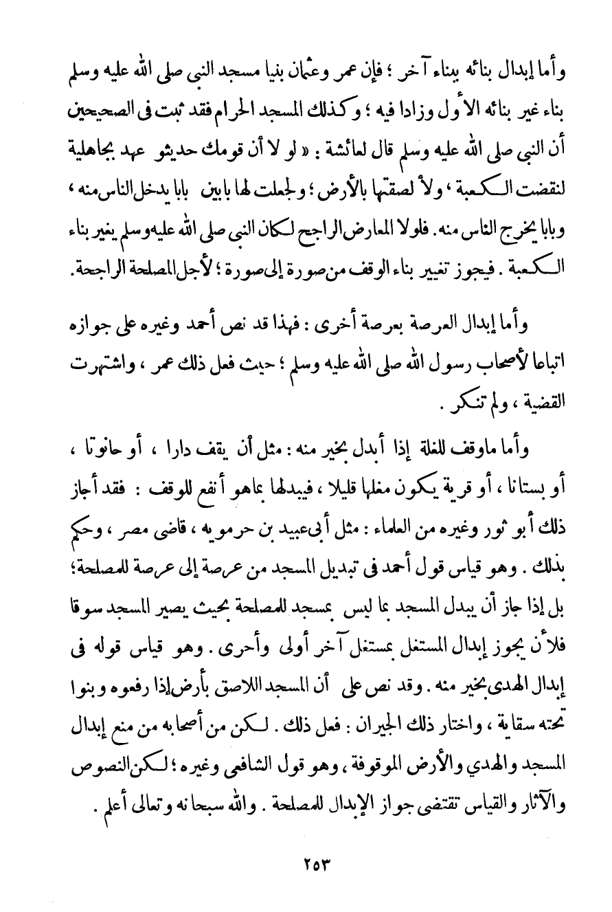 وَأَمَّا إبْدَالُ بِنَائِهِ بِبِنَاءِ آخَرَ؛ فَإِنَّ عُمَرَ وَعُثْمَانَ بَنَيَا مَسْجِدَ النَّبِيِّ صَلَّى اللَّهُ عَلَيْهِ وَسَلَّمَ بِنَاءً غَيْرَ بِنَائِهِ الْأَوَّلِ وَزَادَا فِيهِ؛ وَكَذَلِكَ الْمَسْجِدُ الْحَرَامُ فَقَدْ ثَبَتَ فِي الصَّحِيحَيْنِ {أَنَّ النَّبِيَّ صَلَّى اللَّهُ عَلَيْهِ وَسَلَّمَ قَالَ لِعَائِشَةَ: لَوْلَا أَنَّ قَوْمَك حَدِيثُو عَهْدٍ بِجَاهِلِيَّةٍ لَنَقَضْت الْكَعْبَةَ وَلَأَلْصَقْتهَا بِالْأَرْضِ؛ وَلَجَعَلْت لَهَا بَابَيْنِ بَابًا يَدْخُلُ النَّاسُ مِنْهُ وَبَابًا يَخْرُجُ النَّاسُ مِنْهُ} . فَلَوْلَا الْمُعَارِضُ الرَّاجِحُ لَكَانَ النَّبِيُّ صَلَّى اللَّهُ عَلَيْهِ وَسَلَّمَ يُغَيِّرُ بِنَاءَ الْكَعْبَةِ. فَيَجُوزُ تَغْيِيرُ بِنَاءِ الْوَقْفِ مِنْ صُورَةٍ إلَى صُورَةٍ؛ لِأَجْلِ الْمَصْلَحَةِ الرَّاجِحَةِ. وَأَمَّا إبْدَالُ الْعَرْصَةِ بِعَرْصَةِ أُخْرَى: فَهَذَا قَدْ نَصَّ أَحْمَد وَغَيْرُهُ عَلَى جَوَازِهِ اتِّبَاعًا لِأَصْحَابِ رَسُولِ اللَّهِ صَلَّى اللَّهُ عَلَيْهِ وَسَلَّمَ حَيْثُ فَعَلَ ذَلِكَ عُمَرَ وَاشْتُهِرَتْ الْقَضِيَّةُ وَلَمْ تُنْكَرْ. وَأَمَّا مَا وُقِفَ لِلْغَلَّةِ إذَا أُبْدِلَ بِخَيْرِ مِنْهُ: مِثْلَ أَنْ يَقِفَ دَارًا أَوْ حَانُوتًا أَوْ بُسْتَانًا أَوْ قَرْيَةً يَكُونُ مُغَلُّهَا قَلِيلًا فَيُبَدِّلَهَا بِمَا هُوَ أَنْفَع لِلْوَقْفِ: فَقَدْ أَجَازَ ذَلِكَ أَبُو ثَوْرٍ وَغَيْرِهِ مِنْ الْعُلَمَاءِ: مِثْلَ أَبِي عُبَيْدٍ فِي حرمويه قَاضِي مِصْرَ وَحَكَمَ بِذَلِكَ. وَهُوَ قِيَاسُ قَوْلِ أَحْمَد فِي تَبْدِيلِ الْمَسْجِدِ مِنْ عَرْصَةٍ إلَى عَرْصَةٍ لِلْمَصْلَحَةِ؛ بَلْ إذَا جَازَ أَنْ يُبَدِّلَ الْمَسْجِدَ بِمَا لَيْسَ بِمَسْجِدِ لِلْمَصْلَحَةِ بِحَيْثُ يَصِيرُ الْمَسْجِدُ سُوقًا فَلَأَنْ يَجُوزَ إبْدَالُ الْمُسْتَغَلِّ بِمُسْتَغَلِّ آخَرَ أَوْلَى وَأَحْرَى. وَهُوَ قِيَاسُ قَوْلِهِ فِي إبْدَالِ الْهَدْيِ بِخَيْرِ مِنْهُ. وَقَدْ نَصَّ عَلَى أَنَّ الْمَسْجِدَ اللَّاصِقَ بِأَرْضِ إذَا رَفَعُوهُ وَبَنَوْا تَحْتَهُ سِقَايَةً وَاخْتَارَ ذَلِكَ الْجِيرَانُ: فُعِلَ ذَلِكَ. لَكِنْ مِنْ أَصْحَابِهِ مِنْ مَنْعِ إبْدَالِ الْمَسْجِدِ وَالْهَدْيِ وَالْأَرْضِ الْمَوْقُوفَةِ وَهُوَ قَوْلُ الشَّافِعِيِّ وَغَيْرِهِ؛ لَكِنَّ النُّصُوصَ وَالْآثَارَ وَالْقِيَاسَ تَقْتَضِي جَوَازَ الْإِبْدَالِ لِلْمَصْلَحَةِ. وَاَللَّهُ سُبْحَانَهُ وَتَعَالَى أَعْلَمُ.