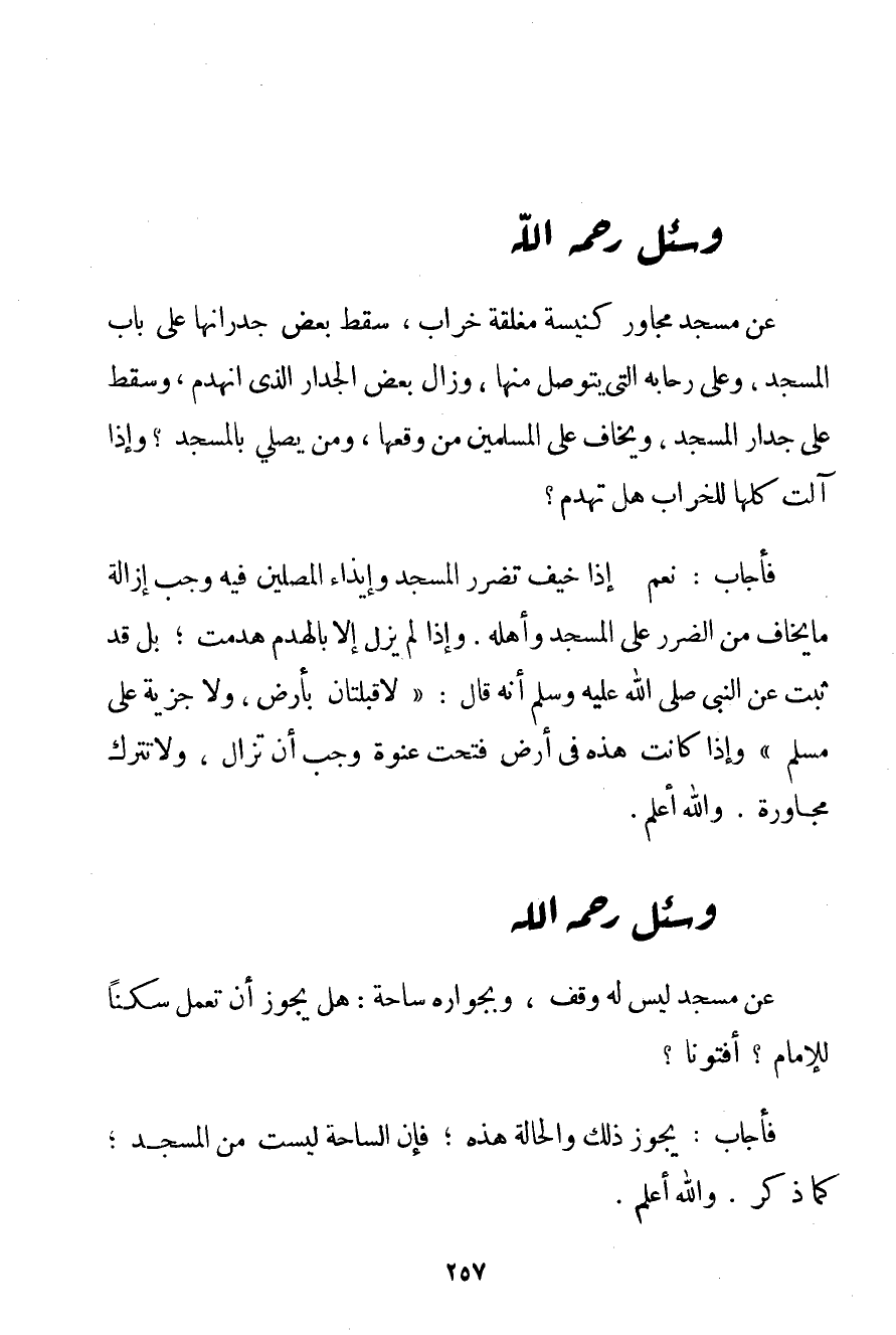 عَنْ مَسْجِدٍ مُجَاوِرِ كَنِيسَةٍ مُغْلَقَةٍ خَرَابٍ سَقَطَ بَعْضُ جُدْرَانِهَا عَلَى بَابِ الْمَسْجِدِ وَعَلَى رِحَابِهِ الَّتِي يَتَوَصَّلُ مِنْهَا وَزَالَ بَعْضُ الْجِدَارِ الَّذِي انْهَدَمَ وَسَقَطَ عَلَى جِدَارِ الْمَسْجِدِ وَيُخَافُ عَلَى الْمُسْلِمِينَ مِنْ وَقْعِهَا وَمَنْ يُصَلِّي بِالْمَسْجِدِ؟ وَإِذَا آلَتْ كُلُّهَا لِلْخَرَابِ هَلْ تُهْدَمُ؟