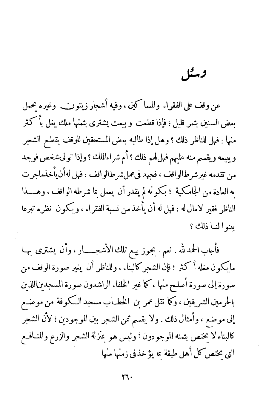 عَنْ وَقْفٍ عَلَى الْفُقَرَاءِ وَالْمَسَاكِينِ وَفِيهِ أَشْجَارُ زَيْتُونٍ وَغَيْرِهِ يَحْمِلُ بَعْضَ السِّنِينَ بِثَمَرِ قَلِيلٍ؛ فَإِذَا قُطِعَتْ وَبِيعَتْ يُشْتَرَى بِثَمَنِهَا مِلْكٌ يُغَلُّ بِأَكْثَرَ مِنْهَا: فَهَلْ لِلنَّاظِرِ ذَلِكَ؟ وَهَلْ إذَا طَالَبَهُ بَعْضُ الْمُسْتَحِقِّينَ لِلْوَقْفِ يَقْطَعُ الشَّجَرَ وَيَبِيعُهُ وَيُقَسِّمُ مِنْهُ عَلَيْهِمْ فَهَلْ لَهُمْ ذَلِكَ؟ أَمْ شِرَاءُ الْمِلْكِ؟ وَإِذَا تَوَلَّى شَخْصٌ فَوَجَدَ مَنْ تَقَدَّمَهُ غَيَّرَ شَرْطَ الْوَاقِفِ فَجَهَدَ فِي عَمَلِ شَرْطِ الْوَاقِفِ: فَهَلْ لَهُ أَنْ يَأْخُذَ مَا جَرَتْ بِهِ الْعَادَةُ مِنْ الجامكية؛ بِكَوْنِهِ لَمْ يَقْدِرْ أَنْ يَعْمَلَ بِمَا شَرَطَهُ الْوَاقِفُ وَهَذَا النَّاظِرُ فَقِيرٌ لَا مَالَ لَهُ: فَهَلْ لَهُ أَنْ يَأْخُذَ مِنْ نِسْبَةِ الْفُقَرَاءِ وَيَكُونُ نَظْرُهُ تَبَرُّعًا بَيِّنُوا لَنَا ذَلِكَ؟