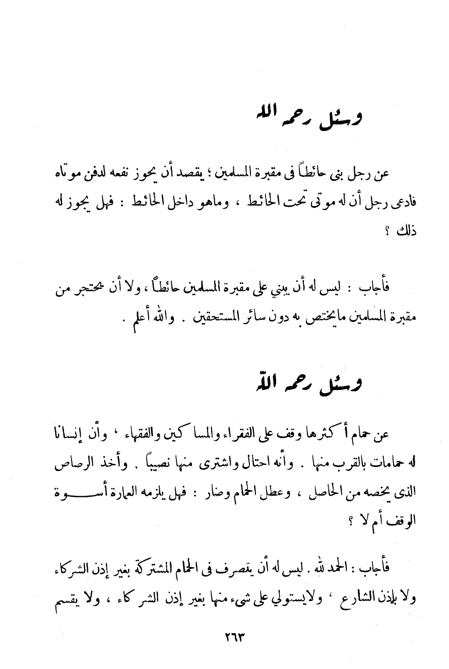 لَيْسَ لَهُ أَنْ يَبْنِيَ عَلَى مَقْبَرَةِ الْمُسْلِمِينَ حَائِطًا وَلَا أَنْ يَحْتَجِزَ مِنْ مَقْبَرَةِ الْمُسْلِمِينَ مَا يَخْتَصُّ بِهِ دُونَ سَائِرِ الْمُسْتَحِقِّينَ. وَاَللَّهُ أَعْلَمُ.