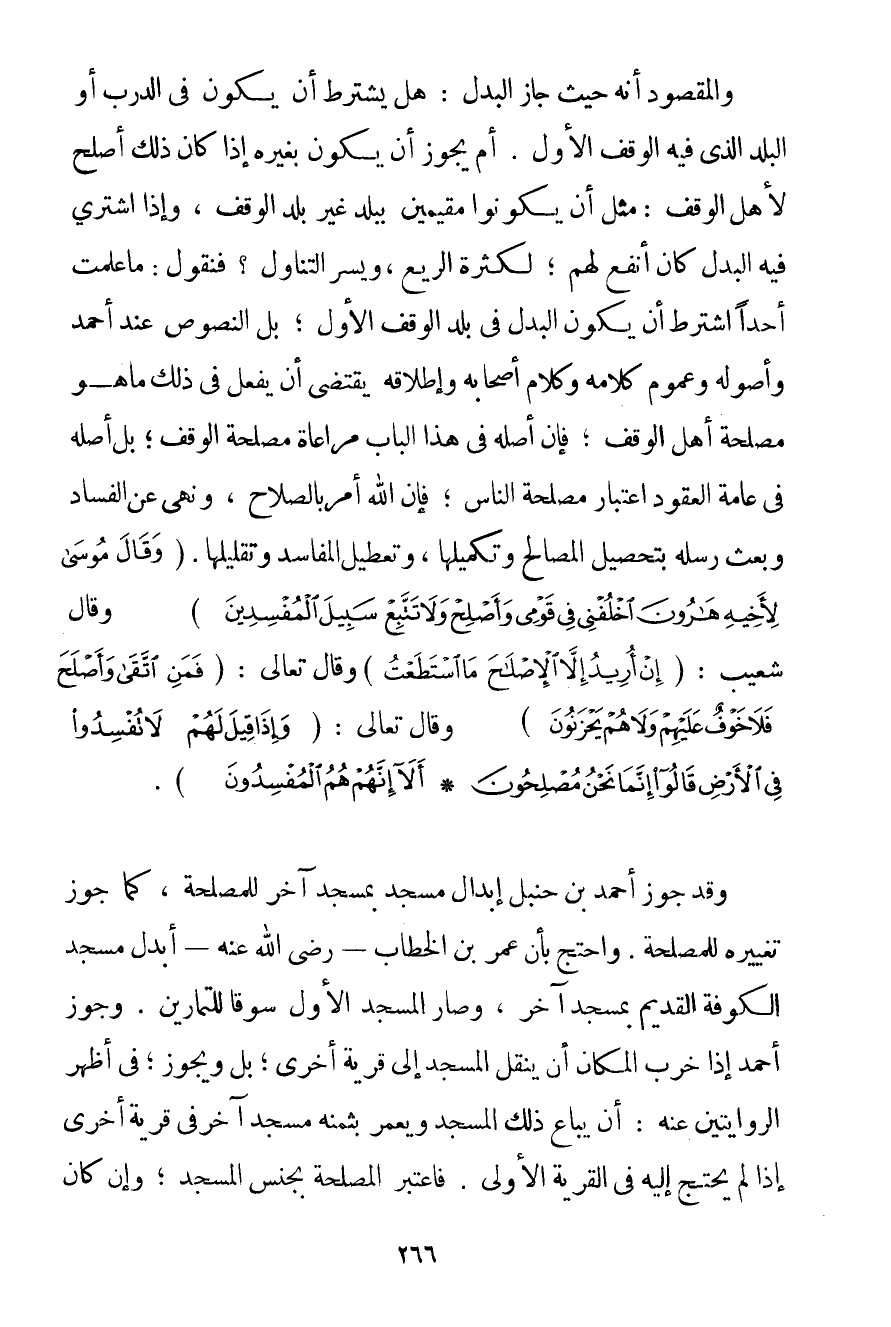 وَالْمَقْصُودُ أَنَّهُ حَيْثُ جَازَ الْبَدَلُ: هَلْ يُشْتَرَطُ أَنْ يَكُونَ فِي الدَّرْبِ أَوْ الْبَلَدِ الَّذِي فِيهِ الْوَقْفِ الْأَوَّلِ. أَمْ يَجُوزُ أَنْ يَكُونَ بِغَيْرِهِ إذَا كَانَ ذَلِكَ أَصْلَحَ لِأَهْلِ الْوَقْفِ: مِثْلَ أَنْ يَكُونُوا مُقِيمِينَ بِبَلَدِ غَيْرِ بَلَدِ الْوَقْفِ وَإِذَا اُشْتُرِيَ فِيهِ الْبَدَلُ كَانَ أَنْفَعَ لَهُمْ؛ لِكَثْرَةِ الرِّيعِ وَيُسْرِ التَّنَاوُلِ؟ فَنَقُولُ: مَا عَلِمْت أَحَدًا اشْتَرَطَ أَنْ يَكُونَ الْبَدَلُ فِي بَلَدِ الْوَقْفِ الْأَوَّلِ؛ بَلْ النُّصُوصُ عِنْدَ أَحْمَد وَأُصُولُهُ وَعُمُومُ كَلَامِهِ وَكَلَامُ أَصْحَابِهِ وَإِطْلَاقُهُ يَقْتَضِي أَنْ يَفْعَلَ فِي ذَلِكَ مَا هُوَ مَصْلَحَةُ أَهْلِ الْوَقْفِ؛ فَإِنَّ أَصْلَهُ فِي هَذَا الْبَابِ مُرَاعَاةُ مَصْلَحَةِ الْوَقْفِ؛ بَلْ أَصْلُهُ فِي عَامَّةِ الْعُقُودِ اعْتِبَارُ مَصْلَحَةِ النَّاسِ؛ فَإِنَّ اللَّهَ أَمَرَ بِالصَّلَاحِ وَنَهَى عَنْ الْفَسَادِ وَبَعَثَ رُسُلَهُ بِتَحْصِيلِ الْمَصَالِحِ وَتَكْمِيلِهَا وَتَعْطِيلِ الْمَفَاسِدِ وَتَقْلِيلِهَا. {وَقَالَ مُوسَى لِأَخِيهِ هَارُونَ اخْلُفْنِي فِي قَوْمِي وَأَصْلِحْ وَلَا تَتَّبِعْ سَبِيلَ الْمُفْسِدِينَ} وَقَالَ شُعَيْبٌ: {إنْ أُرِيدُ إلَّا الْإِصْلَاحَ مَا اسْتَطَعْتُ} وَقَالَ تَعَالَى: {فَمَنِ اتَّقَى وَأَصْلَحَ فَلَا خَوْفٌ عَلَيْهِمْ وَلَا هُمْ يَحْزَنُونَ} وَقَالَ تَعَالَى: {وَإِذَا قِيلَ لَهُمْ لَا تُفْسِدُوا فِي الْأَرْضِ قَالُوا إنَّمَا نَحْنُ مُصْلِحُونَ} {أَلَا إنَّهُمْ هُمُ الْمُفْسِدُونَ} . وَقَدْ جَوَّزَ أَحْمَد بْنَ حَنْبَلٍ إبْدَالَ مَسْجِدٍ بِمَسْجِدِ آخَرَ لِلْمَصْلَحَةِ كَمَا جَوَّزَ تَغْيِيرَهُ لِلْمَصْلَحَةِ. وَاحْتَجَّ بِأَنَّ عُمَرُ بْنُ الْخَطَّابِ - رَضِيَ اللَّهُ عَنْهُ - أَبْدَلَ مَسْجِدَ الْكُوفَةِ الْقَدِيمَ بِمَسْجِدِ آخَرَ وَصَارَ الْمَسْجِدُ الْأَوَّلُ سُوقًا لِلتَّمَارِينِ. وَجَوَّزَ أَحْمَد إذَا خَرِبَ الْمَكَانُ أَنْ يَنْقُلَ الْمَسْجِدَ إلَى قَرْيَةٍ أُخْرَى؛ بَلْ وَيَجُوزُ؛ فِي أَظْهَرِ الرِّوَايَتَيْنِ عَنْهُ: أَنْ يُبَاعَ ذَلِكَ الْمَسْجِدُ وَيُعْمَرَ بِثَمَنِهِ مَسْجِدٌ آخَرُ فِي قَرْيَةٍ أُخْرَى إذَا لَمْ يَحْتَجْ إلَيْهِ فِي الْقَرْيَةِ الْأُولَى. فَاعْتَبَرَ الْمَصْلَحَةَ بِجِنْسِ الْمَسْجِدِ؛ وَإِنْ كَانَ فِي