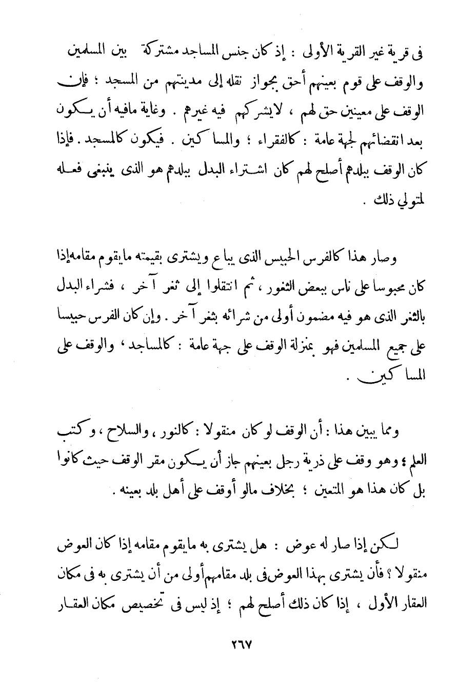 قَرْيَةٍ غَيْرِ الْقَرْيَةِ الْأُولَى: إذْ كَانَ جِنْسُ الْمَسَاجِدِ مُشْتَرِكَةً بَيْنَ الْمُسْلِمِينَ وَالْوَقْفُ فِي قَوْمٍ بِعَيْنِهِمْ أَحَقُّ بِجَوَازِ نَقْلِهِ إلَى مَدِينَتِهِمْ مِنْ الْمَسْجِدِ؛ فَإِنَّ الْوَقْفَ عَلَى مُعَيَّنِينَ حَقٌّ لَهُمْ لَا يُشْرِكُهُمْ فِيهِ غَيْرُهُمْ وَغَايَةُ مَا فِيهِ أَنْ يَكُونَ بَعْد انْقِضَائِهِمْ لِجِهَةِ عَامَّةٍ: كَالْفُقَرَاءِ؛ وَالْمَسَاكِينِ. فَيَكُونُ كَالْمَسْجِدِ. فَإِذَا كَانَ الْوَقْفُ بِبَلَدِهِمْ أَصْلَحَ لَهُمْ كَانَ اشْتِرَاءُ الْبَدَلِ بِبَلَدِهِمْ هُوَ الَّذِي يَنْبَغِي فِعْلُهُ لِمُتَوَلِّي ذَلِكَ. وَصَارَ هَذَا كَالْفَرَسِ الْحَبِيسِ الَّذِي يُبَاعُ وَيُشْتَرَى بِقِيمَتِهِ مَا يَقُومُ مَقَامَهُ إذَا كَانَ مَحْبُوسًا عَلَى نَاسٍ بِبَعْضِ الثُّغُورِ ثُمَّ انْتَقَلُوا إلَى ثَغْرٍ آخَرَ فَشِرَاءُ الْبَدَلِ بِالثَّغْرِ الَّذِي هُوَ فِيهِ مَضْمُونٌ أَوْلَى مِنْ شِرَائِهِ بِثَغْرِ آخَرَ. وَإِنْ كَانَ الْفَرَسُ حَبِيسًا عَلَى جَمِيعِ الْمُسْلِمِينَ فَهُوَ بِمَنْزِلَةِ الْوَقْفِ عَلَى جِهَةٍ عَامَّةٍ: كَالْمَسَاجِدِ وَالْوَقْفِ عَلَى الْمَسَاكِينِ. وَمِمَّا يُبَيِّنُ هَذَا: أَنَّ الْوَقْفَ لَوْ كَانَ مَنْقُولًا: كَالنُّورِ وَالسِّلَاحِ وَكُتُبِ الْعِلْمِ؛ وَهُوَ وَقْفٌ عَلَى ذُرِّيَّةِ رَجُلٍ بِعَيْنِهِمْ جَازَ أَنْ يَكُونَ مَقَرُّ الْوَقْفِ حَيْثُ كَانُوا بَلْ كَانَ هَذَا هُوَ الْمُتَعَيَّنَ؛ بِخِلَافِ مَا لَوْ أَوْقَفَ عَلَى أَهْلِ بَلَدٍ بِعَيْنِهِ. لَكِنْ إذَا صَارَ لَهُ عِوَضٌ: هَلْ يَشْتَرِي بِهِ مَا يَقُومُ مَقَامَهُ إذَا كَانَ الْعِوَضُ مَنْقُولًا؟ فَأَنْ يَشْتَرِيَ بِهَذَا الْعِوَضِ فِي بَلَدِ مُقَامِهِمْ أَوْلَى مِنْ أَنْ يَشْتَرِيَ بِهِ فِي مَكَانِ الْعَقَارِ الْأَوَّلِ إذَا كَانَ ذَلِكَ أَصْلَحَ لَهُمْ؛ إذْ لَيْسَ فِي تَخْصِيصِ مَكَانِ الْعَقَارِ