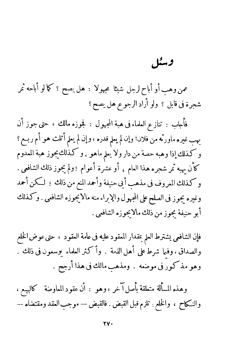 تَنَازَعَ الْعُلَمَاءُ فِي هِبَةِ الْمَجْهُولِ: فَجَوَّزَهُ مَالِكٍ حَتَّى جَوَّزَ أَنْ يَهَبَ غَيْرَهُ مَا وَرِثَهُ مِنْ فُلَانٍ؛ وَإِنْ لَمْ يَعْلَمْ قَدْرَهُ وَإِنْ لَمْ يَعْلَمْ أَثُلُثٌ هُوَ أَمْ رُبُعٌ؟ وَكَذَلِكَ إذَا وَهَبَهُ حِصَّةً مِنْ دَارٍ وَلَا يَعْلَمُ مَا هُوَ وَكَذَلِكَ يَجُوزُ هِبَةُ الْمَعْدُومِ كَأَنْ يَهَبَهُ ثَمَرَ شَجَرِهِ هَذَا الْعَامَ أَوْ عَشَرَةَ أَعْوَامٍ؛ وَلَمْ يُجَوِّزْ ذَلِكَ الشَّافِعِيِّ. وَكَذَلِكَ الْمَعْرُوفُ فِي مَذْهَبِ أَبِي حَنِيفَةَ وَأَحْمَد الْمَنْعُ مِنْ ذَلِكَ؛ لَكِنَّ أَحْمَد وَغَيْرَهُ يُجَوِّزُ فِي الصُّلْحِ عَلَى الْمَجْهُولِ وَالْإِبْرَاءِ مِنْهُ مَا لَا يُجَوِّزُهُ الشَّافِعِيِّ. وَكَذَلِكَ أَبُو حَنِيفَةَ يُجَوِّزُ مِنْ ذَلِكَ مَا لَا يُجَوِّزُهُ الشَّافِعِيِّ. فَإِنَّ الشَّافِعِيِّ يَشْتَرِطُ الْعِلْمَ بِمِقْدَارِ الْمَعْقُودِ عَلَيْهِ فِي عَامَّةِ الْعُقُودِ حَتَّى عِوَضِ الْخُلْعِ وَالصَّدَاقِ وَفِيمَا شَرَطَ عَلَى أَهْلِ الذِّمَّةِ. وَأَكْثَرُ الْعُلَمَاءِ يُوَسِّعُونَ فِي ذَلِكَ. وَهُوَ مَذْكُورٌ فِي مَوْضِعِهِ. وَمَذْهَبُ مَالِكٍ فِي هَذَا أَرْجَحُ. وَهَذِهِ الْمَسْأَلَةُ مُتَعَلِّقَةٌ بِأَصْلِ آخَرَ وَهُوَ: أَنَّ عُقُودَ الْمُعَاوَضَةِ كَالْبَيْعِ وَالنِّكَاحِ وَالْخُلْعِ: تَلْزَمُ قَبْلَ الْقَبْضِ. فَالْقَبْضُ - مُوجَبُ الْعَقْدِ وَمُقْتَضَاهُ -