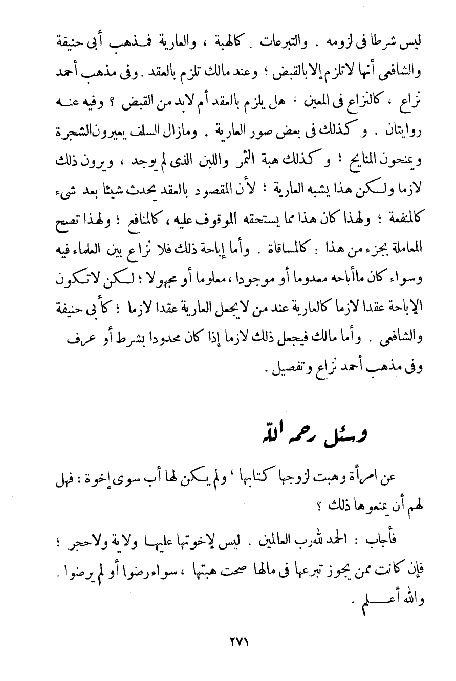 لَيْسَ شَرْطًا فِي لُزُومِهِ. وَالتَّبَرُّعَاتُ: كَالْهِبَةِ وَالْعَارِيَةِ فَمَذْهَبُ أَبِي حَنِيفَةَ وَالشَّافِعِيِّ أَنَّهَا لَا تَلْزَمُ إلَّا بِالْقَبْضِ؛ وَعِنْدَ مَالِكٍ تَلْزَمُ بِالْعَقْدِ. وَفِي مَذْهَبِ أَحْمَد نِزَاعٌ كَالنِّزَاعِ فِي الْمُعَيَّنِ: هَلْ يَلْزَمُ بِالْعَقْدِ أَمْ لَا بُدَّ مِنْ الْقَبْضِ؟ وَفِيهِ عَنْهُ رِوَايَتَانِ. وَكَذَلِكَ فِي بَعْضِ صُوَرِ الْعَارِيَةِ. وَمَا زَالَ السَّلَفُ يُعِيرُونَ الشَّجَرَةَ وَيَمْنَحُونَ المنايح؛ وَكَذَلِكَ هِبَةُ الثَّمَرِ وَاللَّبَنِ الَّذِي لَمْ يُوجَدْ وَيَرَوْنَ ذَلِكَ لَازِمًا وَلَكِنْ هَذَا يُشْبِهُ الْعَارِيَةَ؛ لِأَنَّ الْمَقْصُودَ بِالْعَقْدِ يَحْدُثُ شَيْئًا بَعْدَ شَيْءٍ كَالْمَنْفَعَةِ؛ وَلِهَذَا كَانَ هَذَا مِمَّا يَسْتَحِقُّهُ الْمَوْقُوفُ عَلَيْهِ كَالْمَنَافِعِ؛ وَلِهَذَا تَصِحُّ الْمُعَامَلَةُ بِجُزْءِ مِنْ هَذَا: كَالْمُسَاقَاةِ. وَأَمَّا إبَاحَةُ ذَلِكَ فَلَا نِزَاعَ بَيْنَ الْعُلَمَاءِ فِيهِ وَسَوَاءٌ كَانَ مَا أَبَاحَهُ مَعْدُومًا أَوْ مَوْجُودًا مَعْلُومًا أَوْ مَجْهُولًا؛ لَكِنْ لَا تَكُونُ الْإِبَاحَةُ عَقْدًا لَازِمًا كَالْعَارِيَةِ عِنْدَ مَنْ لَا يَجْعَلُ الْعَارِيَةَ عَقْدًا لَازِمًا؛ كَأَبِي حَنِيفَةَ وَالشَّافِعِيِّ. وَأَمَّا مَالِكٍ فَيَجْعَلُ ذَلِكَ لَازِمًا إذَا كَانَ مَحْدُودًا بِشَرْطِ أَوْ عُرْفٍ وَفِي مَذْهَبِ أَحْمَد نِزَاعٌ وَتَفْصِيلٌ.
