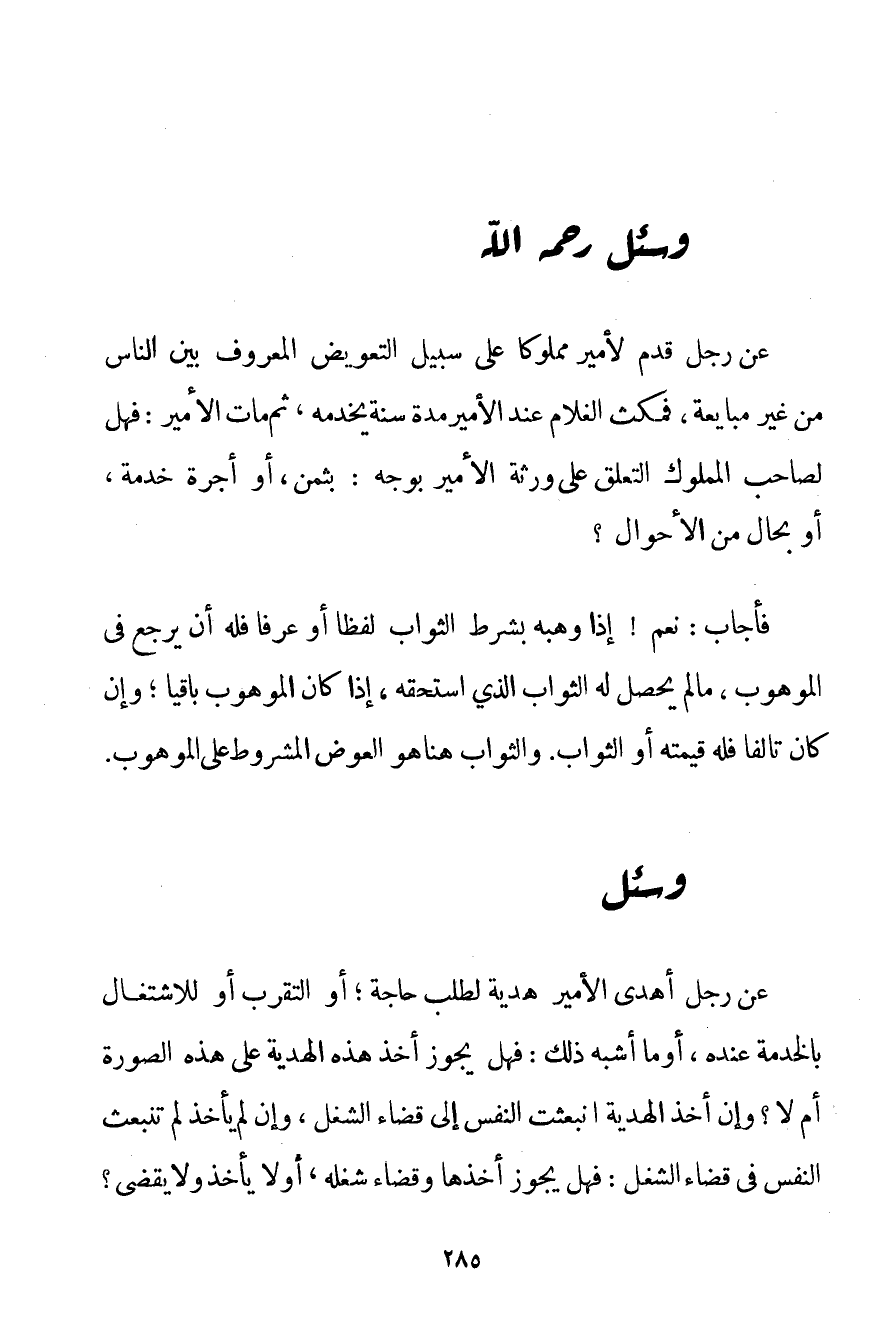 عَنْ رَجُلٍ قَدَّمَ لِأَمِيرِ مَمْلُوكًا عَلَى سَبِيلِ التَّعْوِيضِ الْمَعْرُوفِ بَيْنَ النَّاسِ مِنْ غَيْرِ مُبَايَعَةٍ فَمَكَثَ الْغُلَامُ عِنْدَ الْأَمِيرِ مُدَّةَ سَنَةٍ يَخْدِمُهُ ثُمَّ مَاتَ الْأَمِيرُ: فَهَلْ لِصَاحِبِ الْمَمْلُوكِ التَّعَلُّقُ عَلَى وَرَثَةِ الْأَمِيرِ بِوَجْهِ: بِثَمَنِ أَوْ أُجْرَةِ خِدْمَةٍ أَوْ بِحَالِ مِنْ الْأَحْوَالِ؟