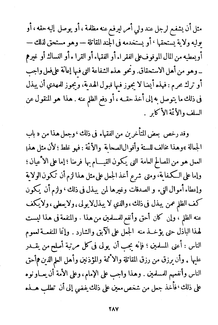 مِثْلُ أَنْ يَشْفَعَ لِرَجُلِ عِنْدَ وَلِيِّ أَمْرٍ لِيَرْفَعَ عَنْهُ مَظْلِمَةً أَوْ يُوَصِّلَ إلَيْهِ حَقَّهُ أَوْ يُوَلِّيَهُ وِلَايَةً يَسْتَحِقُّهَا أَوْ يَسْتَخْدِمُهُ فِي الْجُنْدِ الْمُقَاتِلَةِ - وَهُوَ مُسْتَحِقٌّ لِذَلِكَ - أَوْ يُعْطِيَهُ مِنْ الْمَالِ الْمَوْقُوفِ عَلَى الْفُقَرَاءِ أَوْ الْفُقَهَاءِ أَوْ الْقُرَّاءِ أَوْ النُّسَّاكِ أَوْ غَيْرِهِمْ - وَهُوَ مِنْ أَهْلِ الِاسْتِحْقَاقِ. وَنَحْوَ هَذِهِ الشَّفَاعَةِ الَّتِي فِيهَا إعَانَةٌ عَلَى فِعْلٍ وَاجِبٍ أَوْ تَرْكُ مُحَرَّمٍ: فَهَذِهِ أَيْضًا لَا يَجُوزُ فِيهَا قَبُولُ الْهَدِيَّةِ وَيَجُوزُ لِلْمَهْدِيِّ أَنْ يَبْذُلَ فِي ذَلِكَ مَا يَتَوَصَّلُ بِهِ إلَى أَخْذِ حَقِّهِ أَوْ دَفْعِ الظُّلْمِ عَنْهُ. هَذَا هُوَ الْمَنْقُولُ عَنْ السَّلَفِ وَالْأَئِمَّةِ الْأَكَابِرِ. وَقَدْ رَخَّصَ بَعْضُ الْمُتَأَخِّرِينَ مِنْ الْفُقَهَاءِ فِي ذَلِكَ وَجَعَلَ هَذَا مِنْ " بَابِ الْجِعَالَةِ " وَهَذَا مُخَالِفٌ لِلسُّنَّةِ وَأَقْوَالِ الصَّحَابَةِ وَالْأَئِمَّةِ: فَهُوَ غَلَطٌ؛ لِأَنَّ مِثْلَ هَذَا الْعَمَلِ هُوَ مِنْ الْمَصَالِحِ الْعَامَّةِ الَّتِي يَكُونُ الْقِيَامُ بِهَا فَرْضًا؛ إمَّا عَلَى الْأَعْيَانِ؛ وَإِمَّا عَلَى الْكِفَايَةِ وَمَتَى شُرِعَ أَخْذُ الْجُعْلِ عَلَى مِثْلِ هَذَا لَزِمَ أَنْ يَكُونَ الْوِلَايَةُ وَإِعْطَاءُ أَمْوَالِ الْفَيْءِ وَالصَّدَقَاتِ وَغَيْرِهَا لِمَنْ يَبْذُلُ فِي ذَلِكَ وَلَزِمَ أَنْ يَكُونَ كَفُّ الظُّلْمِ عَمَّنْ يَبْذُلُ فِي ذَلِكَ وَاَلَّذِي لَا يَبْذُلُ لَا يُوَلَّى وَلَا يُعْطَى وَلَا يُكَفُّ عَنْهُ الظُّلْمُ وَإِنْ كَانَ أَحَقَّ وَأَنْفَعَ لِلْمُسْلِمِينَ مِنْ هَذَا. وَالْمَنْفَعَةُ فِي هَذَا لَيْسَتْ لِهَذَا الْبَاذِلِ حَتَّى يُؤْخَذَ مِنْهُ الْجُعْلُ عَلَى الْآبِقِ وَالشَّارِدِ. وَإِنَّمَا الْمَنْفَعَةُ لِعُمُومِ النَّاسِ: أَعْنِي الْمُسْلِمِينَ؛ فَإِنَّهُ يَجِبُ أَنْ يُوَلِّيَ فِي كُلِّ مَرْتَبَةٍ أَصْلَحَ مَنْ يَقْدِرُ عَلَيْهَا وَأَنْ يُرْزَقَ مِنْ رِزْقِ الْمُقَاتِلَةِ وَالْأَئِمَّةِ وَالْمُؤَذِّنِينَ وَأَهْلِ الْعِلْمِ الَّذِينَ هُمْ أَحَقُّ النَّاسِ وَأَنْفَعُهُمْ لِلْمُسْلِمِينَ. وَهَذَا وَاجِبٌ عَلَى الْإِمَامِ وَعَلَى الْأُمَّةِ أَنْ يُعَاوِنُوهُ عَلَى ذَلِكَ فَأَخْذُ جُعْلٍ مِنْ شَخْصٍ مُعَيَّنٍ عَلَى ذَلِكَ يُفْضِي إلَى أَنْ تُطْلَبَ هَذِهِ