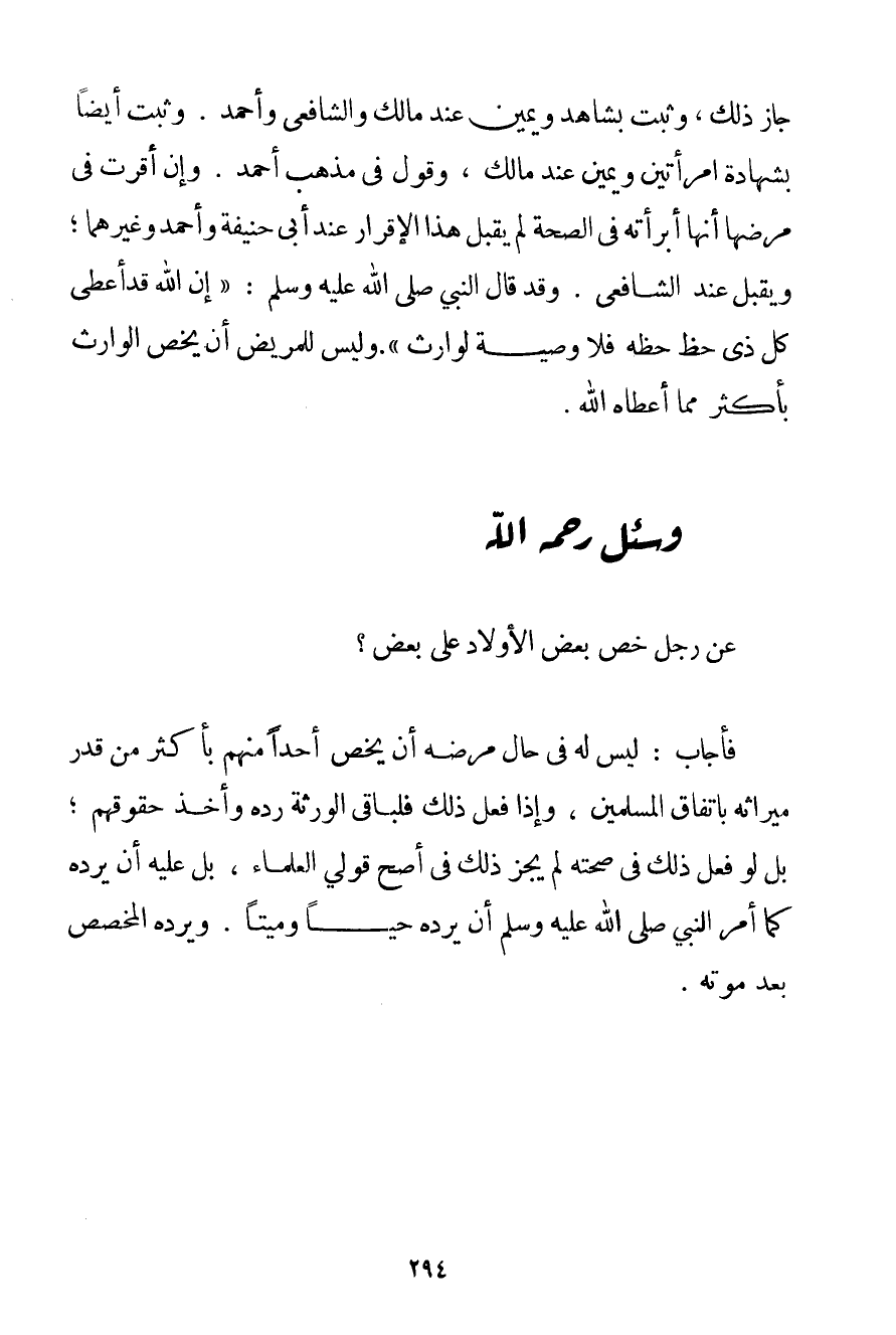 لَيْسَ لَهُ فِي حَالِ مَرَضِهِ أَنْ يَخُصَّ أَحَدًا مِنْهُمْ بِأَكْثَرَ مِنْ قَدْرِ مِيرَاثِهِ بِاتِّفَاقِ الْمُسْلِمِينَ وَإِذَا فَعَلَ ذَلِكَ فَلِبَاقِي الْوَرَثَةِ رَدُّهُ وَأَخْذُ حُقُوقِهِمْ؛ بَلْ لَوْ فَعَلَ ذَلِكَ فِي صِحَّتِهِ لَمْ يَجُزْ ذَلِكَ فِي أَصَحِّ قَوْلَيْ الْعُلَمَاءِ بَلْ عَلَيْهِ أَنْ يَرُدَّهُ كَمَا أَمَرَ النَّبِيُّ صَلَّى اللَّهُ عَلَيْهِ وَسَلَّمَ أَنْ يَرُدَّهُ حَيًّا وَمَيِّتًا. وَيَرُدُّهُ الْمُخَصَّصُ بَعْدَ مَوْتِهِ.