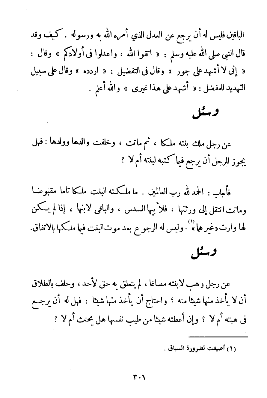 الْبَاقِينَ فَلَيْسَ لَهُ أَنْ يَرْجِعَ عَنْ الْعَدْلِ الَّذِي أَمَرَهُ اللَّهُ بِهِ وَرَسُولُهُ. كَيْفَ وَقَدْ قَالَ النَّبِيُّ صَلَّى اللَّهُ عَلَيْهِ وَسَلَّمَ {اتَّقُوا اللَّهَ وَاعْدِلُوا فِي أَوْلَادِكُمْ} وَقَالَ: {إنِّي لَا أَشْهَدُ عَلَى جَوْرٍ} وَقَالَ فِي التَّفْضِيلِ: " اُرْدُدْهُ " وَقَالَ عَلَى سَبِيلِ التَّهْدِيدِ لِلْمُفَضِّلِ: {أَشْهِدْ عَلَى هَذَا غَيْرِي} وَاَللَّهُ أَعْلَمُ.