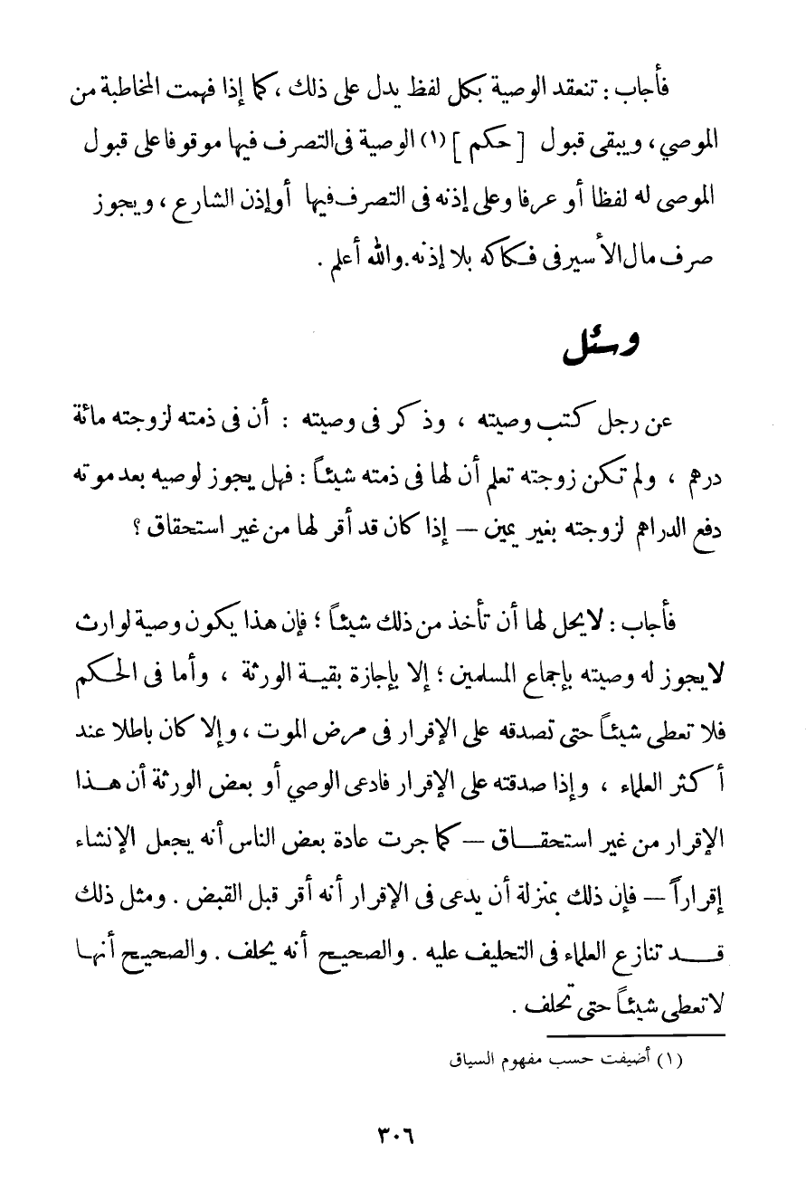 فَأَجَابَ: تَنْعَقِدُ الْوَصِيَّةُ بِكُلِّ لَفْظٍ يَدُلُّ عَلَى ذَلِكَ كَمَا إذَا فُهِمَتْ الْمُخَاطَبَةُ مِنْ الْمُوصِي وَيَبْقَى قَبُولُ [حُكْمِ] (1) الْوَصِيَّةِ فِي التَّصَرُّفِ فِيهَا مَوْقُوفًا عَلَى قَبُولِ الْمُوصَى لَهُ لَفْظًا أَوْ عُرْفًا وَعَلَى إذْنِهِ فِي التَّصَرُّفِ فِيهَا أَوْ إذْنِ الشَّارِعِ وَيَجُوزُ صَرْفُ مَالِ الْأَسِيرِ فِي فِكَاكِهِ بِلَا إذْنِهِ. وَاَللَّهُ أَعْلَمُ.