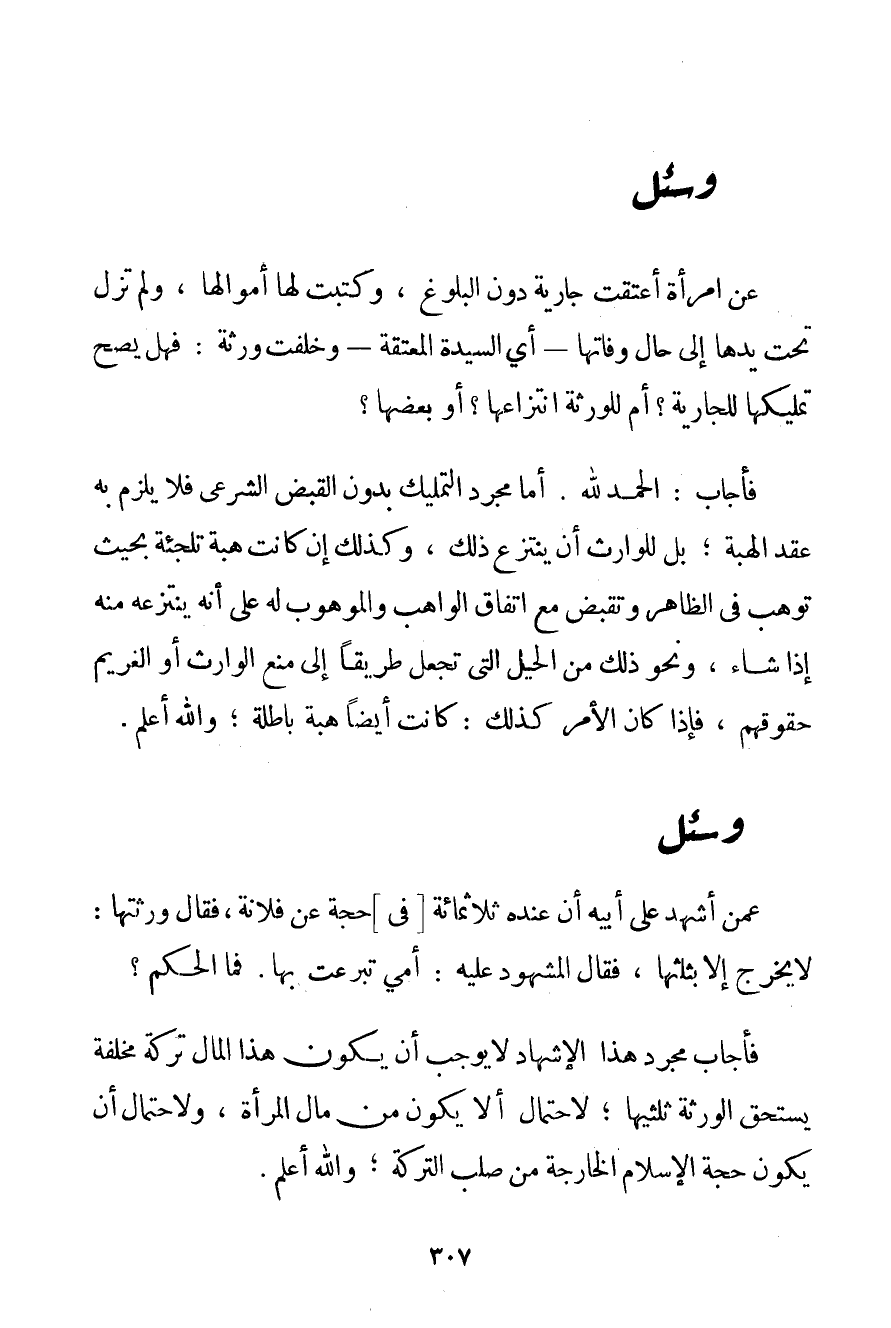 عَمَّنْ أَشْهَدَ عَلَى أَبِيهِ أَنَّ عِنْدَهُ ثَلَاثَمِائَةٍ فِي حُجَّةٍ عَنْ فُلَانَةَ فَقَالَ وَرَثَتُهَا: لَا يَخْرُجُ إلَّا بِثُلُثِهَا فَقَالَ الْمَشْهُودُ عَلَيْهِ: أُمِّي تَبَرَّعَ بِهَا. فَمَا الْحُكْمُ؟