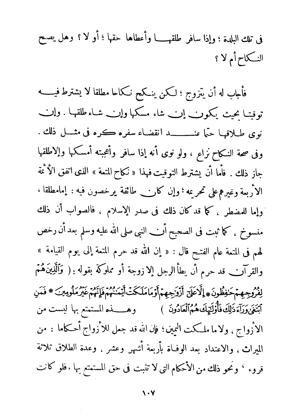 لَهُ أَنْ يَتَزَوَّجَ؛ لَكِنْ يَنْكِحُ نِكَاحًا مُطْلَقًا لَا يُشْتَرَطُ فِيهِ تَوْقِيتًا بِحَيْثُ يَكُونُ إنْ شَاءَ مَسَكَهَا وَإِنْ شَاءَ طَلَّقَهَا. وَإِنْ نَوَى طَلَاقَهَا حَتْمًا عِنْدَ انْقِضَاءِ سَفَرِهِ كُرِهَ فِي مِثْلِ ذَلِكَ. وَفِي صِحَّةِ النِّكَاحِ نِزَاعٌ وَلَوْ نَوَى أَنَّهُ إذَا سَافَرَ وَأَعْجَبَتْهُ أَمْسَكَهَا وَإِلَّا طَلَّقَهَا جَازَ ذَلِكَ. فَأَمَّا أَنْ يَشْتَرِطَ التَّوْقِيتَ فَهَذَا " نِكَاحُ الْمُتْعَةِ " الَّذِي اتَّفَقَ الْأَئِمَّةُ الْأَرْبَعَةُ وَغَيْرُهُمْ عَلَى تَحْرِيمِهِ؛ وَإِنْ كَانَ طَائِفَةٌ يُرَخِّصُونَ فِيهِ: إمَّا مُطْلَقًا وَإِمَّا لِلْمُضْطَرِّ كَمَا قَدْ كَانَ ذَلِكَ فِي صَدْرِ الْإِسْلَامِ فَالصَّوَابُ أَنَّ ذَلِكَ مَنْسُوخٌ كَمَا ثَبَتَ فِي الصَّحِيحِ أَنَّ النَّبِيَّ صَلَّى اللَّهُ عَلَيْهِ وَسَلَّمَ بَعْدَ أَنْ رَخَّصَ لَهُمْ فِي الْمُتْعَةِ عَامَ الْفَتْحِ قَالَ: {إنَّ اللَّهَ قَدْ حَرَّمَ الْمُتْعَةَ إلَى يَوْمِ الْقِيَامَةِ} وَالْقُرْآنُ قَدْ حَرَّمَ أَنْ يَطَأَ الرَّجُلُ إلَّا زَوْجَةً أَوْ مَمْلُوكَةً بِقَوْلِهِ: {وَالَّذِينَ هُمْ لِفُرُوجِهِمْ حَافِظُونَ} {إلَّا عَلَى أَزْوَاجِهِمْ أوْ مَا مَلَكَتْ أَيْمَانُهُمْ فَإِنَّهُمْ غَيْرُ مَلُومِينَ} {فَمَنِ ابْتَغَى وَرَاءَ ذَلِكَ فَأُولَئِكَ هُمُ الْعَادُونَ} وَهَذِهِ الْمُسْتَمْتَعُ بِهَا لَيْسَتْ مِنْ الْأَزْوَاجِ وَلَا مَا مُلِكَتْ الْيَمِينَ فَإِنَّ اللَّهَ قَدْ جَعَلَ لِلْأَزْوَاجِ أَحْكَامًا: مِنْ الْمِيرَاثِ وَالِاعْتِدَادِ بَعْدَ الْوَفَاةِ بِأَرْبَعَةِ أَشْهُرٍ وَعَشْرٍ وَعِدَّةُ الطَّلَاقِ ثَلَاثَةُ قُرُوءٍ وَنَحْوُ ذَلِكَ مِنْ الْأَحْكَامِ الَّتِي لَا تَثْبُتُ فِي حَقِّ الْمُسْتَمْتَعِ بِهَا فَلَوْ كَانَتْ
