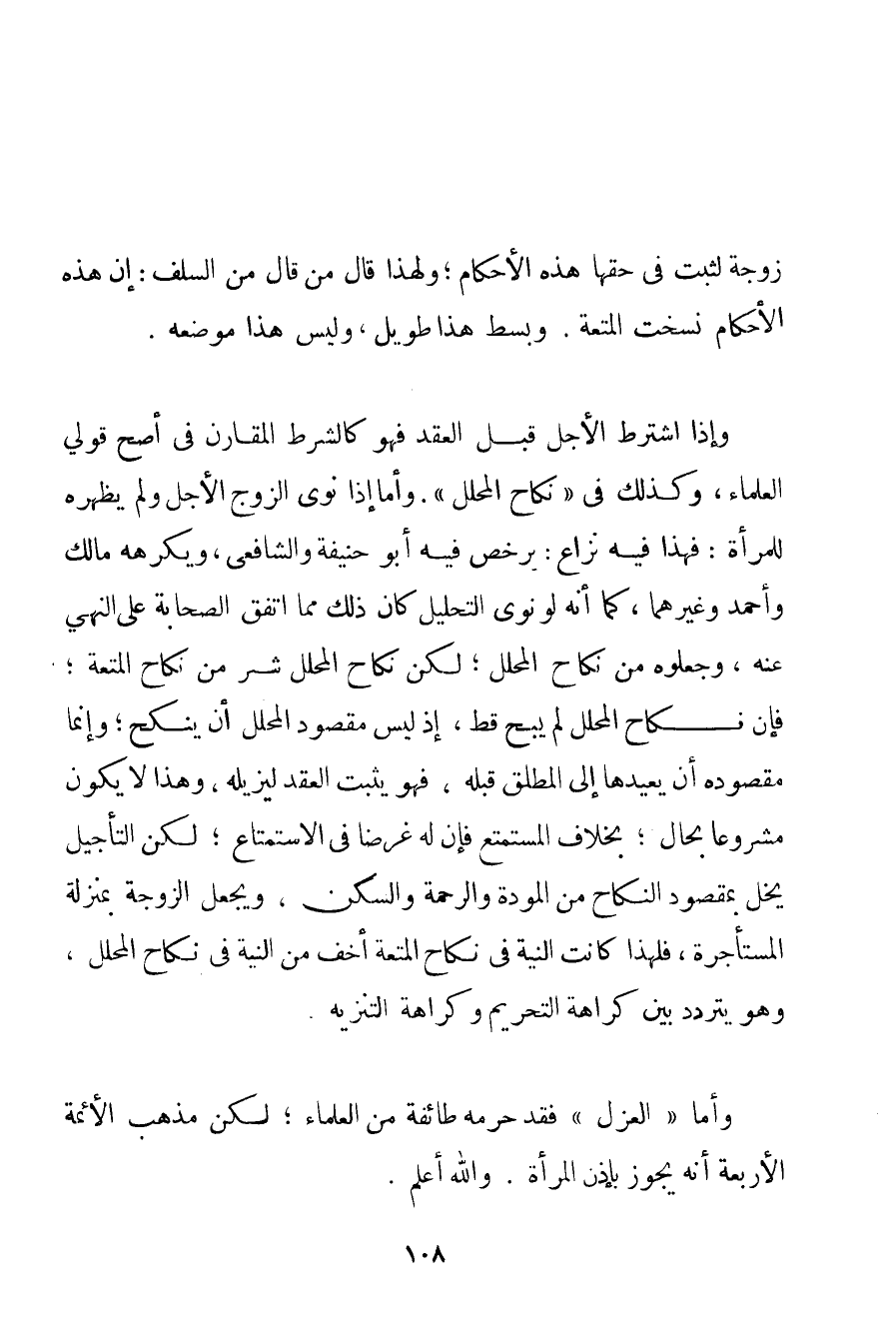 زَوْجَةً لَثَبَتَ فِي حَقِّهَا هَذِهِ الْأَحْكَامُ؛ وَلِهَذَا قَالَ مَنْ قَالَ مِنْ السَّلَفِ: إنَّ هَذِهِ الْأَحْكَامَ نَسَخَتْ الْمُتْعَةَ. وَبَسْطُ هَذَا طَوِيلٌ وَلَيْسَ هَذَا مَوْضِعَهُ. وَإِذَا اشْتَرَطَ الْأَجَلَ قَبْلَ الْعَقْدِ فَهُوَ كَالشَّرْطِ الْمُقَارِنِ فِي أَصَحِّ قَوْلَيْ الْعُلَمَاءِ وَكَذَلِكَ فِي " نِكَاحِ الْمُحَلِّلِ ". وَأَمَّا إذَا نَوَى الزَّوْجُ الْأَجَلَ وَلَمْ يُظْهِرْهُ لِلْمَرْأَةِ: فَهَذَا فِيهِ نِزَاعٌ: يُرَخِّصُ فِيهِ أَبُو حَنِيفَةَ وَالشَّافِعِيُّ وَيَكْرَهُهُ مَالِكٌ وَأَحْمَد وَغَيْرُهُمَا كَمَا أَنَّهُ لَوْ نَوَى التَّحْلِيلَ كَانَ ذَلِكَ مِمَّا اتَّفَقَ الصَّحَابَةُ عَلَى النَّهْيِ عَنْهُ وَجَعَلُوهُ مِنْ نِكَاحِ الْمُحَلِّلِ؛ لَكِنَّ نِكَاحَ الْمُحَلِّلِ شَرٌّ مِنْ نِكَاحِ الْمُتْعَةِ؛ فَإِنَّ نِكَاحَ الْمُحَلِّلِ لَمْ يُبَحْ قَطُّ إذْ لَيْسَ مَقْصُودُ الْمُحَلِّلِ أَنْ يَنْكِحَ؛ وَإِنَّمَا مَقْصُودُهُ أَنْ يُعِيدَهَا إلَى الْمُطَلِّقِ قَبْلَهُ فَهُوَ يُثْبِتُ الْعَقْدَ لِيُزِيلَهُ وَهَذَا لَا يَكُونُ مَشْرُوعًا بِحَالِ؛ بِخِلَافِ الْمُسْتَمْتِعِ فَإِنَّ لَهُ غَرَضًا فِي الِاسْتِمْتَاعِ؛ لَكِنَّ التَّأْجِيلَ يُخِلُّ بِمَقْصُودِ النِّكَاحِ مِنْ الْمَوَدَّةِ وَالرَّحْمَةِ وَالسَّكَنِ وَيَجْعَلُ الزَّوْجَةَ بِمَنْزِلَةِ الْمُسْتَأْجَرَةِ فَلِهَذَا كَانَتْ النِّيَّةُ فِي نِكَاحِ الْمُتْعَةِ أَخَفَّ مِنْ النِّيَّةِ فِي نِكَاحِ الْمُحَلِّلِ وَهُوَ يَتَرَدَّدُ بَيْنَ كَرَاهَةِ التَّحْرِيمِ وَكَرَاهَةِ التَّنْزِيهِ. وَأَمَّا " الْعَزْلُ " فَقَدْ حَرَّمَهُ طَائِفَةٌ مِنْ الْعُلَمَاءِ؛ لَكِنَّ مَذْهَبَ الْأَئِمَّةِ الْأَرْبَعَةِ أَنَّهُ يَجُوزُ بِإِذْنِ الْمَرْأَةِ. وَاَللَّهُ أَعْلَمُ.