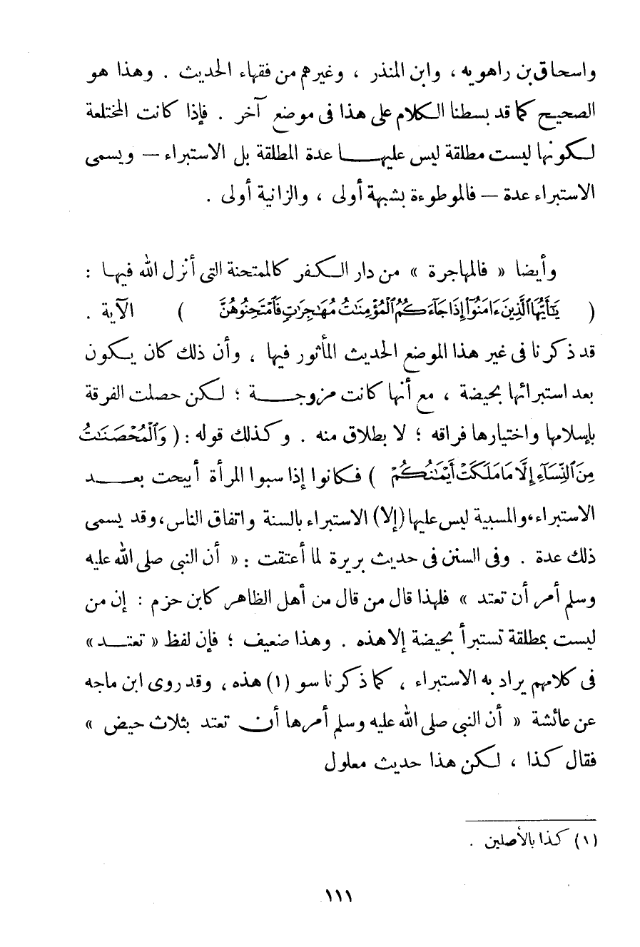 وَإِسْحَاقَ بْنِ رَاهَوَيْه وَابْنِ الْمُنْذِرِ وَغَيْرِهِمْ مِنْ فُقَهَاءِ الْحَدِيثِ. وَهَذَا هُوَ الصَّحِيحُ كَمَا قَدْ بَسَطْنَا الْكَلَامَ عَلَى هَذَا فِي مَوْضِعٍ آخَرَ. فَإِذَا كَانَتْ الْمُخْتَلِعَةُ لِكَوْنِهَا لَيْسَتْ مُطَلَّقَةً لَيْسَ عَلَيْهَا عِدَّةُ الْمُطَلَّقَةِ بَلْ الِاسْتِبْرَاءُ - وَيُسَمَّى الِاسْتِبْرَاءُ عِدَّةً - فَالْمَوْطُوءَةُ بِشُبْهَةِ أَوْلَى وَالزَّانِيَةُ أَوْلَى. وَأَيْضًا " فَالْمُهَاجِرَةُ " مِنْ دَارِ الْكُفْرِ كَالْمُمْتَحَنَةِ الَّتِي أَنْزَلَ اللَّهُ فِيهَا: {يَا أَيُّهَا الَّذِينَ آمَنُوا إذَا جَاءَكُمُ الْمُؤْمِنَاتُ مُهَاجِرَاتٍ فَامْتَحِنُوهُنَّ} الْآيَةَ. قَدْ ذَكَرْنَا فِي غَيْرِ هَذَا الْمَوْضِعِ الْحَدِيثَ الْمَأْثُورَ فِيهَا وَأَنَّ ذَلِكَ كَانَ يَكُونُ بَعْدَ اسْتِبْرَائِهَا بِحَيْضَةِ مَعَ أَنَّهَا كَانَتْ مُزَوَّجَةً؛ لَكِنْ حَصَلَتْ الْفُرْقَةُ بِإِسْلَامِهَا وَاخْتِيَارِهَا فِرَاقَهُ؛ لَا بِطَلَاقِ مِنْهُ. وَكَذَلِكَ قَوْلُهُ: {وَالْمُحْصَنَاتُ مِنَ النِّسَاءِ إلَّا مَا مَلَكَتْ أَيْمَانُكُمْ} فَكَانُوا إذَا سَبَوْا الْمَرْأَةَ أُبِيحَتْ بَعْدَ الِاسْتِبْرَاءِ وَالْمَسْبِيَّةُ لَيْسَ عَلَيْهَا إلَّا الِاسْتِبْرَاءُ بِالسُّنَّةِ وَاتِّفَاقِ النَّاسِ وَقَدْ يُسَمَّى ذَلِكَ عِدَّةً. وَفِي السُّنَنِ فِي حَدِيثِ {بَرِيرَةَ لَمَّا أُعْتِقَتْ: أَنَّ النَّبِيَّ صَلَّى اللَّهُ عَلَيْهِ وَسَلَّمَ أَمَرَ أَنْ تَعْتَدَّ} فَلِهَذَا قَالَ مَنْ قَالَ مِنْ أَهْلِ الظَّاهِرِ كَابْنِ حَزْمٍ: إنَّ مَنْ لَيْسَتْ بِمُطَلَّقَةٍ تُسْتَبْرَأُ بِحَيْضَةِ إلَّا هَذِهِ. وَهَذَا ضَعِيفٌ؛ فَإِنَّ لَفْظَ " تَعْتَدُّ " فِي كَلَامِهِمْ يُرَادُ بِهِ الِاسْتِبْرَاءُ كَمَا ذَكَرْنَا سو (1) وَقَدْ رَوَى ابْن مَاجَه عَنْ عَائِشَةَ {أَنَّ النَّبِيَّ صَلَّى اللَّهُ عَلَيْهِ وَسَلَّمَ أَمَرَهَا أَنْ تَعْتَدَّ بِثَلَاثِ حِيَضٍ} فَقَالَ كَذَا لَكِنَّ هَذَا حَدِيثٌ مَعْلُولٌ