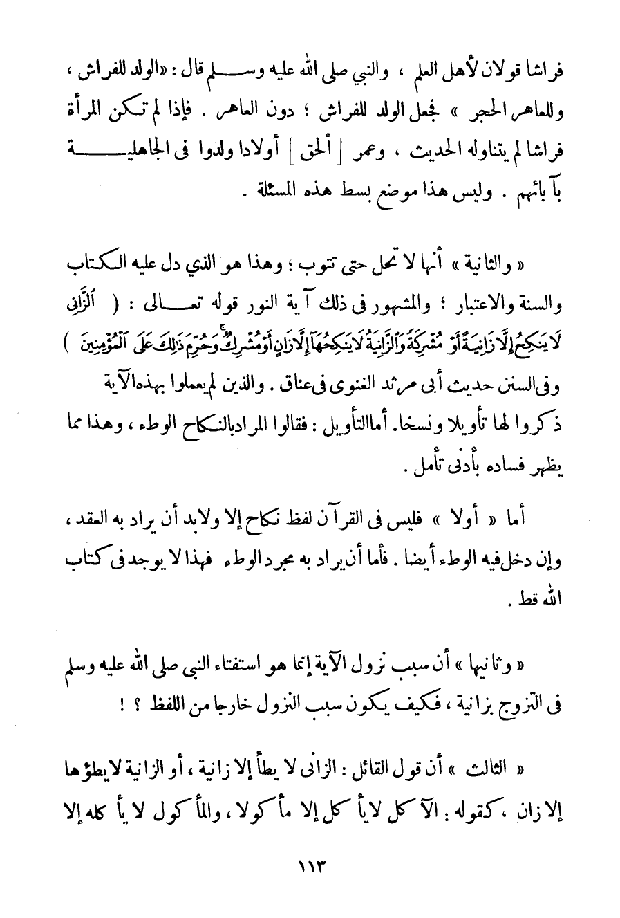 فِرَاشًا قَوْلَانِ لِأَهْلِ الْعِلْمِ وَالنَّبِيُّ صَلَّى اللَّهُ عَلَيْهِ وَسَلَّمَ قَالَ: {الْوَلَدُ لِلْفِرَاشِ وَلِلْعَاهِرِ الْحَجَرُ} فَجَعَلَ الْوَلَدَ لِلْفِرَاشِ؛ دُونَ الْعَاهِرِ. فَإِذَا لَمْ تَكُنْ الْمَرْأَةُ فِرَاشًا لَمْ يَتَنَاوَلْهُ الْحَدِيثُ وَعُمَرُ أَلْحَقَ أَوْلَادًا وُلِدُوا فِي الْجَاهِلِيَّةِ بِآبَائِهِمْ. وَلَيْسَ هَذَا مَوْضِعَ بَسْطِ هَذِهِ الْمَسْأَلَةِ. " وَالثَّانِيَةُ " أَنَّهَا لَا تَحِلُّ حَتَّى تَتُوبَ؛ وَهَذَا هُوَ الَّذِي دَلَّ عَلَيْهِ الْكِتَابُ وَالسُّنَّةُ وَالِاعْتِبَارُ؛ وَالْمَشْهُورُ فِي ذَلِكَ آيَةُ النُّورِ قَوْله تَعَالَى {الزَّانِي لَا يَنْكِحُ إلَّا زَانِيَةً أَوْ مُشْرِكَةً وَالزَّانِيَةُ لَا يَنْكِحُهَا إلَّا زَانٍ أَوْ مُشْرِكٌ وَحُرِّمَ ذَلِكَ عَلَى الْمُؤْمِنِينَ} وَفِي السُّنَنِ حَدِيثُ أَبِي مَرْثَدٍ الغنوي فِي عَنَاقَ. وَاَلَّذِينَ لَمْ يَعْمَلُوا بِهَذِهِ الْآيَةِ ذَكَرُوا لَهَا تَأْوِيلًا وَنَسْخًا. أَمَّا التَّأْوِيلُ: فَقَالُوا الْمُرَادُ بِالنِّكَاحِ الْوَطْءُ وَهَذَا مِمَّا يَظْهَرُ فَسَادُهُ بِأَدْنَى تَأَمُّلٍ. أَمَّا " أَوَّلًا " فَلَيْسَ فِي الْقُرْآنِ لَفْظُ نِكَاحٍ إلَّا وَلَا بُدَّ أَنْ يُرَادَ بِهِ الْعَقْدُ وَإِنْ دَخَلَ فِيهِ الْوَطْءُ أَيْضًا. فَأَمَّا أَنْ يُرَادَ بِهِ مُجَرَّدُ الْوَطْءِ فَهَذَا لَا يُوجَدُ فِي كِتَابِ اللَّهِ قَطُّ. " وَثَانِيهَا " أَنَّ سَبَبَ نُزُولِ الْآيَةِ إنَّمَا هُوَ اسْتِفْتَاءُ النَّبِيِّ صَلَّى اللَّهُ عَلَيْهِ وَسَلَّمَ فِي التَّزَوُّجِ بِزَانِيَةٍ فَكَيْفَ يَكُونُ سَبَبُ النُّزُولِ خَارِجًا مِنْ اللَّفْظِ " الثَّالِثُ " أَنَّ قَوْلَ الْقَائِلِ: الزَّانِي لَا يَطَأُ إلَّا زَانِيَةً أَوْ الزَّانِيَةُ لَا يَطَؤُهَا إلَّا زَانٍ؛ كَقَوْلِهِ: الْآكِلُ لَا يَأْكُلُ إلَّا مَأْكُولًا وَالْمَأْكُولُ لَا يَأْكُلُهُ إلَّا