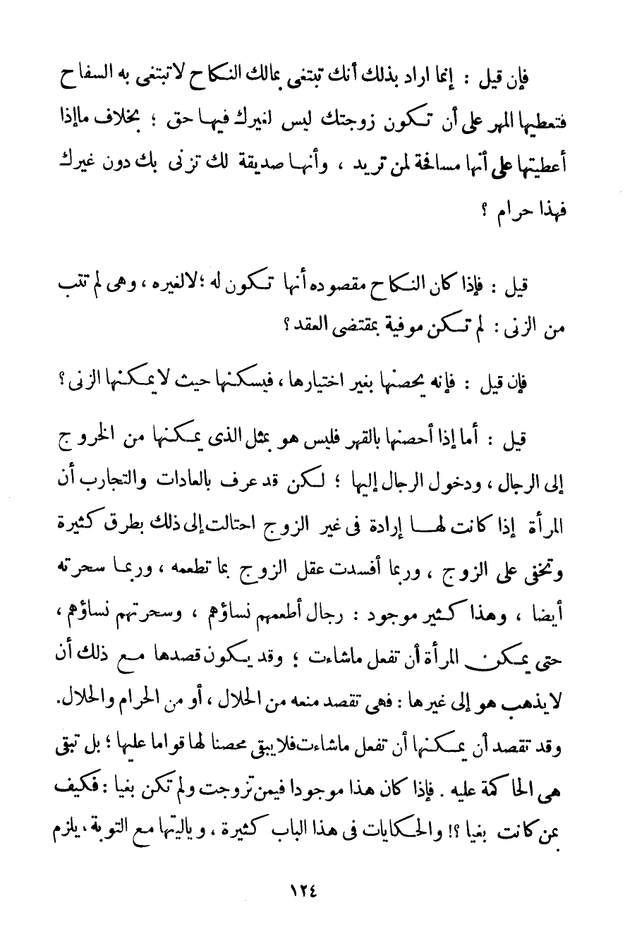 فَإِنْ قِيلَ: إنَّمَا أَرَادَ بِذَلِكَ أَنَّك تَبْتَغِي بِمَالِكِ النِّكَاحِ لَا تَبْتَغِي بِهِ السِّفَاحَ فَتُعْطِيهَا الْمَهْرَ عَلَى أَنْ تَكُونَ زَوْجَتَك لَيْسَ لِغَيْرِك فِيهَا حَقٌّ بِخِلَافِ مَا إذَا أَعْطَيْتهَا عَلَى أَنَّهَا مُسَافِحَةٌ لِمَنْ تُرِيدُ وَأَنَّهَا صَدِيقَةٌ لَك تَزْنِي بِك دُونَ غَيْرِك فَهَذَا حَرَامٌ؟ قِيلَ: فَإِذَا كَانَ النِّكَاحُ مَقْصُودُهُ أَنَّهَا تَكُونُ لَهُ؛ لَا لِغَيْرِهِ وَهِيَ لَمْ تَتُبْ مِنْ الزِّنَا: لَمْ تَكُنْ مُوفِيَةً بِمُقْتَضَى الْعَقْدِ؟ فَإِنْ قِيلَ: فَإِنَّهُ يُحْصِنُهَا بِغَيْرِ اخْتِيَارِهَا فَيُسْكِنُهَا حَيْثُ لَا يُمْكِنُهَا الزِّنَا؟ قِيلَ: أَمَّا إذَا أَحْصَنَهَا بِالْقَهْرِ فَلَيْسَ هُوَ بِمِثْلِ الَّذِي يُمَكِّنُهَا مِنْ الْخُرُوجِ إلَى الرِّجَالِ وَدُخُولِ الرِّجَالِ إلَيْهَا؛ لَكِنْ قَدْ عُرِفَ بِالْعَادَاتِ وَالتَّجَارِبِ أَنَّ الْمَرْأَة إذَا كَانَتْ لَهَا إرَادَةٌ فِي غَيْرِ الزَّوْجِ احْتَالَتْ إلَى ذَلِكَ بِطُرُقِ كَثِيرَةٍ وَتَخْفَى عَلَى الزَّوْجِ وَرُبَّمَا أَفْسَدَتْ عَقْلَ الزَّوْجِ بِمَا تُطْعِمُهُ وَرُبَّمَا سَحَرَتْهُ أَيْضًا وَهَذَا كَثِيرٌ مَوْجُودٌ: رِجَالٌ أَطْعَمَهُمْ نِسَاؤُهُمْ وَسَحَرَتْهُمْ نِسَاؤُهُمْ حَتَّى يُمْكِنَ الْمَرْأَةَ أَنْ تَفْعَلَ مَا شَاءَتْ؛ وَقَدْ يَكُونُ قَصْدُهَا مَعَ ذَلِكَ أَنْ لَا يَذْهَبَ هُوَ إلَى غَيْرِهَا؛ فَهِيَ تَقْصِدُ مَنْعَهُ مِنْ الْحَلَالِ أَوْ مِنْ الْحَرَامِ وَالْحَلَالِ. وَقَدْ تَقْصِدُ أَنْ يُمَكِّنَهَا أَنْ تَفْعَلَ مَا شَاءَتْ فَلَا يَبْقَى مُحْصِنًا لَهَا قَوَّامًا عَلَيْهَا؛ بَلْ تَبْقَى هِيَ الْحَاكِمَةُ عَلَيْهِ. فَإِذَا كَانَ هَذَا مَوْجُودًا فِيمَنْ تَزَوَّجَتْ وَلَمْ تَكُنْ بَغِيًّا: فَكَيْفَ بِمَنْ كَانَتْ بَغِيًّا؟ وَالْحِكَايَاتُ فِي هَذَا الْبَابِ كَثِيرَةٌ. وَيَا لَيْتَهَا مَعَ التَّوْبَةِ يَلْزَمُ