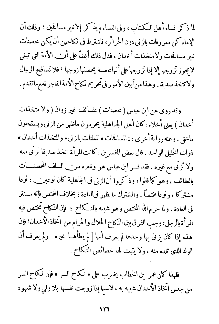 لَمَّا ذَكَرَ نِسَاءَ أَهْلِ الْكِتَابِ وَفِي النِّسَاءِ لَمْ يَذْكُرْ إلَّا غَيْرَ مُسَافِحِينَ؛ وَذَلِكَ أَنَّ الْإِمَاءَ كُنَّ مَعْرُوفَاتٍ بِالزِّنَا دُونَ الْحَرَائِرِ فَاشْتَرَطَ فِي نِكَاحِهِنَّ أَنْ يَكُنَّ مُحْصَنَاتٍ غَيْرَ مُسَافِحَاتٍ وَلَا مُتَّخِذَاتِ أَخْدَانٍ فَدَلَّ ذَلِكَ أَيْضًا عَلَى أَنَّ الْأَمَةَ الَّتِي تَبْغِي لَا يَجُوزُ تَزَوُّجُهَا إلَّا إذَا تَزَوَّجَهَا عَلَى أَنَّهَا مُحْصَنَةٌ يُحْصِنُهَا زَوْجُهَا فَلَا تُسَافِحُ الرِّجَالَ وَلَا تَتَّخِذُ صَدِيقًا. وَهَذَا مِنْ أَبْيَنِ الْأُمُورِ فِي تَحْرِيمِ نِكَاحِ الْأَمَةِ الْفَاجِرَةِ مَعَ مَا تَقَدَّمَ. وَقَدْ رُوِيَ عَنْ ابْنِ عَبَّاسٍ {مُحْصَنَاتٍ} عَفَائِفُ غَيْرُ زَوَانٍ {وَلَا مُتَّخِذَاتِ أَخْدَانٍ} يَعْنِي أَخِلَّاءَ: كَانَ أَهْلُ الْجَاهِلِيَّةِ يُحَرِّمُونَ مَا ظَهَرَ مِنْ الزِّنَا وَيَسْتَحِلُّونَ مَا خَفِيَ. وَعَنْهُ رِوَايَةٌ أُخْرَى: " الْمُسَافِحَاتُ " الْمُعْلِنَاتُ بِالزِّنَا " وَالْمُتَّخِذَاتُ أَخْدَانٍ " ذَوَاتُ الْخَلِيلِ الْوَاحِدِ. قَالَ بَعْضُ الْمُفَسِّرِينَ: كَانَتْ الْمَرْأَةُ تَتَّخِذُ صَدِيقًا تَزْنِي مَعَهُ وَلَا تَزْنِي مَعَ غَيْرِهِ. فَقَدْ فَسَّرَ ابْنُ عَبَّاسٍ هُوَ وَغَيْرُهُ مِنْ السَّلَفِ الْمُحْصَنَاتِ بِالْعَفَائِفِ وَهُوَ كَمَا قَالُوا وَذَكَرُوا أَنَّ الزِّنَا فِي الْجَاهِلِيَّةِ كَانَ نَوْعَيْنِ: نَوْعًا مُشْتَرِكًا وَنَوْعًا مُخْتَصًّا. وَالْمُشْتَرِكُ مَا يَظْهَرُ فِي الْعَادَةِ؛ بِخِلَافِ الْمُخْتَصِّ فَإِنَّهُ مُسْتَتِرٌ فِي الْعَادَةِ. وَلَمَّا حَرَّمَ اللَّهُ الْمُخْتَصَّ وَهُوَ شَبِيهٌ بِالنِّكَاحِ؛ فَإِنَّ النِّكَاحَ تَخْتَصُّ فِيهِ الْمَرْأَةُ بِالرَّجُلِ: وَجَبَ الْفَرْقُ بَيْنَ النِّكَاحِ الْحَلَالِ وَالْحَرَامِ مِنْ اتِّخَاذِ الْأَخْدَانِ؛ فَإِنَّ هَذِهِ إذَا كَانَ يَزْنِي بِهَا وَحْدَهَا لَمْ يَعْرِفْ أَنَّهَا لَمْ يَطَأْهَا غَيْرُهُ وَلَمْ يَعْرِفْ أَنَّ الْوَلَدَ الَّذِي تَلِدُهُ مِنْهُ وَلَا يَثْبُتُ لَهَا خَصَائِصُ النِّكَاحِ.
