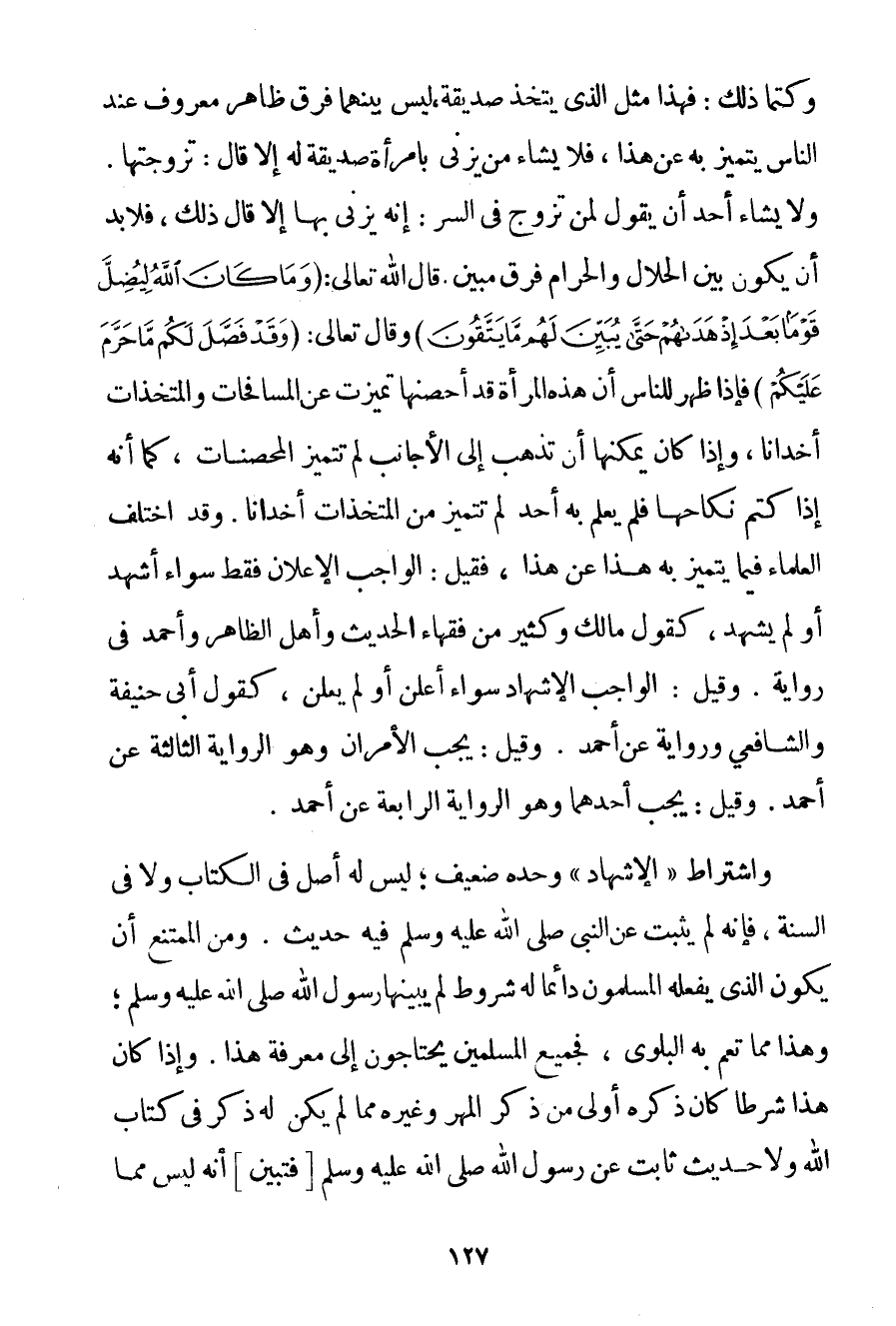 وَكَتَمَا ذَلِكَ: فَهَذَا مِثْلُ الَّذِي يَتَّخِذُ صَدِيقَةً لَيْسَ بَيْنَهُمَا فَرْقٌ ظَاهِرٌ مَعْرُوفٌ عِنْدَ النَّاسِ يَتَمَيَّزُ بِهِ عَنْ هَذَا فَلَا يَشَاءُ مَنْ يَزْنِي بِأَمَرَةِ صَدِيقَةٍ لَهُ إلَّا قَالَ: تَزَوَّجْتهَا. وَلَا يَشَاءُ أَحَدٌ أَنْ يَقُولَ لِمَنْ تَزَوَّجَ فِي السِّرِّ: إنَّهُ يَزْنِي بِهَا إلَّا قَالَ ذَلِكَ فَلَا بُدَّ أَنْ يَكُونَ بَيْنَ الْحَلَالِ وَالْحَرَامِ فَرْقٌ مُبِينٌ قَالَ اللَّهُ تَعَالَى: {وَمَا كَانَ اللَّهُ لِيُضِلَّ قَوْمًا بَعْدَ إذْ هَدَاهُمْ حَتَّى يُبَيِّنَ لَهُمْ مَا يَتَّقُونَ} وَقَالَ تَعَالَى: {وَقَدْ فَصَّلَ لَكُمْ مَا حَرَّمَ عَلَيْكُمْ} فَإِذَا ظَهَرَ لِلنَّاسِ أَنَّ هَذِهِ الْمَرْأَةَ قَدْ أَحْصَنَهَا تَمَيَّزَتْ عَنْ الْمُسَافِحَاتِ وَالْمُتَّخِذَاتِ أَخْدَانًا وَإِذَا كَانَ يُمَكِّنُهَا أَنْ تَذْهَبَ إلَى الْأَجَانِبِ لَمْ تَتَمَيَّزْ الْمُحْصَنَاتُ كَمَا أَنَّهُ إذَا كَتَمَ نِكَاحَهَا فَلَمْ يَعْلَمْ بِهِ أَحَدٌ لَمْ تَتَمَيَّزْ مِنْ الْمُتَّخِذَاتِ أَخْدَانًا. وَقَدْ اخْتَلَفَ الْعُلَمَاءُ فِيمَا يَتَمَيَّزُ بِهِ هَذَا عَنْ هَذَا فَقِيلَ: الْوَاجِبُ الْإِعْلَانُ فَقَطْ سَوَاءٌ أَشْهَدَ أَوْ لَمْ يُشْهِدْ كَقَوْلِ مَالِكٍ وَكَثِيرٍ مِنْ فُقَهَاءِ الْحَدِيثِ وَأَهْلِ الظَّاهِرِ وَأَحْمَد فِي رِوَايَةٍ. وَقِيلَ: الْوَاجِبُ الْإِشْهَادُ سَوَاءٌ أَعْلَنَ أَوْ لَمْ يُعْلِنْ كَقَوْلِ أَبِي حَنِيفَةَ وَالشَّافِعِيِّ وَرِوَايَةٍ عَنْ أَحْمَد. وَقِيلَ: يَجِبُ الْأَمْرَانِ وَهُوَ الرِّوَايَةُ الثَّالِثَةُ عَنْ أَحْمَد. وَقِيلَ: يَجِبُ أَحَدُهُمَا وَهُوَ الرِّوَايَةُ الرَّابِعَةُ عَنْ أَحْمَد. وَاشْتِرَاطُ " الْإِشْهَادِ " وَحْدَهُ ضَعِيفٌ؛ لَيْسَ لَهُ أَصْلٌ فِي الْكِتَابِ وَلَا فِي السُّنَّةِ فَإِنَّهُ لَمْ يَثْبُتْ عَنْ النَّبِيِّ صَلَّى اللَّهُ عَلَيْهِ وَسَلَّمَ فِيهِ حَدِيثٌ. وَمِنْ الْمُمْتَنِعِ أَنْ يَكُونَ الَّذِي يَفْعَلُهُ الْمُسْلِمُونَ دَائِمًا لَهُ شُرُوطٌ لَمْ يُبَيِّنْهَا رَسُولُ اللَّهِ صَلَّى اللَّهُ عَلَيْهِ وَسَلَّمَ وَهَذَا مِمَّا تَعُمُّ بِهِ الْبَلْوَى فَجَمِيعُ الْمُسْلِمِينَ يَحْتَاجُونَ إلَى مَعْرِفَةِ هَذَا. وَإِذَا كَانَ هَذَا شَرْطًا كَانَ ذِكْرُهُ أَوْلَى مِنْ ذِكْرِ الْمَهْرِ وَغَيْرِهِ مِمَّا لَمْ يَكُنْ لَهُ ذِكْرٌ فِي كِتَابِ اللَّهِ وَلَا حَدِيثٍ ثَابِتٍ عَنْ رَسُولِ اللَّهِ صَلَّى اللَّهُ عَلَيْهِ وَسَلَّمَ فَتَبَيَّنَ أَنَّهُ لَيْسَ مِمَّا