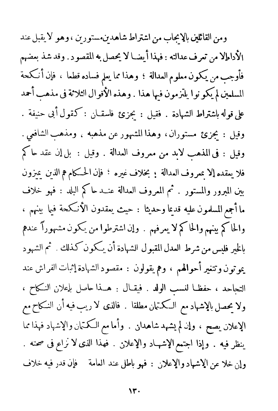 وَمِنْ الْقَائِلِينَ بِالْإِيجَابِ مِنْ اشْتِرَاطِ شَاهِدَيْنِ مَسْتُورَيْنِ وَهُوَ لَا يَقْبَلُ عِنْدَ الْأَدَاءِ إلَّا مَنْ تُعْرَفُ عَدَالَتُهُ: فَهَذَا أَيْضًا لَا يَحْصُلُ بِهِ الْمَقْصُودُ. وَقَدْ شَذَّ بَعْضُهُمْ فَأَوْجَبَ مَنْ يَكُونُ مَعْلُومَ الْعَدَالَةِ؛ وَهَذَا مِمَّا يُعْلَمُ فَسَادُهُ قَطْعًا فَإِنَّ أَنْكِحَةَ الْمُسْلِمِينَ لَمْ يَكُونُوا يَلْتَزِمُونَ فِيهَا هَذَا. وَهَذِهِ الْأَقْوَالُ الثَّلَاثَةُ فِي مَذْهَبِ أَحْمَد عَلَى قَوْلِهِ بِاشْتِرَاطِ الشَّهَادَةِ. فَقِيلَ: يُجْزِئُ فَاسِقَانِ: كَقَوْلِ أَبِي حَنِيفَةَ. وَقِيلَ: يُجْزِئُ مَسْتُورَانِ وَهَذَا الْمَشْهُورُ عَنْ مَذْهَبِهِ وَمَذْهَبِ الشَّافِعِيِّ. وَقِيلَ: فِي الْمَذْهَبِ لَا بُدَّ مِنْ مَعْرُوفِ الْعَدَالَةِ. وَقِيلَ: بَلْ إنْ عَقَدَ حَاكِمٌ فَلَا يَعْقِدُهُ إلَّا بِمَعْرُوفِ الْعَدَالَةِ بِخِلَافِ غَيْرِهِ؛ فَإِنَّ الْحُكَّامَ هُمْ الَّذِينَ يُمَيِّزُونَ بَيْنَ الْمَبْرُورِ وَالْمَسْتُورِ. ثُمَّ الْمَعْرُوفُ الْعَدَالَةِ عِنْدَ حَاكِمِ الْبَلَدِ: فَهُوَ خِلَافُ مَا أَجْمَعَ الْمُسْلِمُونَ عَلَيْهِ قَدِيمًا وَحَدِيثًا: حَيْثُ يَعْقِدُونَ الْأَنْكِحَةَ فِيمَا بَيْنَهُمْ وَالْحَاكِمُ بَيْنَهُمْ وَالْحَاكِمُ لَا يَعْرِفُهُمْ. وَإِنْ اشْتَرَطُوا مَنْ يَكُونُ مَشْهُورًا عِنْدَهُمْ بِالْخَيْرِ فَلَيْسَ مِنْ شَرْطِ الْعَدْلِ لِمَقْبُولِ الشَّهَادَةَ أَنْ يَكُونَ كَذَلِكَ. ثُمَّ الشُّهُودُ يَمُوتُونَ وَتَتَغَيَّرُ أَحْوَالُهُمْ وَهُمْ يَقُولُونَ: مَقْصُودُ الشَّهَادَةِ إثْبَاتُ الْفِرَاشِ عِنْدَ التجاحد حِفْظًا لِنَسَبِ الْوَلَدِ. فَيُقَالُ: هَذَا حَاصِلٌ بِإِعْلَانِ النِّكَاحِ وَلَا يَحْصُلُ بِالْإِشْهَادِ مَعَ الْكِتْمَانِ مُطْلَقًا. فَاَلَّذِي لَا رَيْبَ فِيهِ أَنَّ النِّكَاحَ مَعَ الْإِعْلَانِ يَصِحُّ وَإِنْ لَمْ يَشْهَدْ شَاهِدَانِ. وَأَمَّا مَعَ الْكِتْمَانِ وَالْإِشْهَادِ فَهَذَا مِمَّا يُنْظَرُ فِيهِ. وَإِذَا اجْتَمَعَ الْإِشْهَادُ وَالْإِعْلَانُ. فَهَذَا الَّذِي لَا نِزَاعَ فِي صِحَّتِهِ. وَإِنْ خَلَا عَنْ الْإِشْهَادِ وَالْإِعْلَانِ: فَهُوَ بَاطِلٌ عِنْدَ الْعَامَّةِ فَإِنْ قُدِّرَ فِيهِ خِلَافٌ