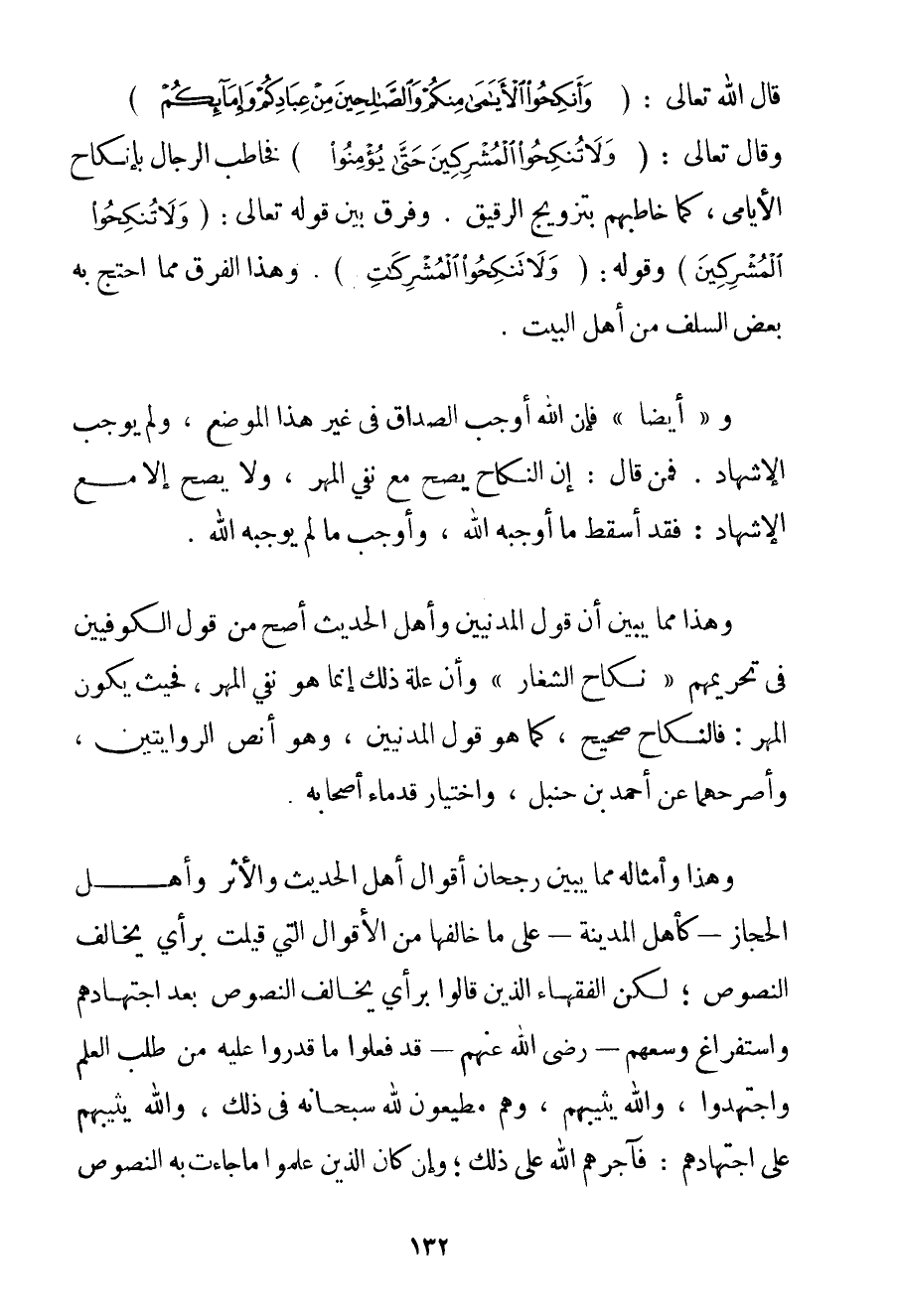 قَالَ اللَّهُ تَعَالَى: {وَأَنْكِحُوا الْأَيَامَى مِنْكُمْ وَالصَّالِحِينَ مِنْ عِبَادِكُمْ وَإِمَائِكُمْ} وَقَالَ تَعَالَى: {وَلَا تُنْكِحُوا الْمُشْرِكِينَ حَتَّى يُؤْمِنُوا} فَخَاطَبَ الرِّجَالَ بِإِنْكَاحِ الْأَيَامَى كَمَا خَاطَبَهُمْ بِتَزْوِيجِ الرَّقِيقِ. وَفَرْقٌ بَيْنَ قَوْله تَعَالَى {وَلَا تُنْكِحُوا الْمُشْرِكِينَ} وَقَوْلِهِ: {وَلَا تَنْكِحُوا الْمُشْرِكَاتِ} . وَهَذَا الْفَرْقُ مِمَّا احْتَجَّ بِهِ بَعْضُ السَّلَفِ مِنْ أَهْلِ الْبَيْتِ. و " أَيْضًا " فَإِنَّ اللَّهَ أَوْجَبَ الصَّدَاقَ فِي غَيْرِ هَذَا الْمَوْضِعِ وَلَمْ يُوجِبْ الْإِشْهَادَ. فَمَنْ قَالَ: إنَّ النِّكَاحَ يَصِحُّ مَعَ نَفْيِ الْمَهْرِ وَلَا يَصِحُّ إلَّا مَعَ الْإِشْهَادِ: فَقَدْ أَسْقَطَ مَا أَوْجَبَهُ اللَّهُ وَأَوْجَبَ مَا لَمْ يُوجِبْهُ اللَّهُ. وَهَذَا مِمَّا يُبَيِّنُ أَنَّ قَوْلَ الْمَدَنِيِّينَ وَأَهْلِ الْحَدِيثِ أَصَحُّ مِنْ قَوْلِ الْكُوفِيِّينَ فِي تَحْرِيمِهِمْ " نِكَاحَ الشِّغَارِ " وَأَنَّ عِلَّةَ ذَلِكَ إنَّمَا هُوَ نَفْيُ الْمَهْرِ فَحَيْثُ يَكُونُ الْمَهْرُ: فَالنِّكَاحُ صَحِيحٌ كَمَا هُوَ قَوْلُ الْمَدَنِيِّينَ وَهُوَ أَنَصّ الرِّوَايَتَيْنِ وَأَصْرَحُهُمَا عَنْ أَحْمَد بْنِ حَنْبَلٍ وَاخْتِيَارُ قُدَمَاءِ أَصْحَابِهِ. وَهَذَا وَأَمْثَالُهُ مِمَّا يُبَيِّنُ رُجْحَانَ أَقْوَالِ أَهْلِ الْحَدِيثِ وَالْأَثَرِ وَأَهْلِ الْحِجَازِ - كَأَهْلِ الْمَدِينَةِ - عَلَى مَا خَالَفَهَا مِنْ الْأَقْوَالِ الَّتِي قِيلَتْ بِرَأْيٍ يُخَالِفُ النُّصُوصَ؛ لَكِنَّ الْفُقَهَاءَ الَّذِينَ قَالُوا بِرَأْيٍ يُخَالِفُ النُّصُوصَ بَعْدَ اجْتِهَادِهِمْ وَاسْتِفْرَاغِ وُسْعِهِمْ - رَضِيَ اللَّهُ عَنْهُمْ - قَدْ فَعَلُوا مَا قَدَرُوا عَلَيْهِ مِنْ طَلَبِ الْعِلْمِ وَاجْتَهَدُوا وَاَللَّهُ يُثِيبُهُمْ وَهُمْ مُطِيعُونَ لِلَّهِ سُبْحَانَهُ فِي ذَلِكَ وَاَللَّهُ يُثِيبُهُمْ عَلَى اجْتِهَادِهِمْ: فَآجَرَهُمْ اللَّهُ عَلَى ذَلِكَ؛ وَإِنْ كَانَ الَّذِينَ عَلِمُوا مَا جَاءَتْ بِهِ النُّصُوصُ