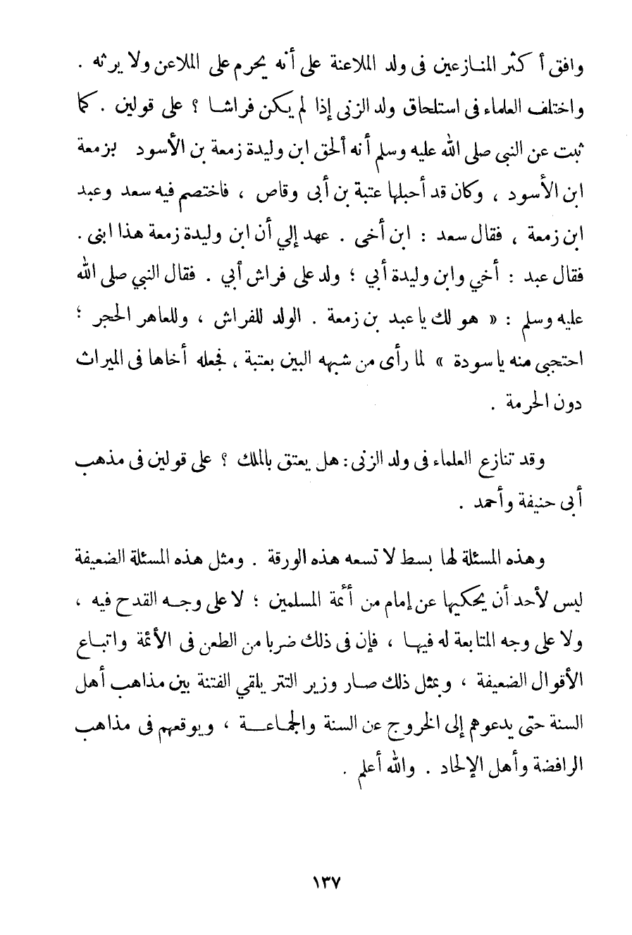وَافَقَ أَكْثَرُ الْمُنَازِعِينَ فِي وَلَدِ الْمُلَاعَنَةِ عَلَى أَنَّهُ يَحْرُمُ عَلَى الْمُلَاعِنِ وَلَا يَرِثُهُ. وَاخْتَلَفَ الْعُلَمَاءُ فِي اسْتِلْحَاقِ وَلَدِ الزِّنَا إذَا لَمْ يَكُنْ فِرَاشًا؟ عَلَى قَوْلَيْنِ. كَمَا ثَبَتَ {عَنْ النَّبِيِّ صَلَّى اللَّهُ عَلَيْهِ وَسَلَّمَ أَنَّهُ أَلْحَقَ ابْنَ وَلِيدَةِ زمعة بْنِ الْأَسْوَدِ بزمعة بْنِ الْأَسْوَدِ وَكَانَ قَدْ أَحْبَلَهَا عتبة بْنُ أَبِي وَقَّاصٍ فَاخْتَصَمَ فِيهِ سَعْدٌ وَعَبْدُ ابْنُ زمعة (*) فَقَالَ سَعْدٌ: ابْنُ أَخِي. عَهِدَ إلَيَّ أَنَّ ابْنَ وَلِيدَةِ زمعة هَذَا ابْنِي. فَقَالَ عَبْدٌ: أَخِي وَابْنُ وَلِيدَةِ أَبِي؛ وُلِدَ عَلَى فِرَاشِ أَبِي. فَقَالَ النَّبِيُّ صَلَّى اللَّهُ عَلَيْهِ وَسَلَّمَ هُوَ لَك يَا عَبْدُ بْنَ زمعة. الْوَلَدُ لِلْفِرَاشِ وَلِلْعَاهِرِ الْحَجَرُ؛ احْتَجِبِي مِنْهُ يَا سَوْدَةُ} لِمَا رَأَى مِنْ شَبَهِهِ الْبَيِّنِ بعتبة فَجَعَلَهُ أَخَاهَا فِي الْمِيرَاثِ دُونَ الْحُرْمَةِ. وَقَدْ تَنَازَعَ الْعُلَمَاءُ فِي وَلَدِ الزِّنَا: هَلْ يَعْتِقُ بِالْمِلْكِ؟ عَلَى قَوْلَيْنِ فِي مَذْهَبِ أَبِي حَنِيفَةَ وَأَحْمَد. وَهَذِهِ الْمَسْأَلَةُ لَهَا بَسْطٌ لَا تَسَعُهُ هَذِهِ الْوَرَقَةُ. وَمِثْلُ هَذِهِ الْمَسْأَلَةِ الضَّعِيفَةِ لَيْسَ لِأَحَدِ أَنْ يَحْكِيَهَا عَنْ إمَامٍ مِنْ أَئِمَّةِ الْمُسْلِمِينَ؛ لَا عَلَى وَجْهِ الْقَدْحِ فِيهِ وَلَا عَلَى وَجْهِ الْمُتَابَعَةِ لَهُ فِيهَا فَإِنَّ فِي ذَلِكَ ضَرْبًا مِنْ الطَّعْنِ فِي الْأَئِمَّةِ وَاتِّبَاعِ الْأَقْوَالِ الضَّعِيفَةِ وَبِمِثْلِ ذَلِكَ صَارَ وَزِيرُ التتر يُلْقِي الْفِتْنَةَ بَيْنَ مَذَاهِبِ أَهْلِ السُّنَّةِ حَتَّى يَدْعُوَهُمْ إلَى الْخُرُوجِ عَنْ السُّنَّةِ وَالْجَمَاعَةِ وَيُوقِعَهُمْ فِي مَذَاهِبِ الرَّافِضَةِ وَأَهْلِ الْإِلْحَادِ. وَاَللَّهُ أَعْلَمُ.