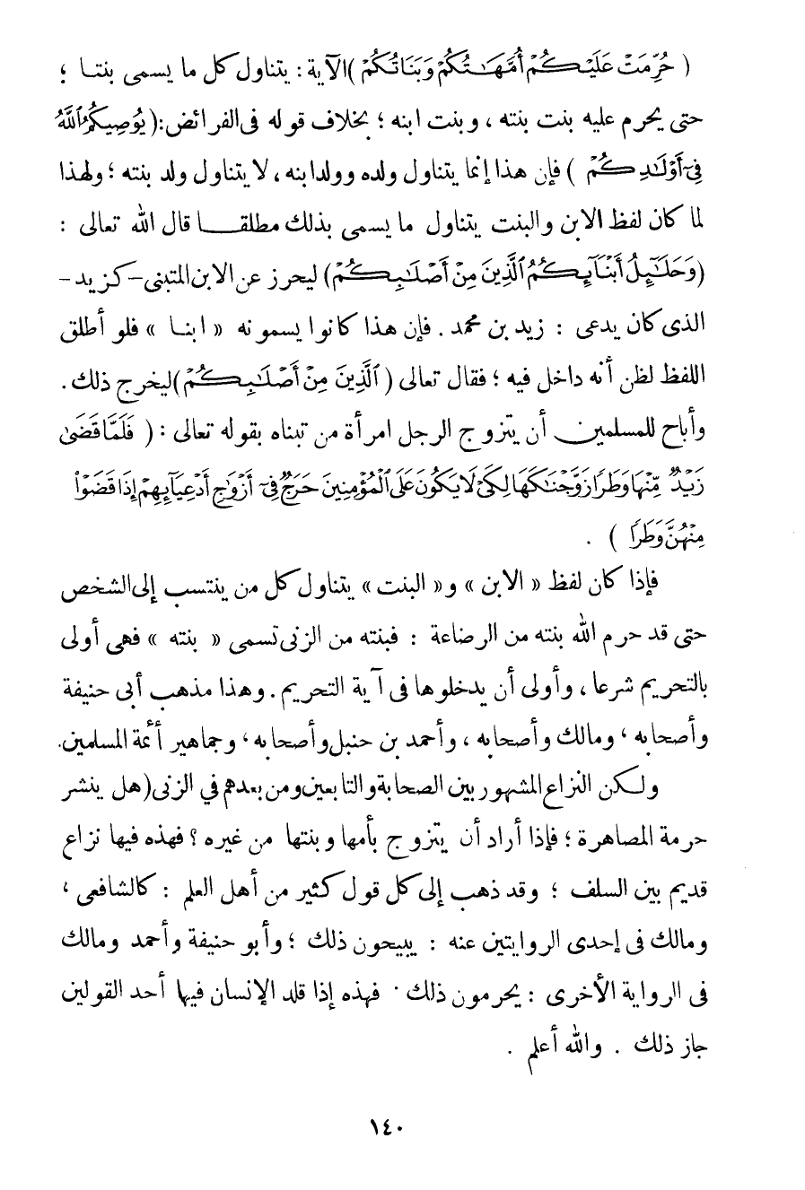{حُرِّمَتْ عَلَيْكُمْ أُمَّهَاتُكُمْ وَبَنَاتُكُمْ} الْآيَةُ: يَتَنَاوَلُ مَا يُسَمَّى بِنْتًا حَتَّى يَحْرُمَ عَلَيْهِ بِنْتُ بِنْتِهِ وَبِنْتُ ابْنِهِ؛ بِخِلَافِ قَوْلِهِ فِي الْفَرَائِضِ: {يُوصِيكُمُ اللَّهُ فِي أَوْلَادِكُمْ} فَإِنَّ هَذَا إنَّمَا يَتَنَاوَلُ وَلَدَهُ وَوَلَدَ ابْنِهِ لَا يَتَنَاوَلُ وَلَدَ بِنْتِهِ؛ وَلِهَذَا لَمَّا كَانَ لَفْظُ الِابْنِ وَالْبِنْتِ يَتَنَاوَلُ مَا يُسَمَّى بِذَلِكَ مُطْلَقًا قَالَ اللَّهُ تَعَالَى: {وَحَلَائِلُ أَبْنَائِكُمُ الَّذِينَ مِنْ أَصْلَابِكُمْ} لِيُحْرِزَ عَنْ الِابْنِ الْمُتَبَنَّى - كَزَيْدِ - الَّذِي كَانَ يُدْعَى: زَيْدَ بْنَ مُحَمَّدٍ. فَإِنَّ هَذَا كَانُوا يُسَمُّونَهُ " ابْنًا " فَلَوْ أَطْلَقَ اللَّفْظَ لَظُنَّ أَنَّهُ دَاخِلٌ فِيهِ؛ فَقَالَ تَعَالَى {الَّذِينَ مِنْ أَصْلَابِكُمْ} لِيُخْرِجَ ذَلِكَ. وَأَبَاحَ لِلْمُسْلِمِينَ أَنْ يَتَزَوَّجَ الرَّجُلُ امْرَأَةَ مَنْ تَبَنَّاهُ بِقَوْلِهِ تَعَالَى: {فَلَمَّا قَضَى زَيْدٌ مِنْهَا وَطَرًا زَوَّجْنَاكَهَا لِكَيْ لَا يَكُونَ عَلَى الْمُؤْمِنِينَ حَرَجٌ فِي أَزْوَاجِ أَدْعِيَائِهِمْ إذَا قَضَوْا مِنْهُنَّ وَطَرًا} . فَإِذَا كَانَ لَفْظُ " الِابْنِ " و " الْبِنْتِ " يَتَنَاوَلُ كُلَّ مَنْ يَنْتَسِبُ إلَى الشَّخْصِ حَتَّى قَدْ حَرَّمَ اللَّهُ بِنْتَهُ مِنْ الرَّضَاعَةِ: فَبِنْتُهُ مِنْ الزِّنَا تُسَمَّى " بِنْتَه " فَهِيَ أَوْلَى بِالتَّحْرِيمِ شَرْعًا وَأَوْلَى أَنْ يُدْخِلُوهَا فِي آيَةِ التَّحْرِيمِ. وَهَذَا مَذْهَبُ أَبِي حَنِيفَةَ وَأَصْحَابِهِ وَمَالِكٍ وَأَصْحَابِهِ وَأَحْمَد بْنِ حَنْبَلٍ وَأَصْحَابِهِ وَجَمَاهِيرِ أَئِمَّةِ الْمُسْلِمِينَ وَلَكِنَّ النِّزَاعَ الْمَشْهُورَ بَيْن الصَّحَابَةِ وَالتَّابِعِينَ وَمَنْ بَعْدَهُمْ فِي الزِّنَا هَلْ يَنْشُرُ حُرْمَةَ الْمُصَاهَرَةِ؛ فَإِذَا أَرَادَ أَنْ يَتَزَوَّجَ بِأُمِّهَا وَبِنْتِهَا مِنْ غَيْرِهِ؟ فَهَذِهِ فِيهَا نِزَاعٌ قَدِيمٌ بَيْنَ السَّلَفِ؛ وَقَدْ ذَهَبَ إلَى كُلِّ قَوْلٍ كَثِيرٌ مِنْ أَهْلِ الْعِلْمِ: كَالشَّافِعِيِّ وَمَالِكٍ فِي إحْدَى الرِّوَايَتَيْنِ عَنْهُ: يُبِيحُونَ ذَلِكَ؛ وَأَبُو حَنِيفَةَ وَأَحْمَد وَمَالِكٌ فِي الرِّوَايَةِ الْأُخْرَى: يُحَرِّمُونَ ذَلِكَ. فَهَذِهِ إذَا قَلَّدَ الْإِنْسَانُ فِيهَا أَحَدَ الْقَوْلَيْنِ جَازَ ذَلِكَ. وَاَللَّهُ أَعْلَمُ.