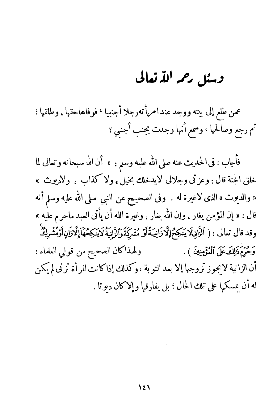 فِي الْحَدِيثِ عَنْهُ صَلَّى اللَّهُ عَلَيْهِ وَسَلَّمَ {أَنَّ اللَّهَ سُبْحَانَهُ وَتَعَالَى لَمَّا خَلَقَ الْجَنَّةَ قَالَ: وَعِزَّتِي وَجَلَالِي لَا يَدْخُلُك بَخِيلٌ وَلَا كَذَّابٌ وَلَا دَيُّوثٌ} " وَالدَّيُّوثُ " الَّذِي لَا غَيْرَةَ لَهُ. وَفِي الصَّحِيحِ عَنْ النَّبِيِّ صَلَّى اللَّهُ عَلَيْهِ وَسَلَّمَ أَنَّهُ قَالَ: {إنَّ الْمُؤْمِنَ يَغَارُ وَإِنَّ اللَّهَ يَغَارُ وَغَيْرَةُ اللَّهِ أَنْ يَأْتِيَ الْعَبْدُ مَا حُرِّمَ عَلَيْهِ} وَقَدّ قَالَ تَعَالَى: {الزَّانِي لَا يَنْكِحُ إلَّا زَانِيَةً أَوْ مُشْرِكَةً وَالزَّانِيَةُ لَا يَنْكِحُهَا إلَّا زَانٍ أَوْ مُشْرِكٌ وَحُرِّمَ ذَلِكَ عَلَى الْمُؤْمِنِينَ} . وَلِهَذَا كَانَ الصَّحِيحُ مِنْ قَوْلَيْ الْعُلَمَاءِ: أَنَّ الزَّانِيَةَ لَا يَجُوزُ تَزَوُّجُهَا إلَّا بَعْدَ التَّوْبَةِ وَكَذَلِكَ إذَا كَانَتْ الْمَرْأَةُ تَزْنِي لَمْ يَكُنْ لَهُ أَنْ يُمْسِكَهَا عَلَى تِلْكَ الْحَالِ بَلْ يُفَارِقُهَا وَإِلَّا كَانَ دَيُّوثًا.