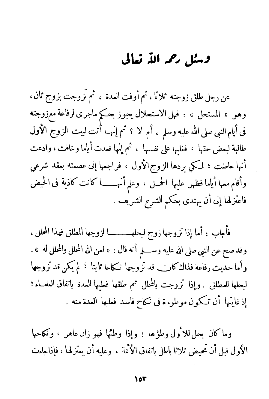 عَنْ رَجُلٍ طَلَّقَ زَوْجَتَهُ ثَلَاثًا ثُمَّ أَوْفَتْ الْعِدَّةَ ثُمَّ تَزَوَّجَتْ بِزَوْجِ ثَانٍ وَهُوَ " الْمُسْتَحِلُّ ": فَهَلْ الِاسْتِحْلَالُ يَجُوزُ بِحُكْمِ مَا جَرَى لِرُفَاعَةِ مَعَ زَوْجَتِهِ فِي أَيَّامِ النَّبِيِّ صَلَّى اللَّهُ عَلَيْهِ وَسَلَّمَ أَمْ لَا؟ ثُمَّ إنَّهَا أَتَتْ لِبَيْتِ الزَّوْجِ الْأَوَّلِ طَالِبَةً لِبَعْضِ حَقِّهَا فَغَلَبَهَا عَلَى نَفْسِهَا ثُمَّ إنَّهَا قَعَدَتْ أَيَّامًا وَخَافَتْ وَادَّعَتْ أَنَّهَا حَاضَتْ؛ لِكَيْ يَرُدَّهَا الزَّوْجُ الْأَوَّلُ فَرَاجَعَهَا إلَى عِصْمَتِهِ بِعَقْدِ شَرْعِيٍّ وَأَقَامَ مَعَهَا أَيَّامًا فَظَهَرَ عَلَيْهَا الْحَمْلُ وَعَلِمَ أَنَّهَا كَانَتْ كَاذِبَةً فِي الْحَيْضِ فَاعْتَزَلَهَا إلَى أَنْ يَهْتَدِيَ بِحُكْمِ الشَّرْعِ الشَّرِيفِ.