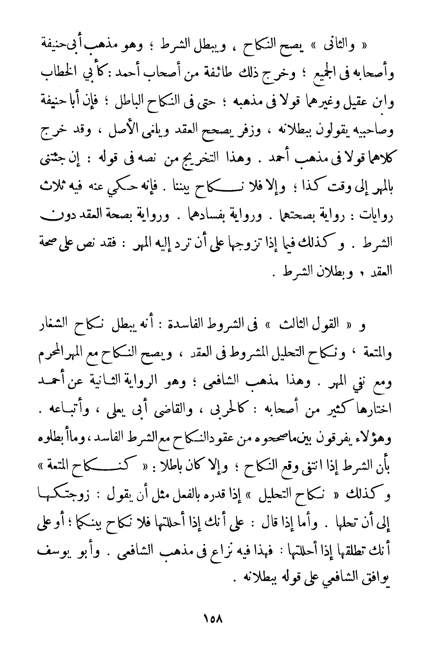 " وَالثَّانِي " يَصِحُّ النِّكَاحُ وَيَبْطُلُ الشَّرْطُ؛ وَهُوَ مَذْهَبُ أَبِي حَنِيفَةَ وَأَصْحَابِهِ فِي الْجَمِيعِ؛ وَخَرَّجَ ذَلِكَ طَائِفَةٌ مِنْ أَصْحَابِ أَحْمَد: كَأَبِي الْخَطَّابِ وَابْنِ عَقِيلٍ وَغَيْرِهِمَا قَوْلًا فِي مَذْهَبِهِ؛ حَتَّى فِي النِّكَاحِ الْبَاطِلِ؛ فَإِنَّ أَبَا حَنِيفَةَ وَصَاحِبَيْهِ يَقُولُونَ بِبُطْلَانِهِ وَزُفَرُ يُصَحِّحُ الْعَقْدَ وَيُلْغِي الْأَصْلَ وَقَدْ خَرَّجَ كِلَاهُمَا قَوْلًا فِي مَذْهَبِ أَحْمَد. وَهَذَا التَّخْرِيجُ مِنْ نَصِّهِ فِي قَوْلِهِ: إنْ جِئْتِنِي بِالْمَهْرِ إلَى وَقْتِ كَذَا؛ وَإِلَّا فَلَا نِكَاحَ بَيْنَنَا. فَإِنَّهُ حُكِيَ عَنْهُ فِيهِ ثَلَاثُ رِوَايَاتٍ: رِوَايَةٌ بِصِحَّتِهِمَا. وَرِوَايَةٌ بِفَسَادِهِمَا. وَرِوَايَةٌ بِصِحَّةِ الْعَقْدِ دُونَ الشَّرْطِ. وَكَذَلِكَ فِيمَا إذَا تَزَوَّجَهَا عَلَى أَنْ تَرُدَّ إلَيْهِ الْمَهْرَ: فَقَدْ نَصَّ عَلَى صِحَّةِ الْعَقْلِ وَبُطْلَانِ الشَّرْطِ. و " الْقَوْلُ الثَّالِثُ " فِي الشُّرُوطِ الْفَاسِدَةِ: أَنَّهُ يَبْطُلُ نِكَاحُ الشِّغَارِ وَالْمُتْعَةِ وَنِكَاحُ التَّحْلِيلِ الْمَشْرُوطُ فِي الْعَقْدِ وَيَصِحُّ النِّكَاحُ مَعَ الْمَهْرِ الْمُحَرَّمِ وَمَعَ نَفْيِ الْمَهْرِ. وَهَذَا مَذْهَبُ الشَّافِعِيِّ؛ وَهُوَ الرِّوَايَةُ الثَّانِيَةُ عَنْ أَحْمَد اخْتَارَهَا كَثِيرٌ مِنْ أَصْحَابِهِ: كَالْحَرْبِيِّ وَالْقَاضِي أَبِي يَعْلَى وَأَتْبَاعِهِ. وَهَؤُلَاءِ يُفَرِّقُونَ بَيْنَ مَا صَحَّحُوهُ مِنْ عُقُودِ النِّكَاحِ مَعَ الشَّرْطِ الْفَاسِدِ وَمَا أَبْطَلُوهُ بِأَنَّ الشَّرْطَ إذَا انْتَفَى وَقَعَ النِّكَاحُ؛ وَإِلَّا كَانَ بَاطِلًا: " كَنِكَاحِ الْمُتْعَةِ " وَكَذَلِكَ " نِكَاحُ التَّحْلِيلِ " إذَا قَدَّرَهُ بِالْفِعْلِ مِثْلَ أَنْ يَقُولَ: زَوَّجْتُكهَا إلَى أَنْ تُحِلَّهَا. وَأَمَّا إذَا قَالَ: عَلَى أَنَّك إذَا أَحْلَلْتهَا فَلَا نِكَاحَ بَيْنَكُمَا؛ أَوْ عَلَى أَنَّك تُطَلِّقَهَا إذَا أَحْلَلْتهَا: فَهَذَا فِيهِ نِزَاعٌ فِي مَذْهَبِ الشَّافِعِيِّ. وَأَبُو يُوسُفَ يُوَافِقُ الشَّافِعِيَّ عَلَى قَوْلِهِ بِبُطْلَانِهِ.
